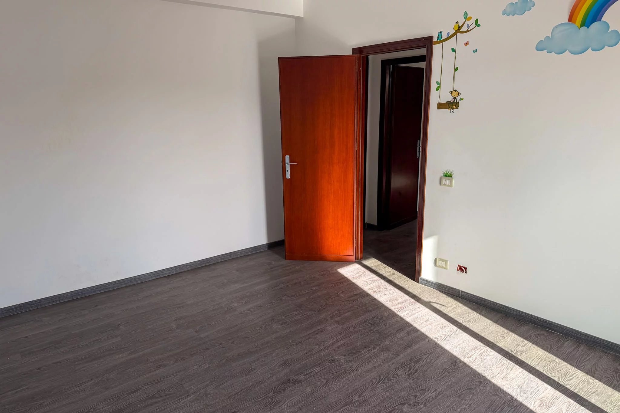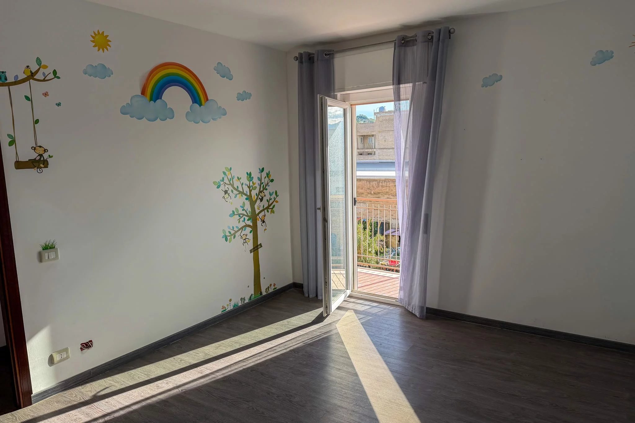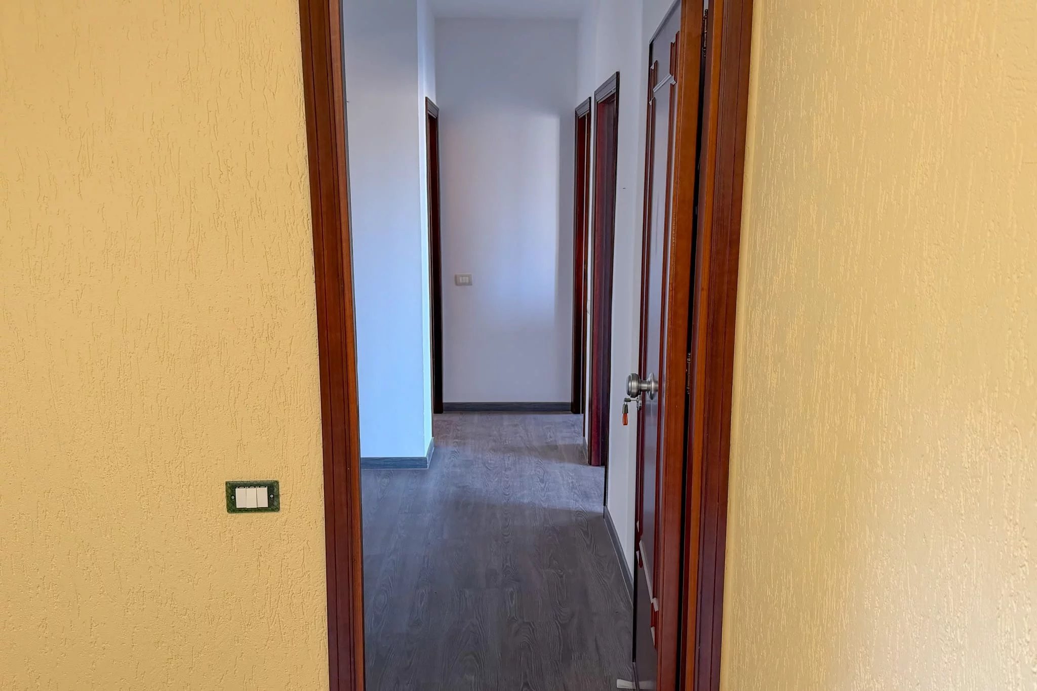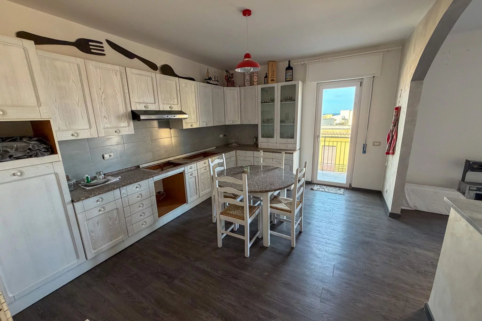 Das herausragende Merkmal ist der kombinierte Wohn- und Essbereich – eine helle 45 m² große Fläche, die durch die Verbindung des 27 m² großen Salons mit der 18 m² großen Küche durch einen breiten Torbogen entstanden ist. Fenstertüren und ein zusätzliches Fenster sind nach Norden zum Meer ausgerichtet und durchfluten den Raum mit natürlichem Licht. Die Küche hat eine eigene Tür zum Südbalkon, der sich perfekt für Mahlzeiten im Freien mit Blick auf den Monte Catalfano eignet.