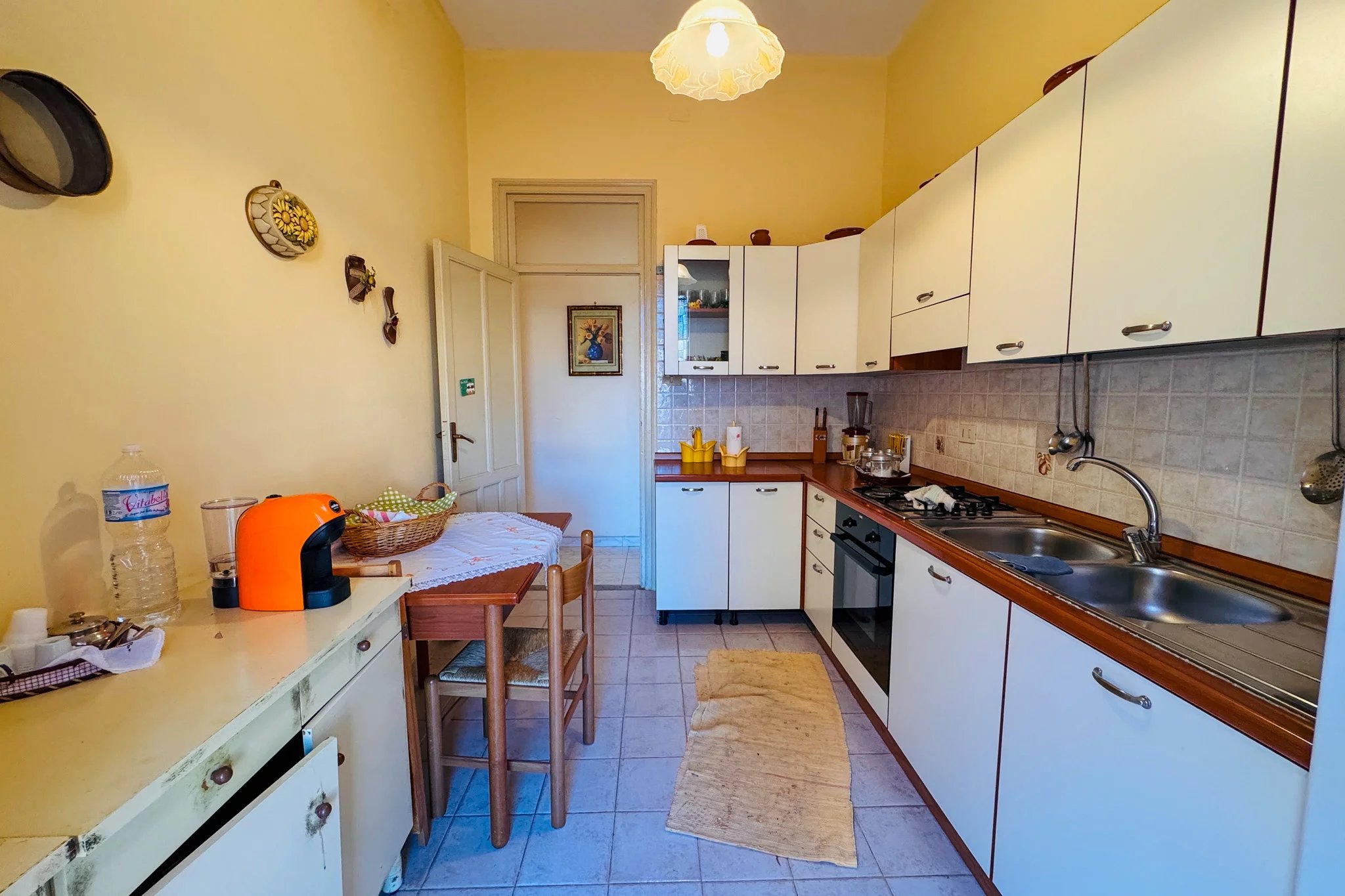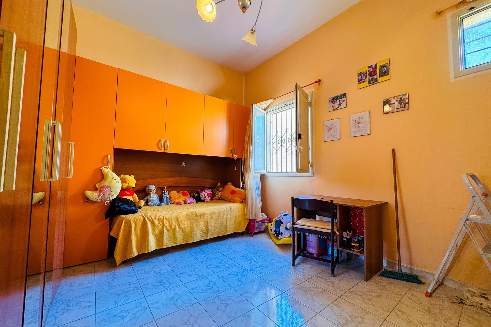 Diese wirklich bezugsfertige Immobilie erfordert keine Renovierungsarbeiten und bietet eine sofortige Bewohnbarkeit, die in dieser Preisklasse selten ist. Ein langer zentraler Flur verbindet zwei großzügige Schlafzimmer (jeweils ca. 16 m²), ein Badezimmer mit Badewanne, das mit sauberen weißen Fliesen ausgestattet ist, und eine geräumige Wohnküche mit direktem Zugang zu einem nach Westen ausgerichteten Balkon mit Blick auf die Kirche von Santa Flavia.
