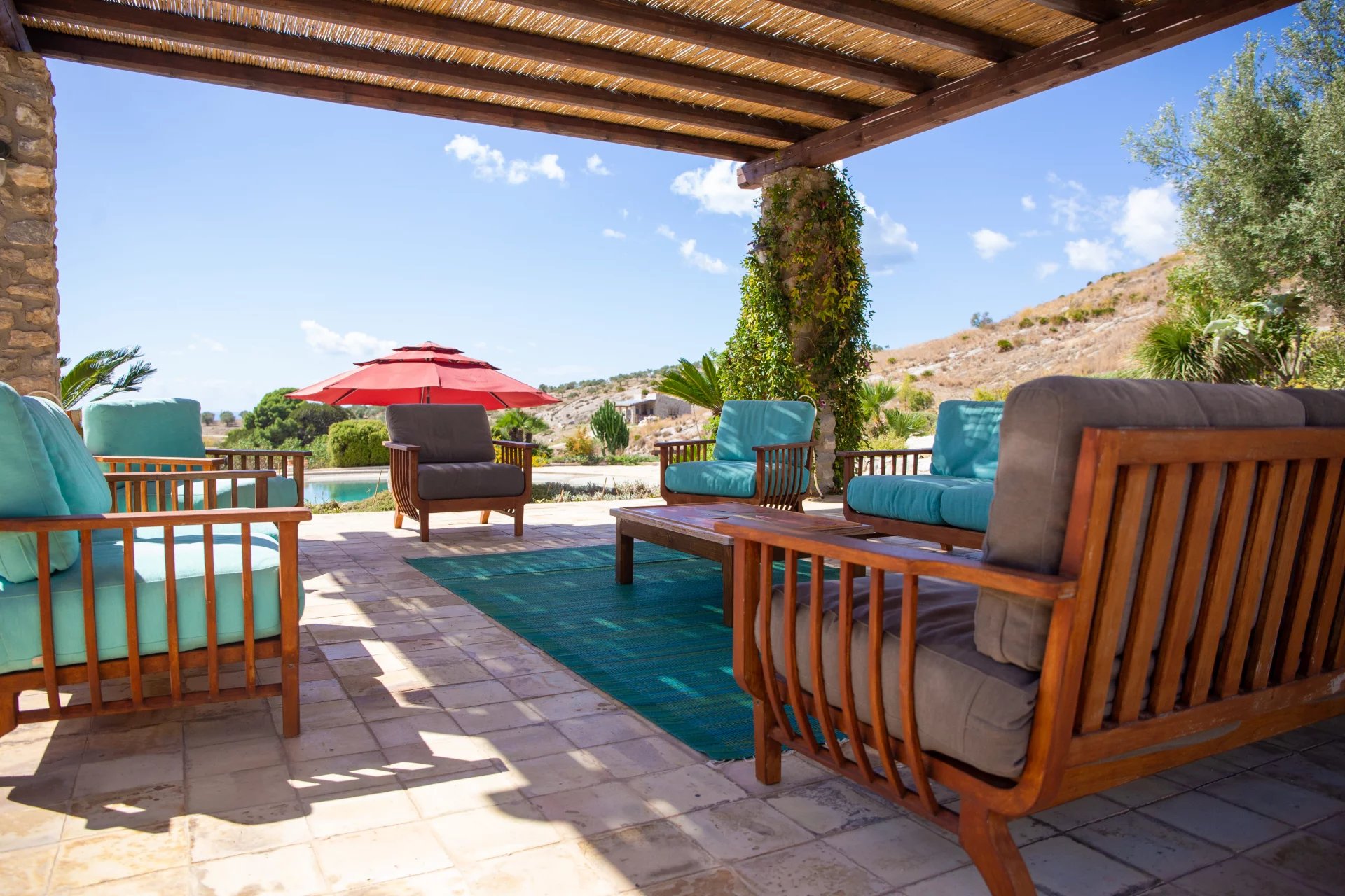 Across the rear patio, the guest house is a lovely stone cottage on two floors, with a bedroom suite upstairs, above a cosy living room. The furnishings and fixtures are very much in keeping with the main villa, including a rustic dining table, comfortable double bed and the modern cubicle shower in the en-suite bathroom. The wooden roof is made with exposed bamboo canes, in the historic style of the region. A Juliet balcony in the bedroom gives a spectacular sea view.