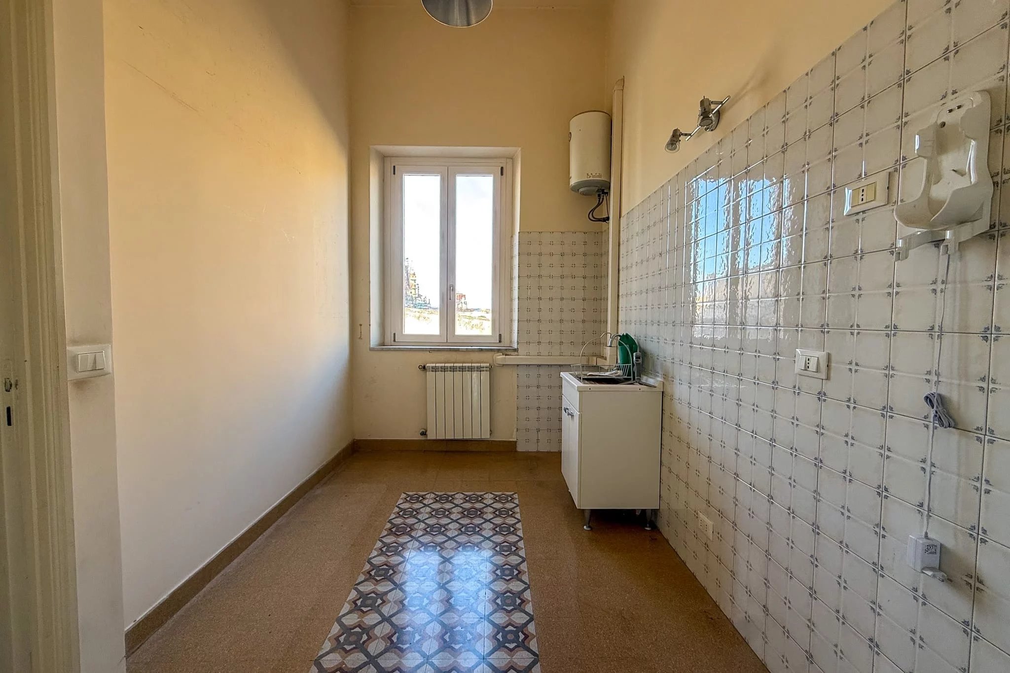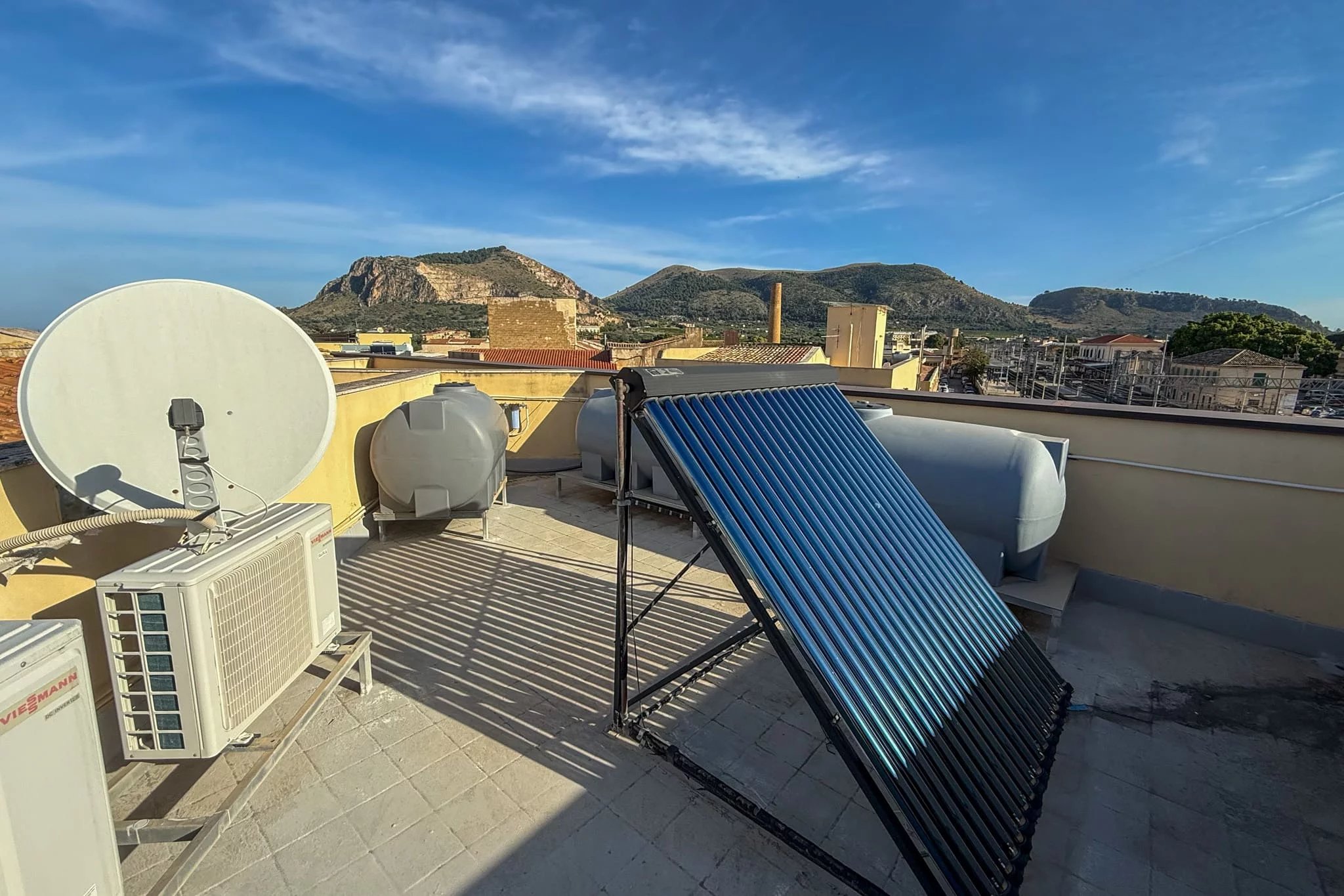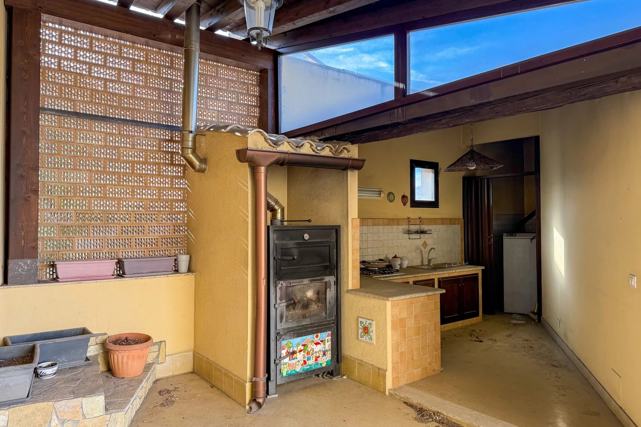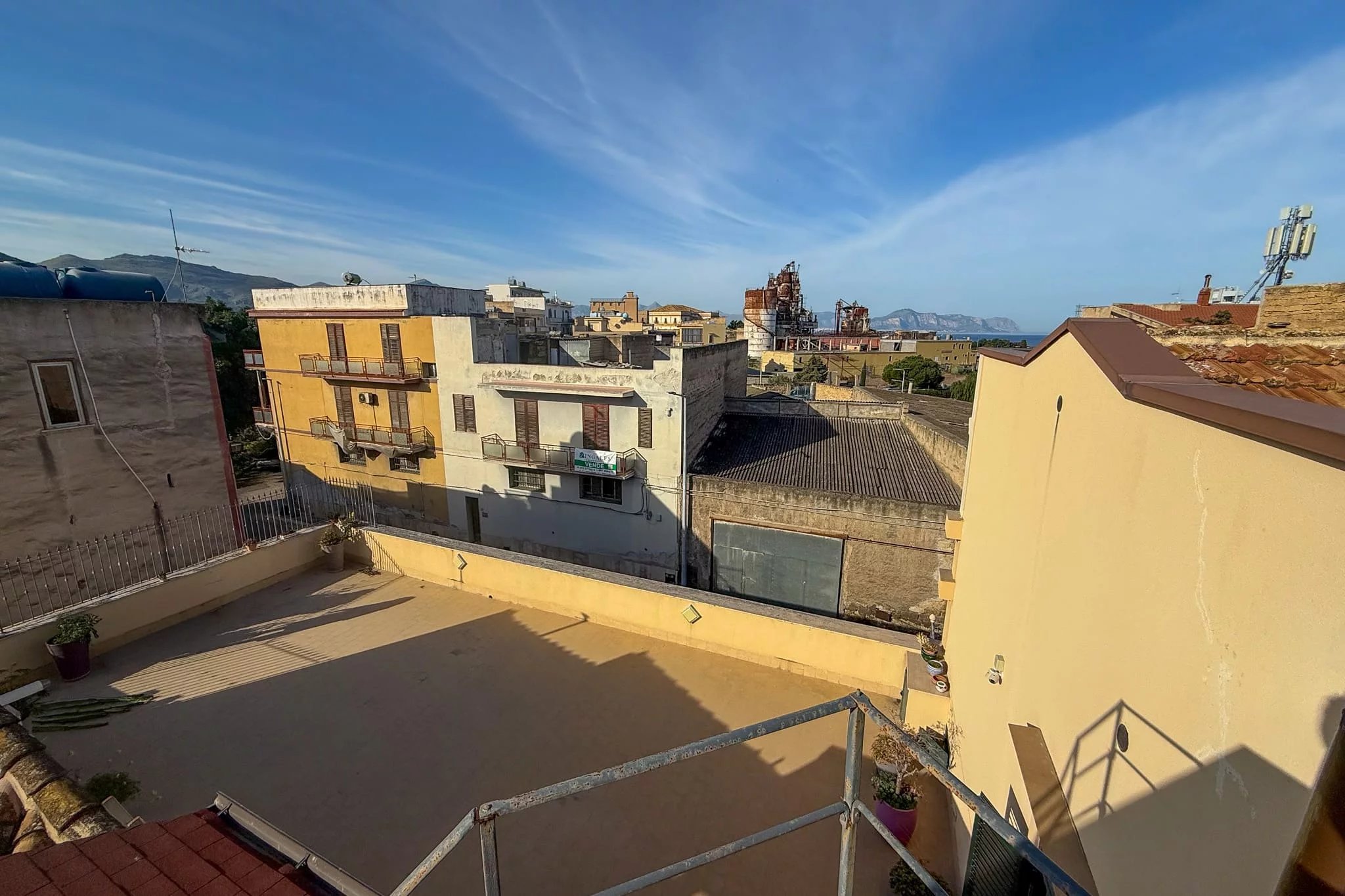 Abgerundet wird die Residenz durch die große, 100 Quadratmeter große Terrasse. Obwohl sie zur Hauptstraße hin liegt, machen ihre imposante Größe und der Blick auf die Villa Cattolica aus dem 18. Jahrhundert, in der sich das Guttuso-Museum befindet, sie zu einem wirklich wertvollen Außenbereich. Bereits mit einem bewohnbaren Vordach und einem Außenküchenbereich mit Holzofen ausgestattet, braucht sie nur noch eine persönliche Note und etwas Grün, um wieder zum Leben zu erwachen und zum Mittelpunkt Ihres Zuhauses zu werden. An lauen Sommerabenden wird es nichts Schöneres geben.