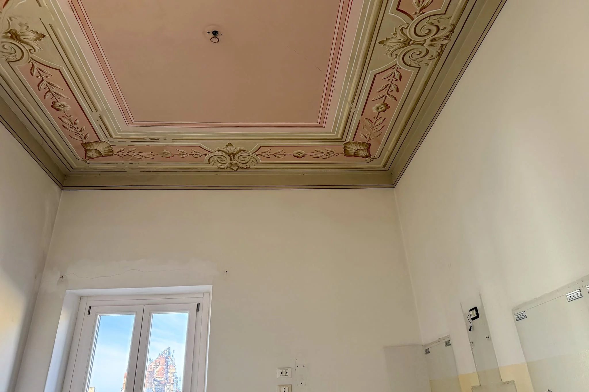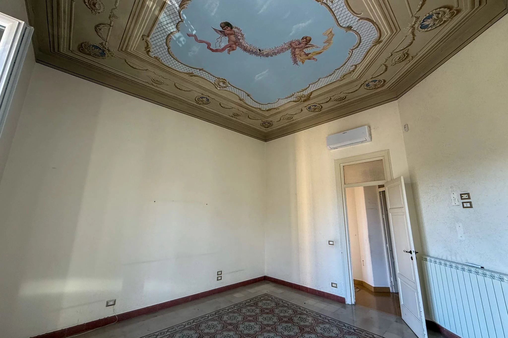 Im Inneren präsentiert diese klassische Wohnung mit Fresken eine wunderschön traditionelle Auswahl kostbarer sizilianischer Handwerkskunst. Fast jeder Raum wird von einer auffälligen Decke mit perfekt erhaltenen Originalfresken aus dem 18. Jahrhundert gekrönt. Unter den Füßen liegen makellose Majolika-Fliesen mit geometrischen und floralen Mustern, die Sie in die Geschichte der Insel eintauchen lassen.