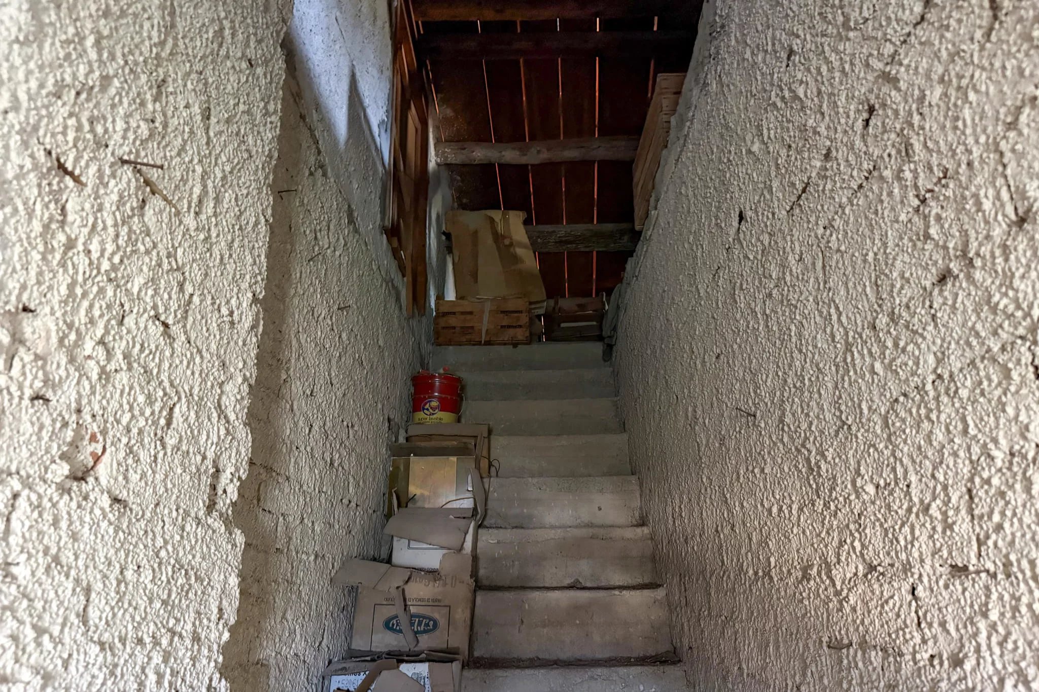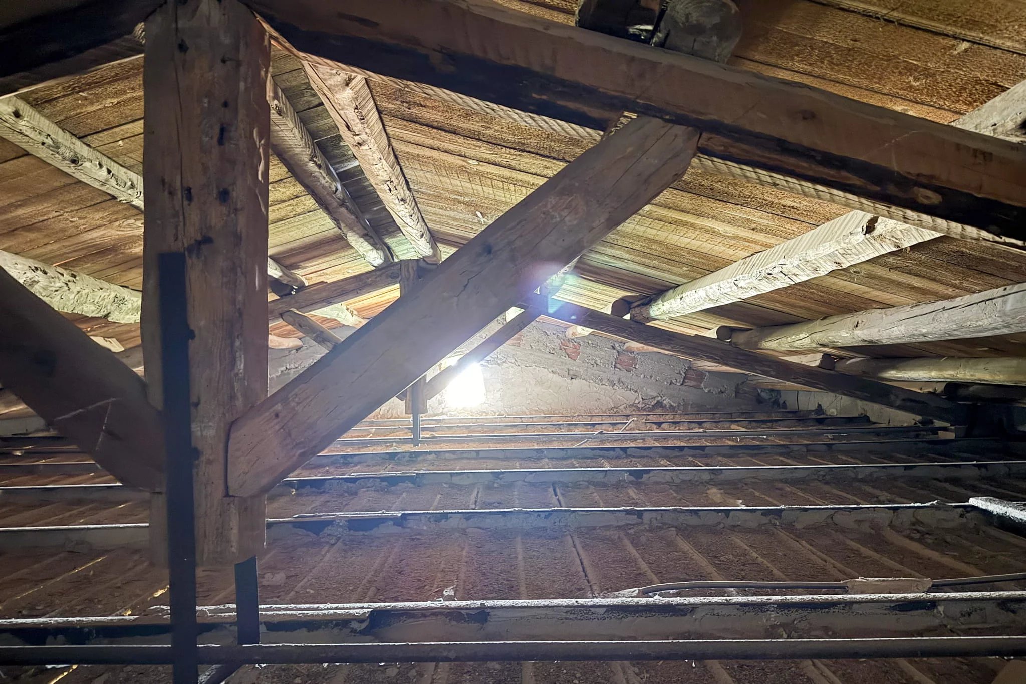 Vom Wohnzimmer führt eine Treppe hinauf zum Dachboden, wo die ursprünglichen Holzbalken zu sehen sind. Diese baulichen Elemente verleihen dem Raum einen echten architektonischen Reiz und könnten durch eine durchdachte Renovierung zu einem beeindruckenden Blickfang werden. Wir haben eine mögliche Lösung im Sinn, die wir besprechen werden, wenn wir über das Potenzial des Hauses sprechen.