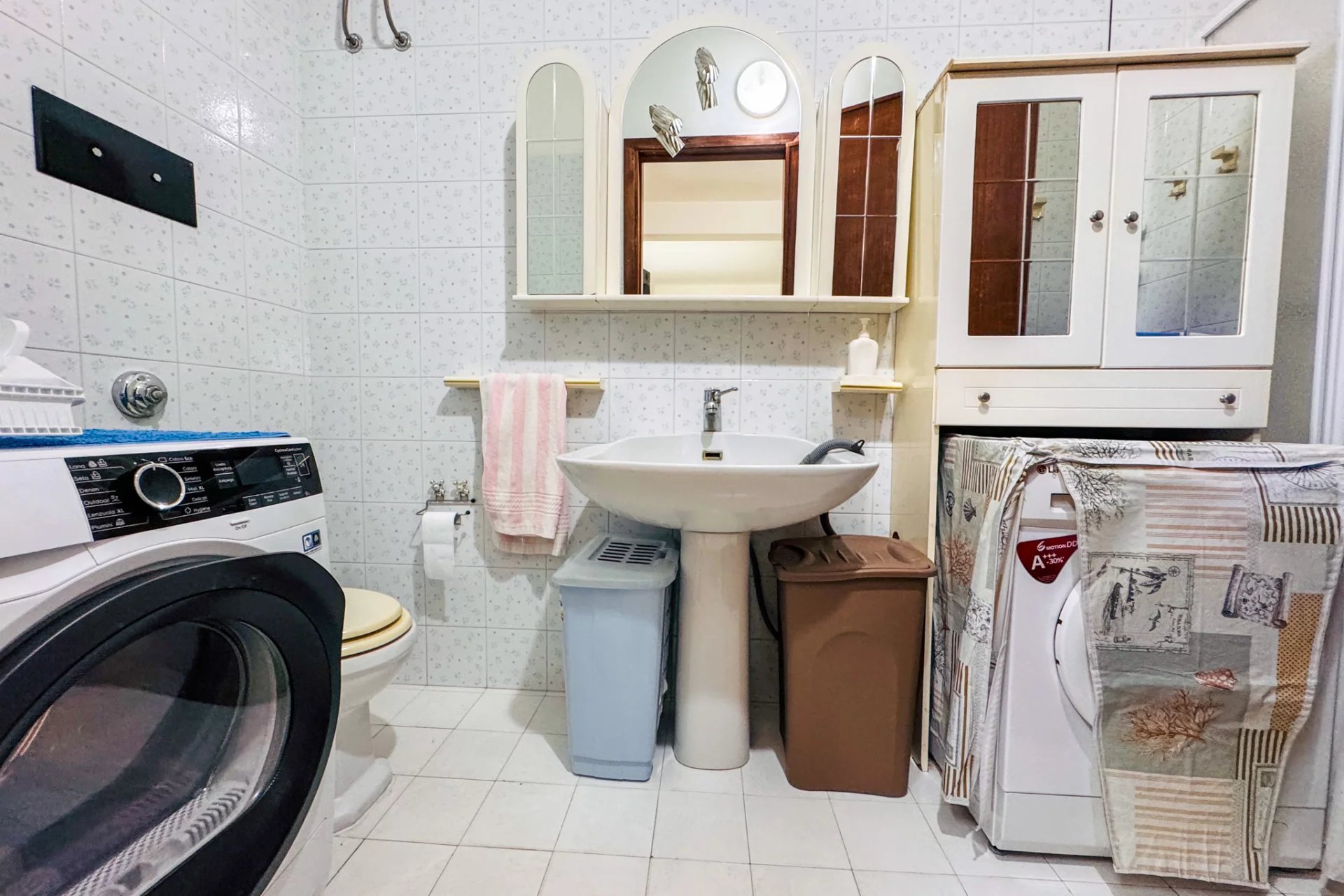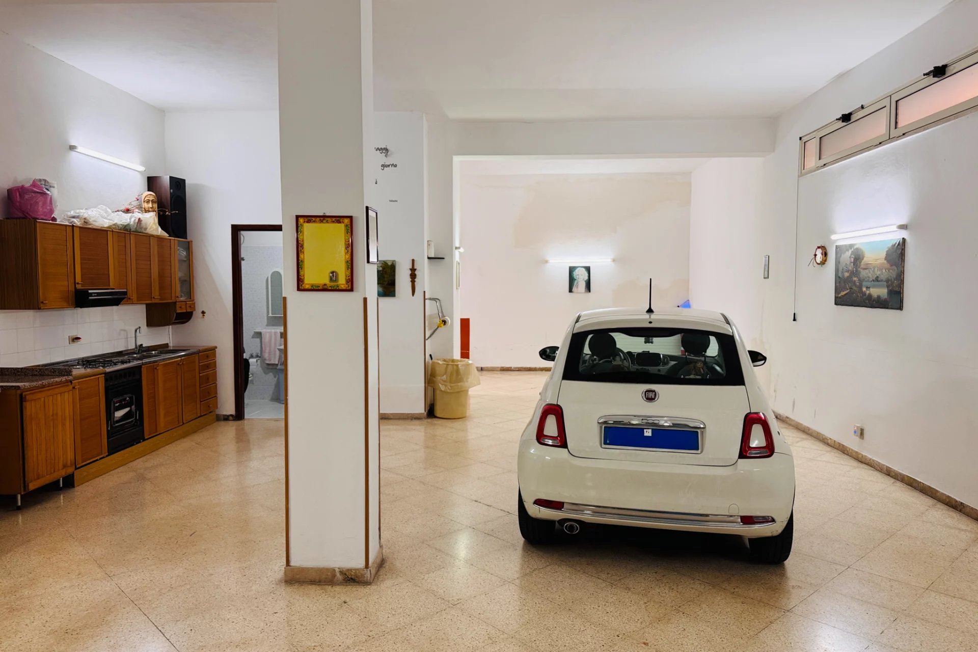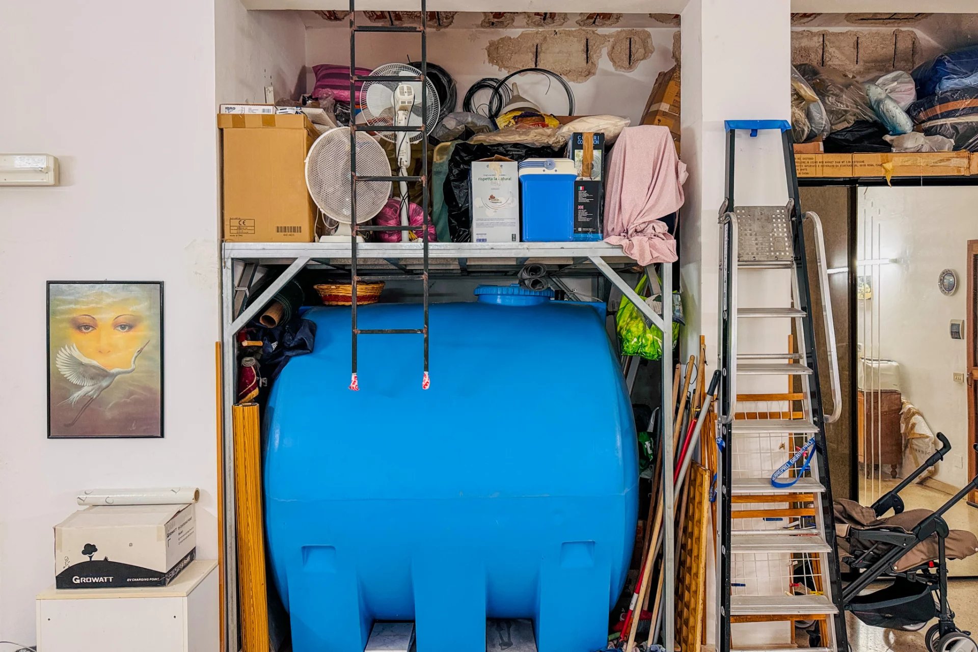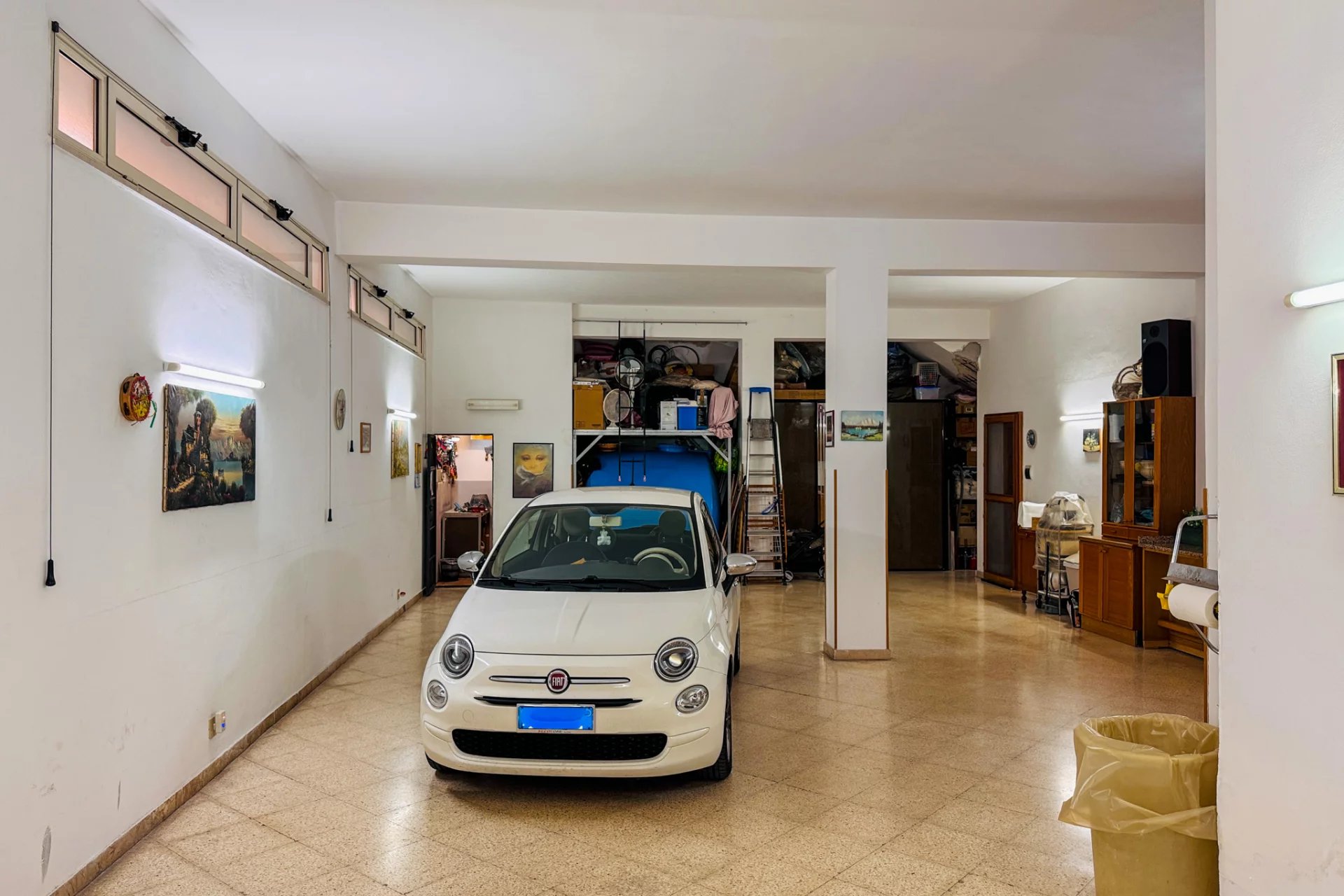Across the landing at the bottom of the building's staircase is, the internal entrance to the garage. This huge space has ceramic floor tiles and smooth plaster walls. There is natural light from some ceiling-level windows as well as from the main doors at the front. These are automatic and connected to the lighting system for ease of entry when you get home by car. There is a utility room with a box shower and a washing machine, as well as a storeroom for tools and, obviously, a lot of available work space. This kitchen units mounted along one wall are not included in the sale.