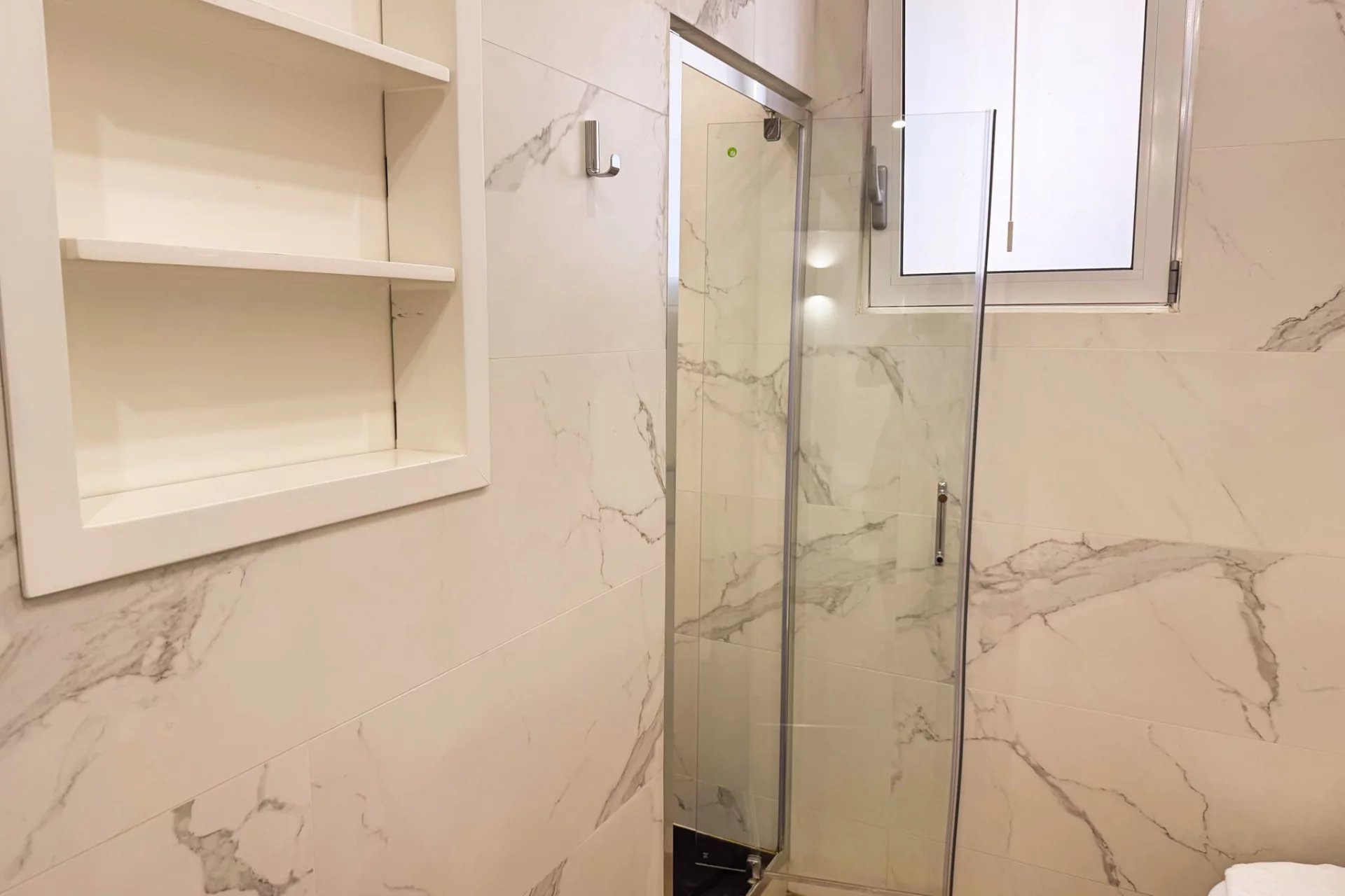 The marble staircase brings you past another bathroom, similarly sized and with a bench seat in the roomy shower cubicle for ease of use shower offers a bench seat for ease of use. Beyond this is the bedroom, a similar size to the living room downstairs and just as nicely decorated. The bed is new and extremely comfortable, a box sofa in one corner adds comfort to the space and another large TV has been tucked neatly into a recessed alcove. A balcony offers a tantalising glimpse of the sea above the rooftops down the hill.