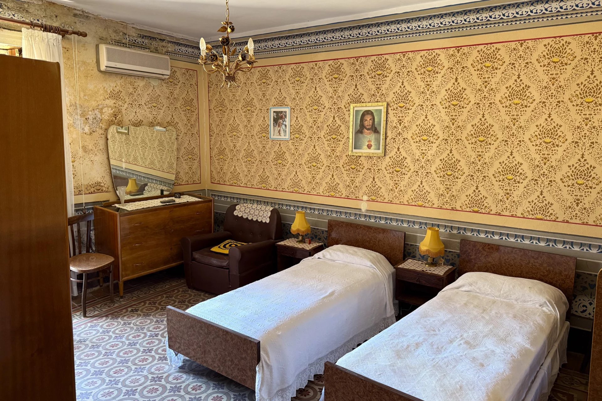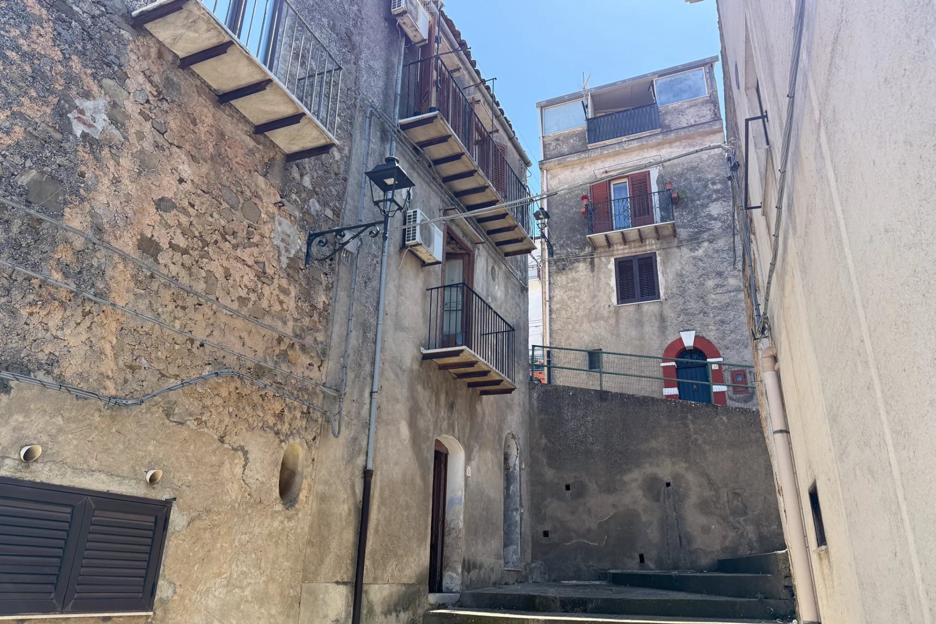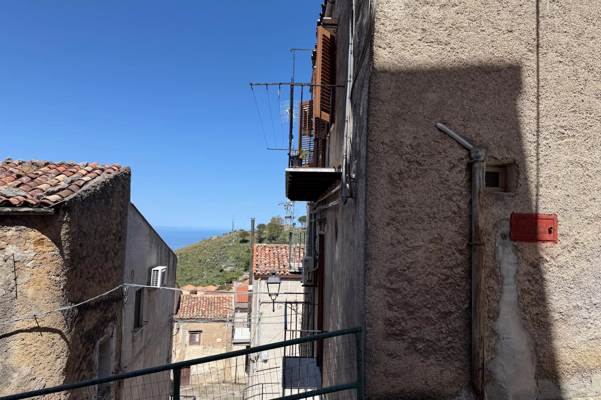Positiv zu vermerken ist, dass die Treppe in den 1980er Jahren mit Beton neu gestaltet und mit wunderschönem sizilianischem Marmor verkleidet wurde und sich noch in einem hervorragenden Zustand befindet. Das Badezimmer stammt aus einer ähnlichen Epoche, aber die schlichte Einrichtung ist gut gealtert und alles funktioniert noch einwandfrei. Auch das Dach ist in einem guten Zustand. Sie werden die dekorativen Bodenfliesen im ganzen Haus lieben, und der fest eingebaute Holzofen in der Küchenwand ist ein Muss.