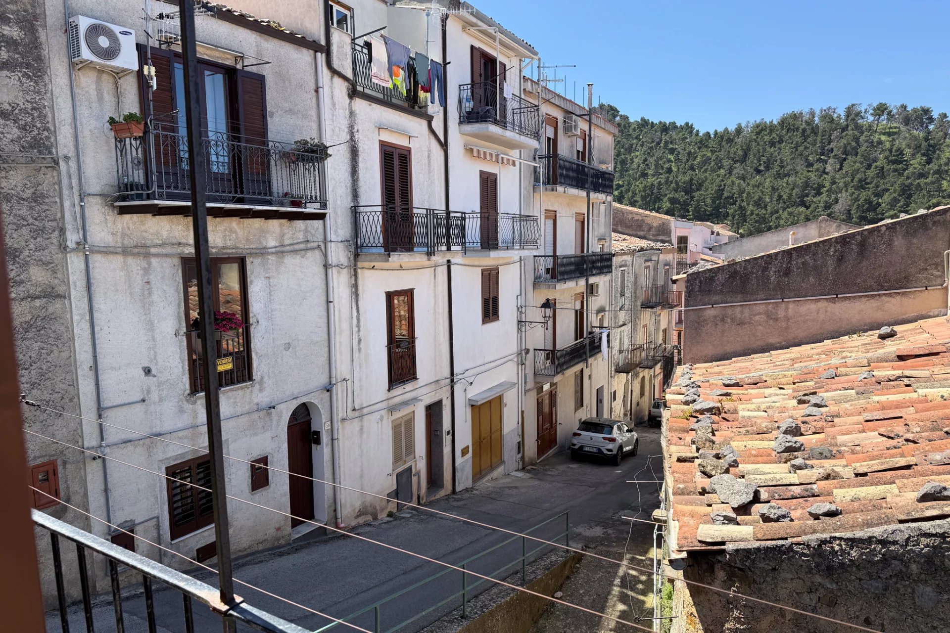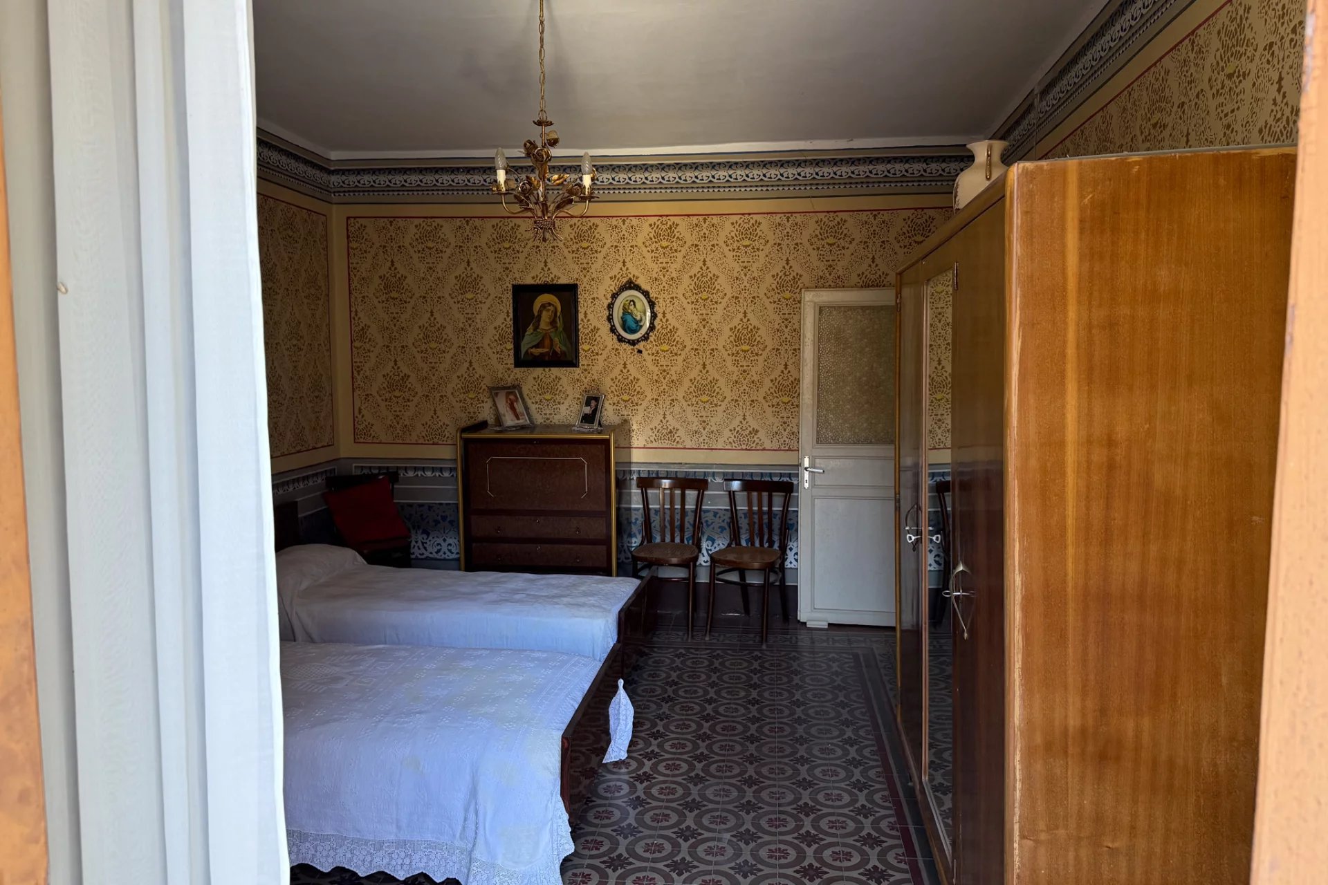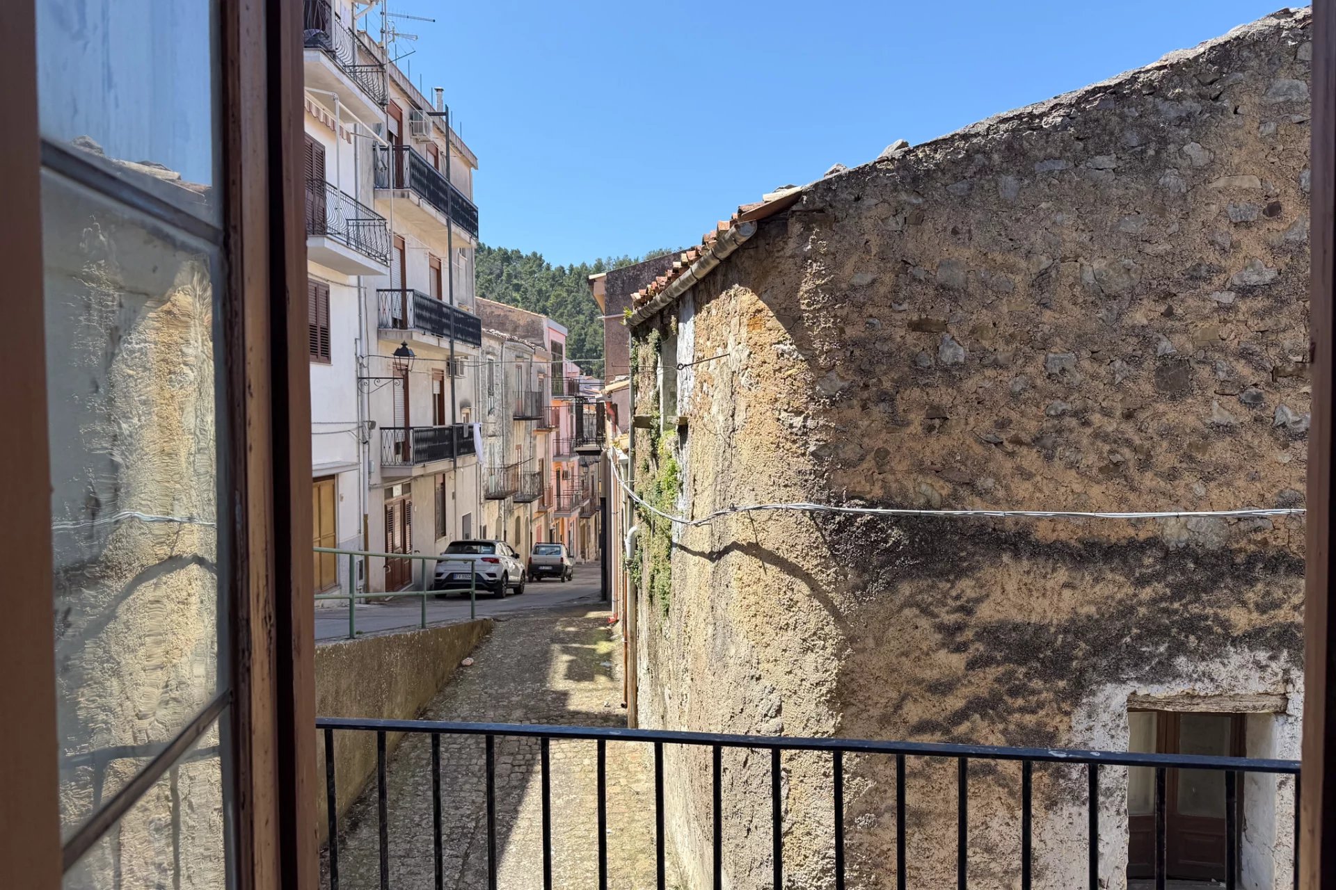 Positiv zu vermerken ist, dass die Treppe in den 1980er Jahren mit Beton neu gestaltet und mit wunderschönem sizilianischem Marmor verkleidet wurde und sich noch in einem hervorragenden Zustand befindet. Das Badezimmer stammt aus einer ähnlichen Epoche, aber die schlichte Einrichtung ist gut gealtert und alles funktioniert noch einwandfrei. Auch das Dach ist in einem guten Zustand. Sie werden die dekorativen Bodenfliesen im ganzen Haus lieben, und der fest eingebaute Holzofen in der Küchenwand ist ein Muss.