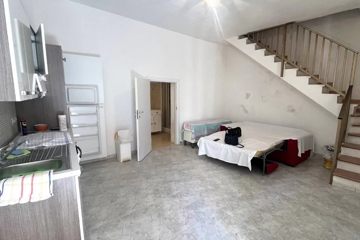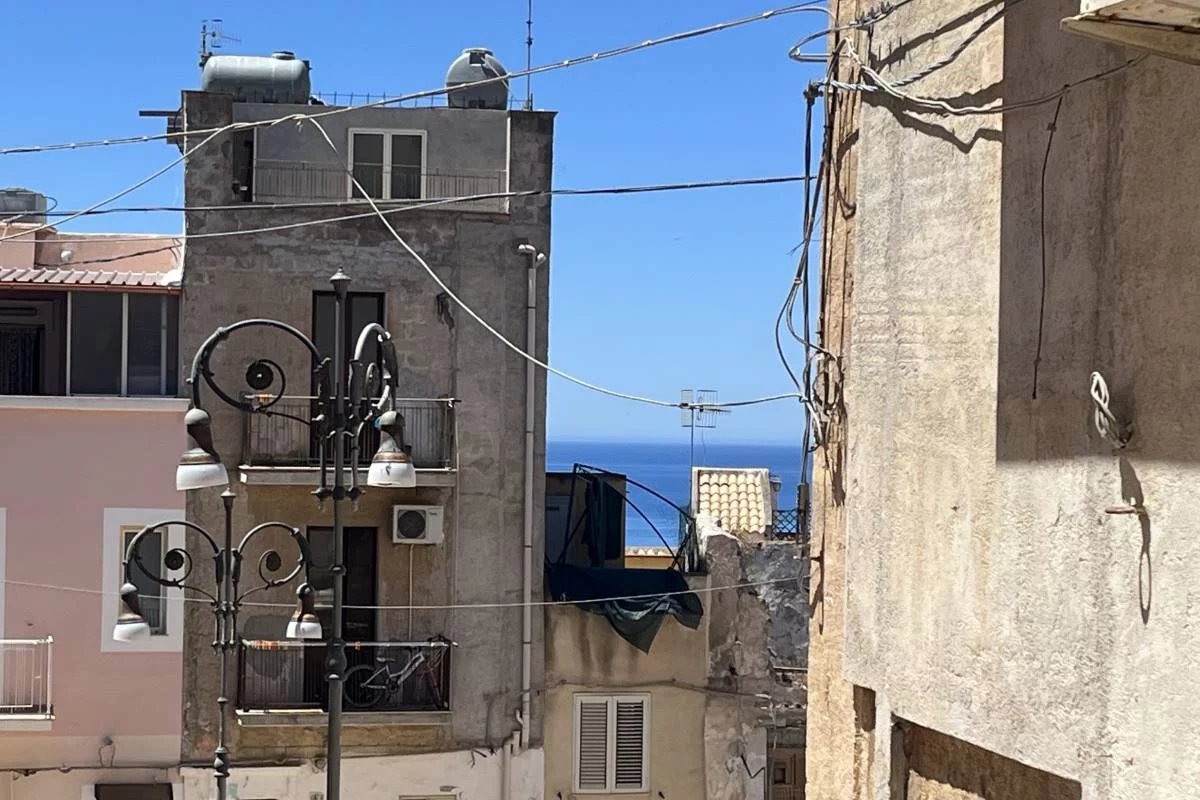 Das Haus hat den typischen Charme einer sizilianischen Altstadt Immobilie, es erstreckt sich über drei Stockwerke und da es am Hang liegt, hat sowohl das Erdgeschoss als auch der erste Stock einen direkten Zugang von einer kleinen Straße. Theoretisch könnte man also das Erdgeschoss auch unabhängig bewohnen und vom Rest des Hauses abtrennen. Sowohl im Erdgeschoss als auch im ersten Stock befindet sich eine Toilette . Vom ersten Stock erreicht man dann durch eine relativ bequeme Innen Treppe das Dachgeschoss, wo wir eine rund 40 m² große Dachterrasse vorfinden, die auch einen partiellen Meerblick zwischen den Häusern freigibt.