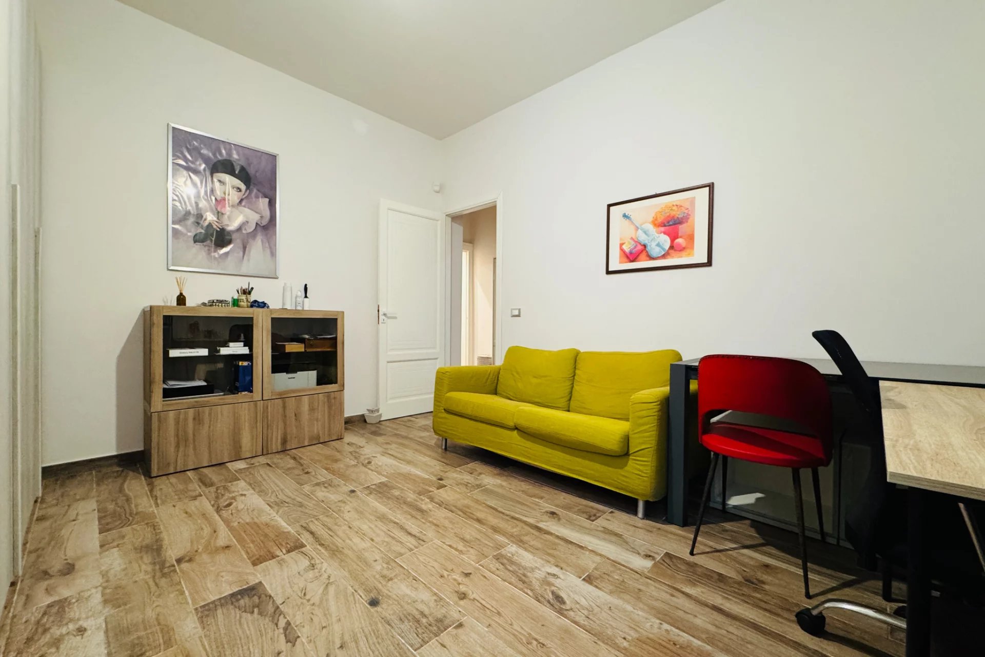 The living area is open plan, with a kitchen at one end and a lounge at the other. Natural light and a comfortable parquet floor make it a welcoming environment, with French windows and a glazed patio door onto the terrace, and a window overlooking a small lemon orchard on the side wall. A replica fireplace generates smoke and a flame without needing to be refuelled.
