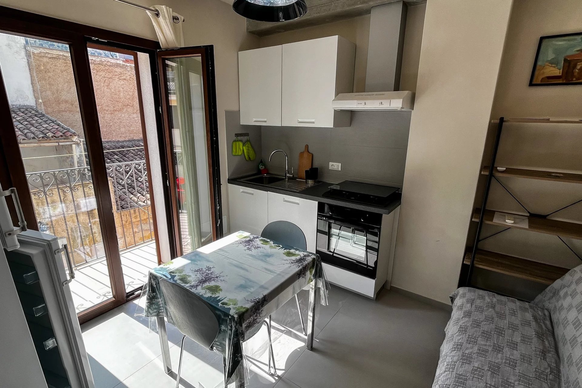 At the top of the building sits the crown jewel of the property: a spacious 70-square-metre, high-ceiling apartment. You enter into an open-plan kitchen-living area with a sofa, dining table, balcony, and bathroom. The kitchen may seem modest at first, but that’s because most of the living happens in the spectacular covered veranda just beyond. With panoramic views over the town, the hills, and even the sea, this outdoor space comes equipped with a wind-sensor awning and plenty of room for seating.
