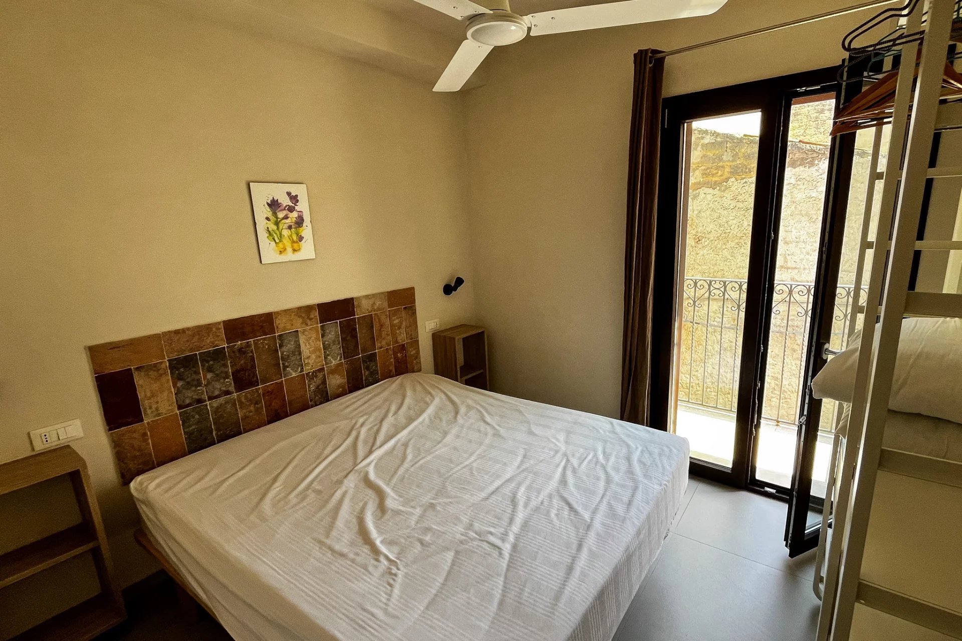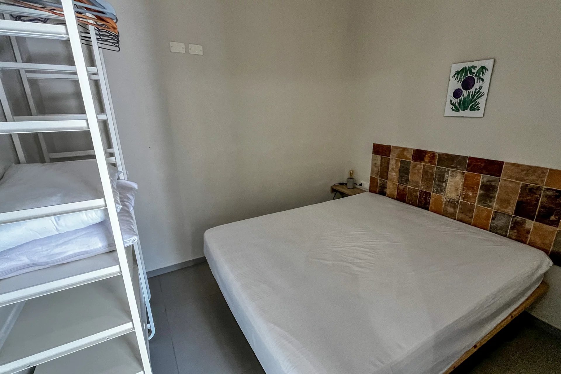 Heading up the beautifully tiled terracotta staircase, the first floor contains two separate apartments. The larger of the two (around 45 square metres) is centred around a bright, well-designed kitchen-living room with a sofa, dining table, balcony, and both air conditioning and heating. Off this central space are two double bedrooms, each with its own balcony and ceiling fan, plus a modern bathroom with all the essentials.