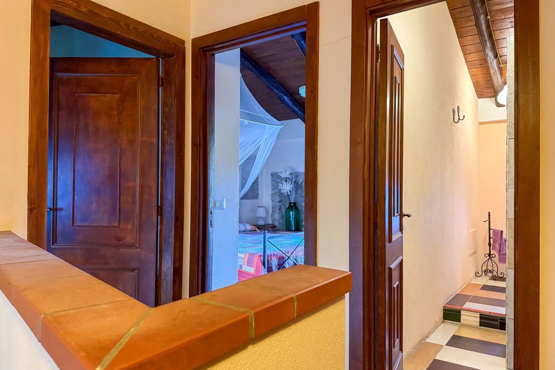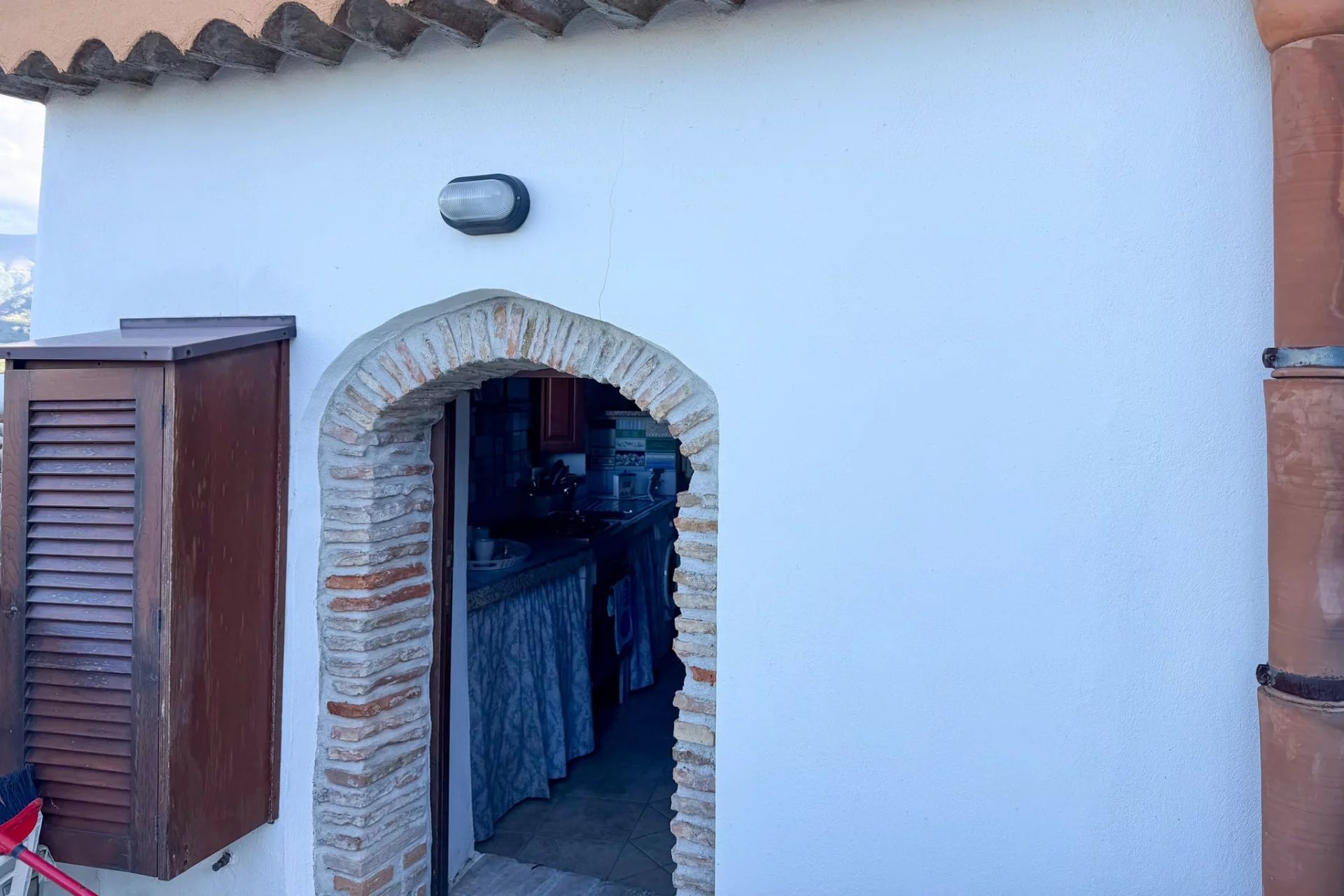 Der Haupteingang befindet sich im Innenhof in der Mitte der Residenz, aber das Gästezimmer hat eine Hintertür zur Gasse, die hinter dem Komplex verläuft. Das Hauptschlafzimmer bietet einen fantastischen Blick auf die Dächer von Rodì und die grünen Hügel, die es umgeben.