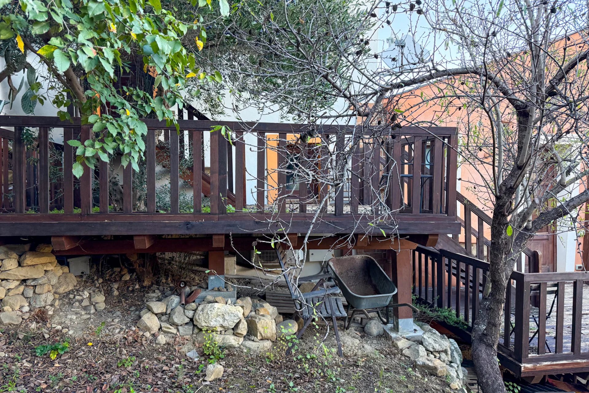 Die zweite Wohnung ist 68 m² groß und verfügt über einen offenen Wohnbereich im Obergeschoss und ein Schlafzimmer mit eigenem Bad im Erdgeschoss. Sie hat zwei Terrassen – eine auf dem Dach, das über dem Badezimmer gebaut ist, und eine weitere aus Holz, die tiefer liegt und einen Blick auf den Swimmingpool bietet. Von der ersten Terrasse aus hat man in der Ferne einen kleinen Blick auf das Meer.