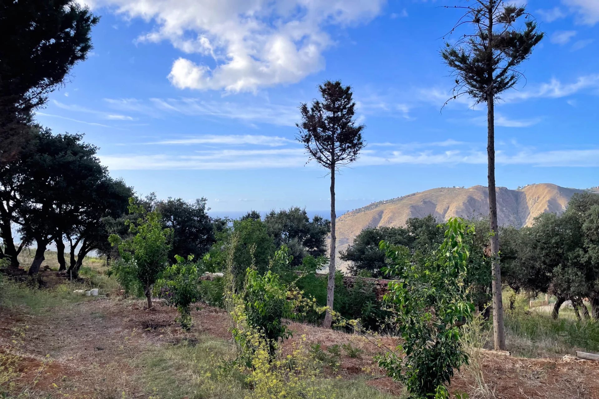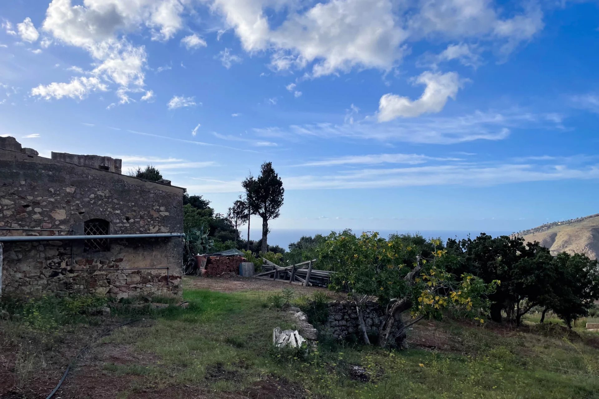 The hill slopes smoothly down from the hills of the Madonie Park towards the Gulf of Termini Imerese, from 350m above sea level at its highest point to 280m at the foot of the plot. The gradient is a relatively smooth 1:6 gradient, although there is a flat terrace where the old house was built.