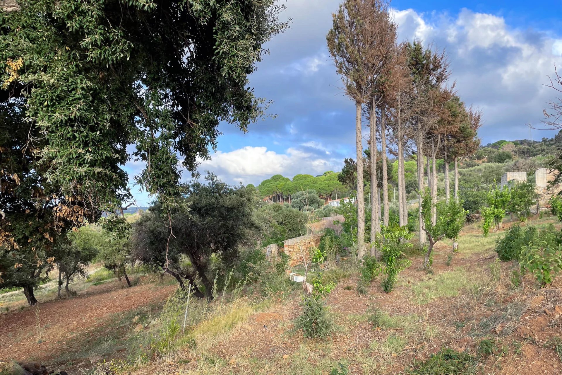 Around 45,000m2 in total, Plot Alessandro has an elliptical shape, 410m long by about 150m wide, but tapering at each end. Its north edge runs along a single track road in pretty fair condition considering how little traffic passes along it. From this road the estate is mostly screened from view by small trees and bushes that grow alongside it.