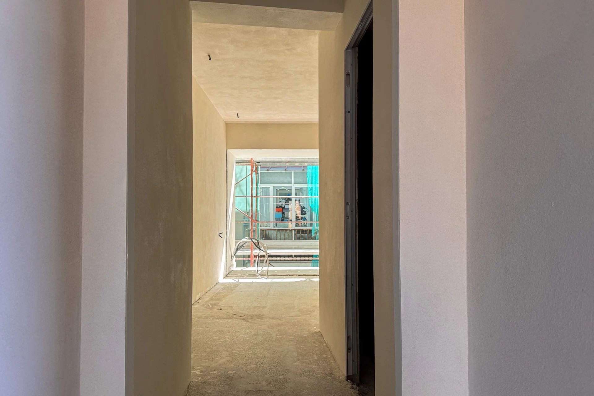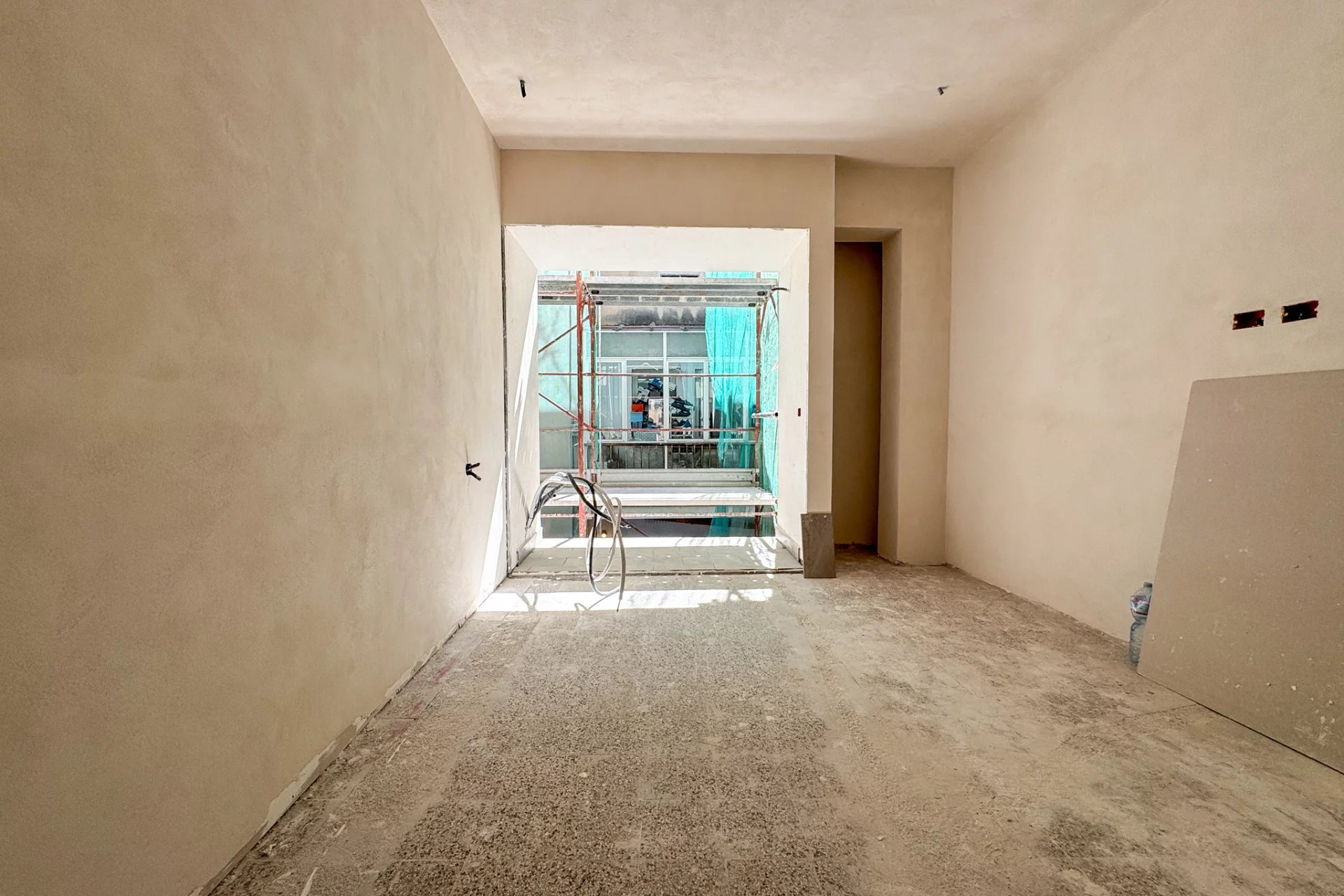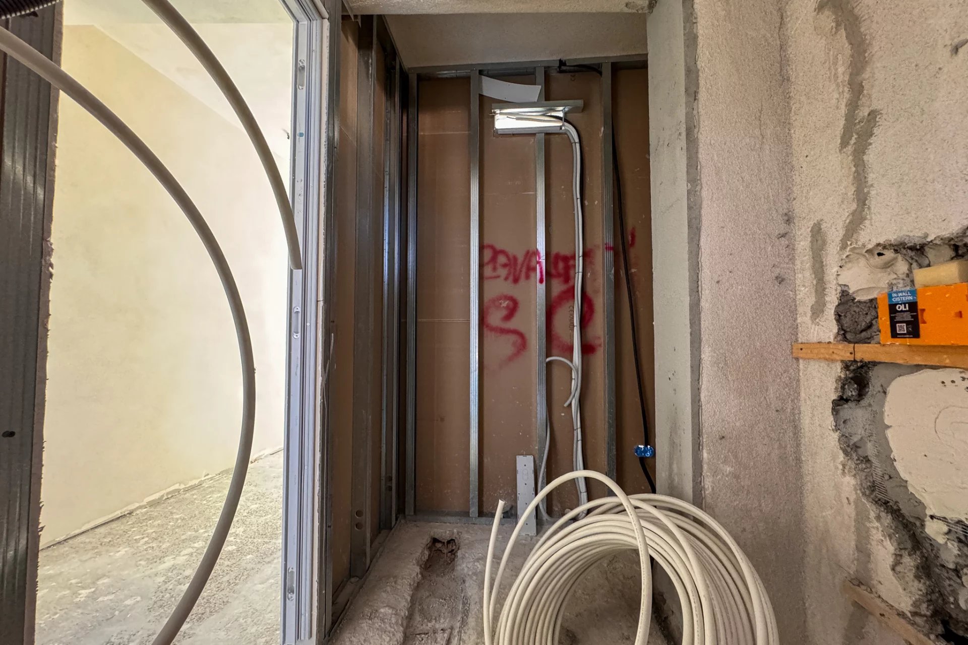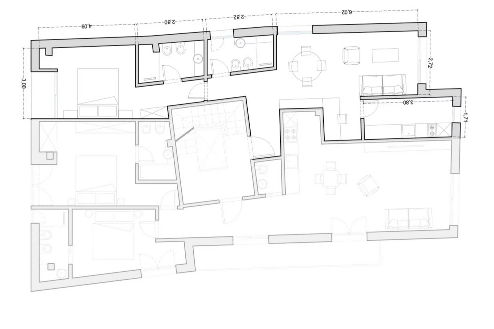 The apartment is long and narrow, approximately 16 m by 3 m, although it has a more interesting shape than a perfect rectangle. However, approximately 50 m² of space will be divided between the bedroom, kitchen, living room, and two bathrooms. This last feature is particularly advantageous for rental use, as it allows four adults to be accommodated at the same time, using the sofa bed in the living room.