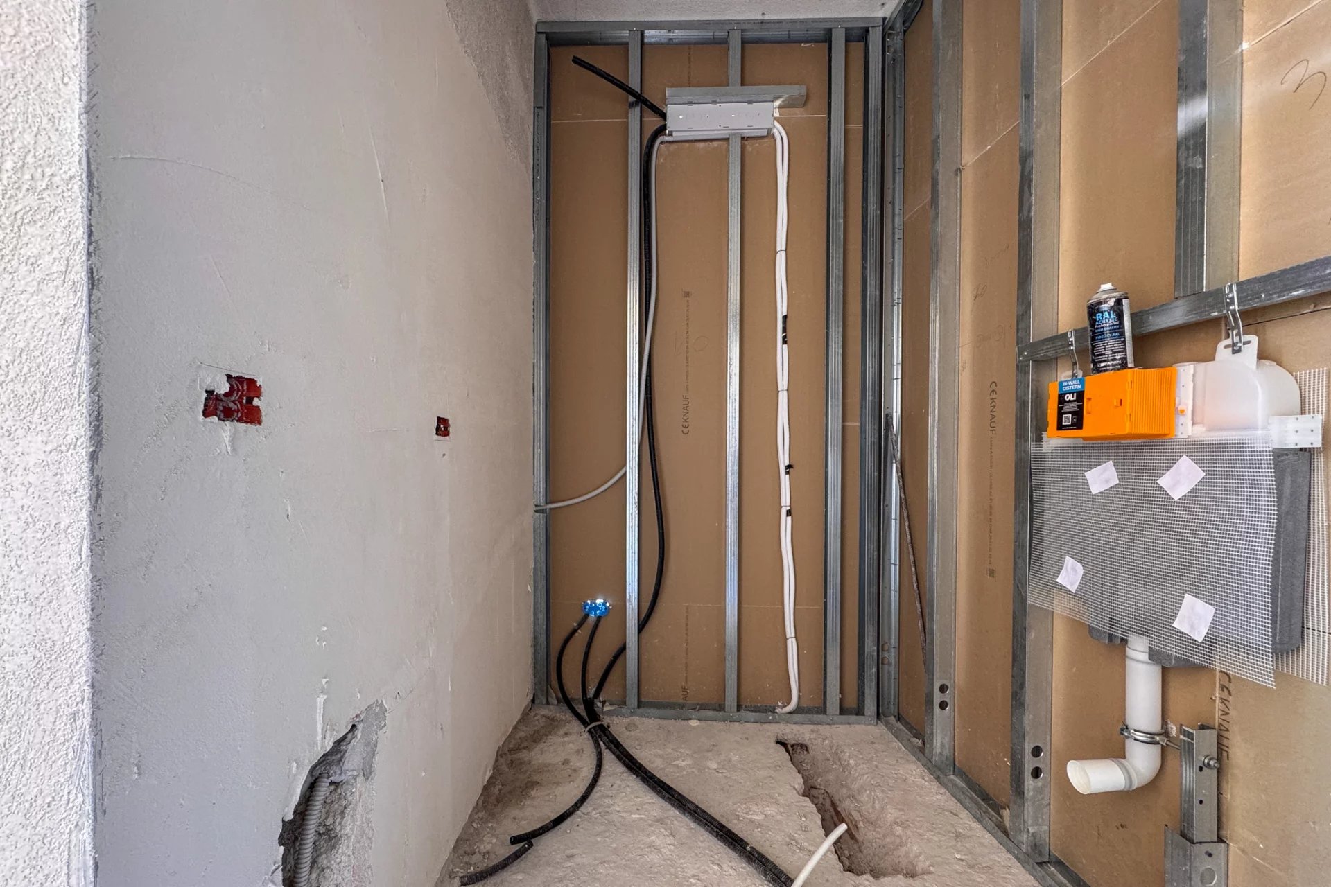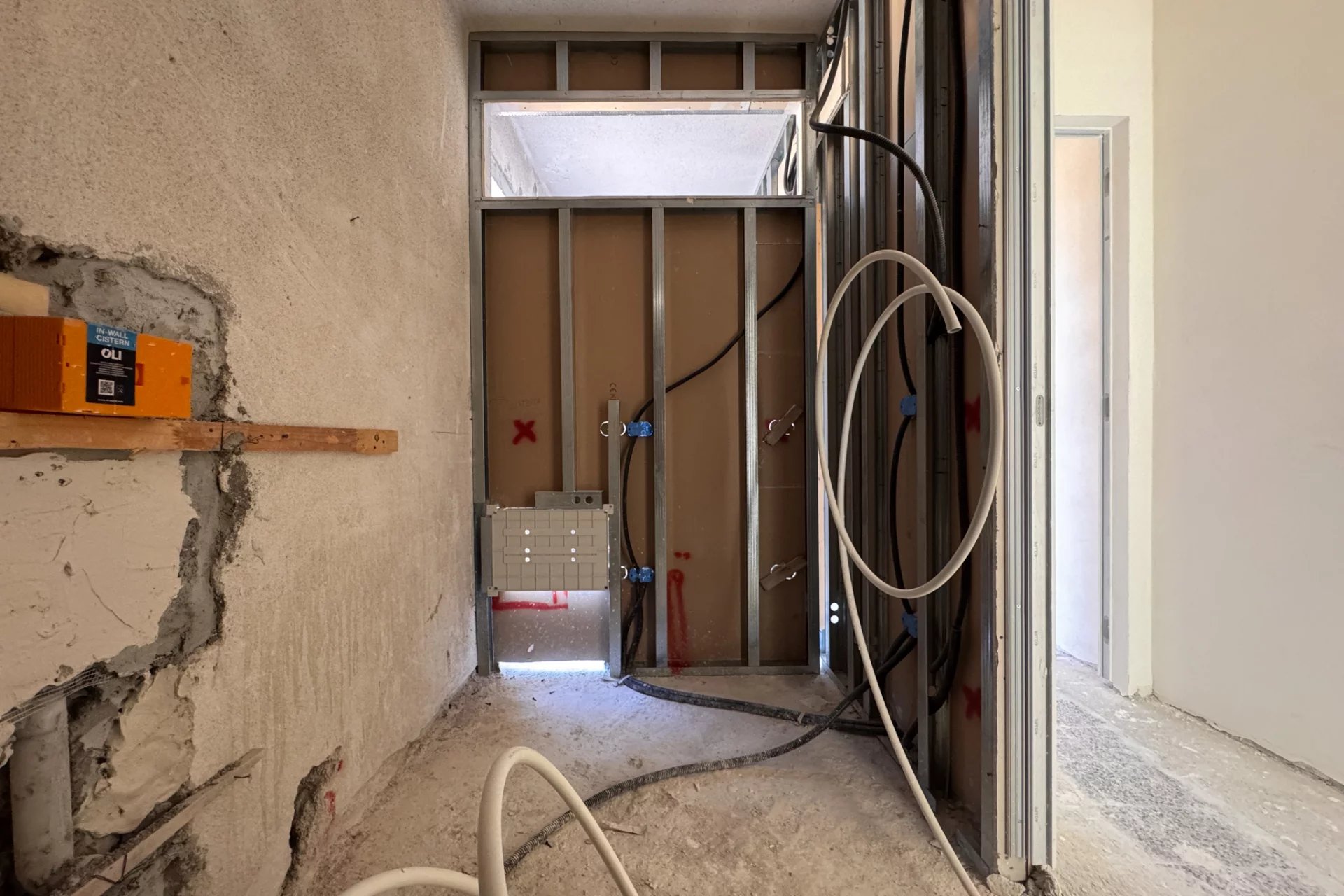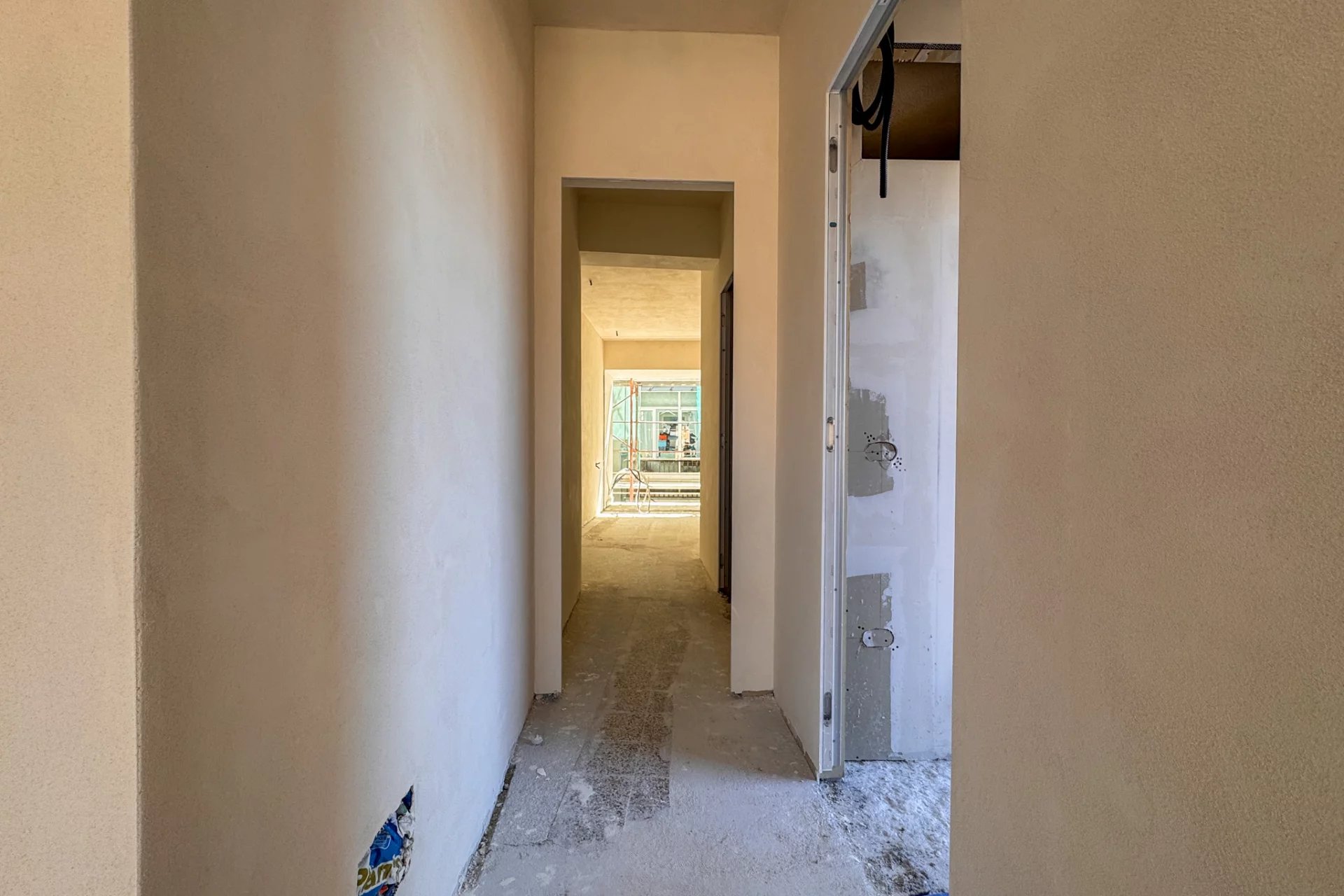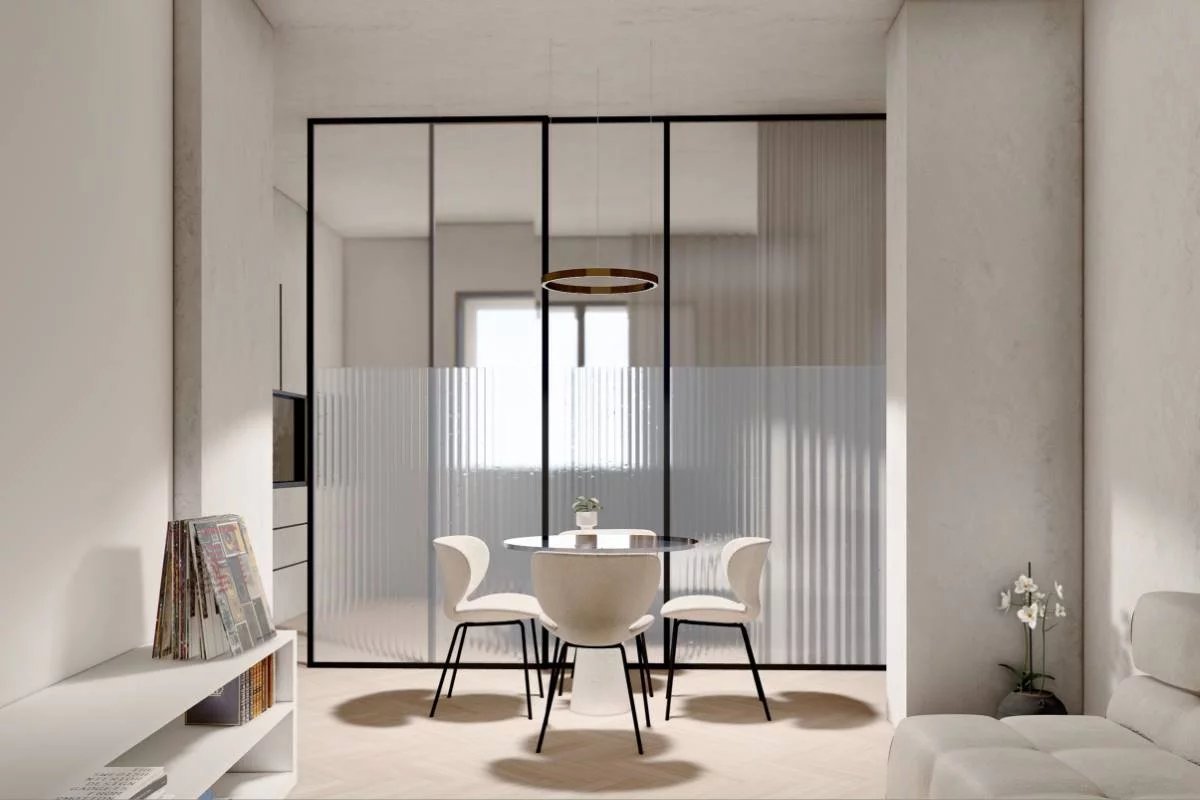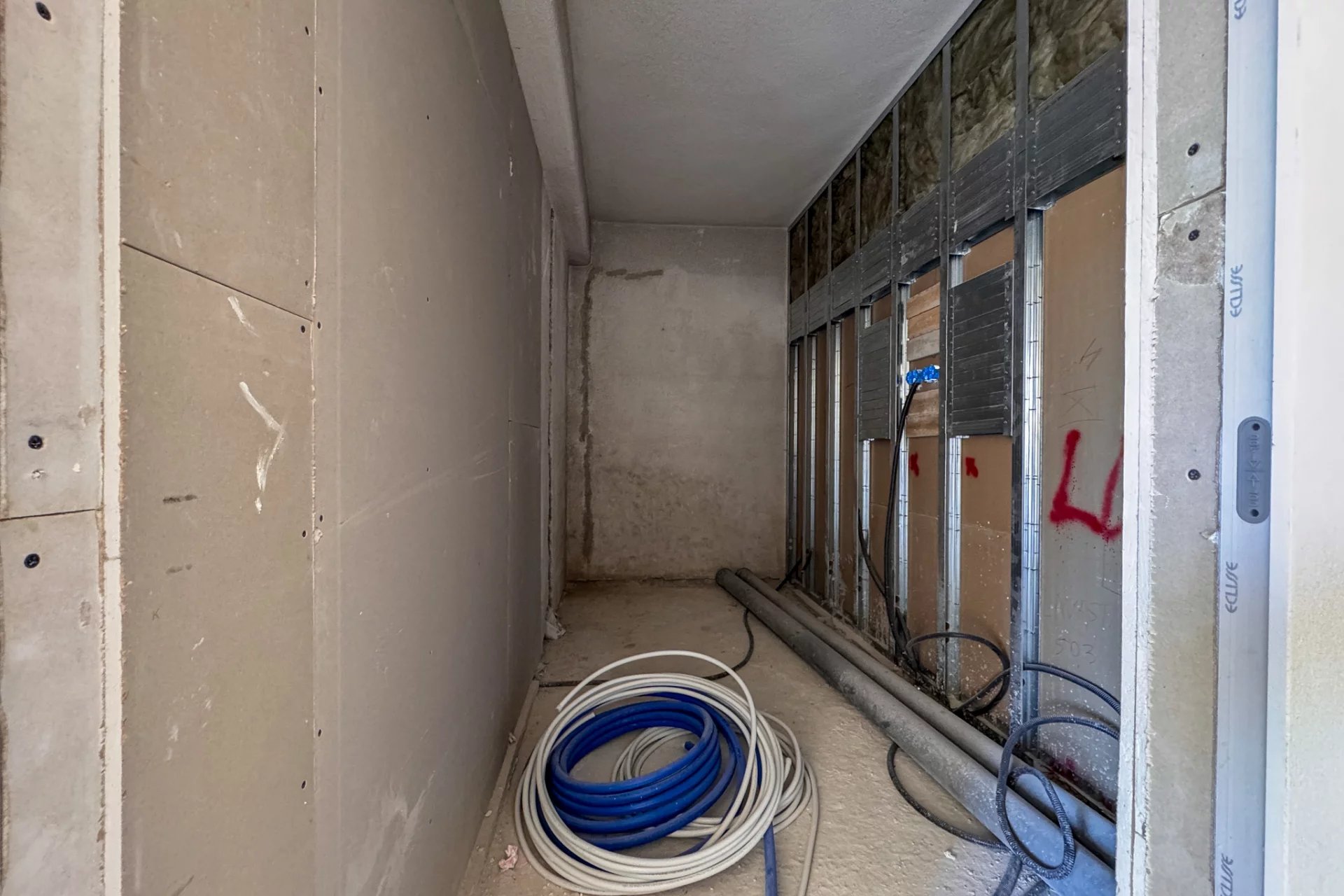 The apartment is long and narrow, approximately 16 m by 3 m, although it has a more interesting shape than a perfect rectangle. However, approximately 50 m² of space will be divided between the bedroom, kitchen, living room, and two bathrooms. This last feature is particularly advantageous for rental use, as it allows four adults to be accommodated at the same time, using the sofa bed in the living room.