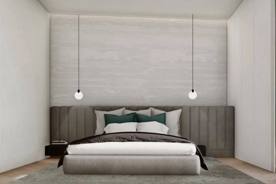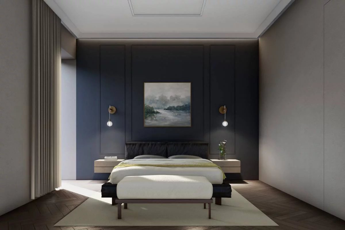 The windows are full height with blackout curtains. Light natural wood and mature paint tones accentuate the smooth plastered walls, with parquet flooring and a bedroom in a luxurious deep purple. The bathrooms will be comfortable, with large, accessible walk-in showers and porcelain sanitary ware.