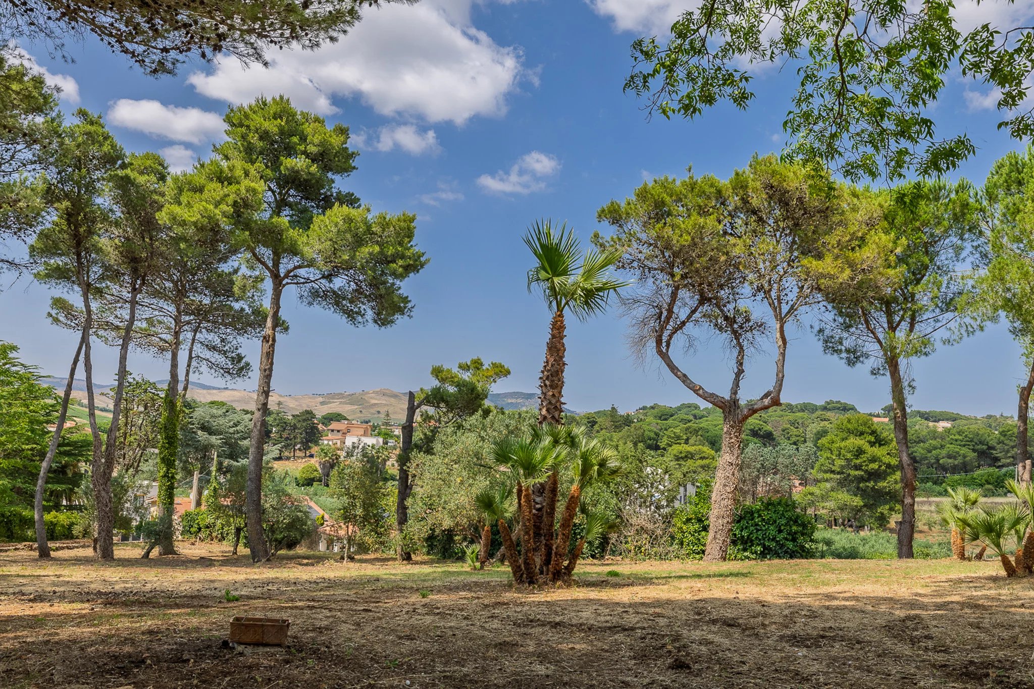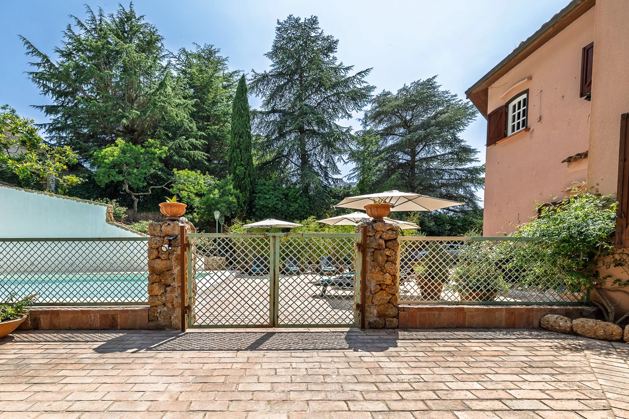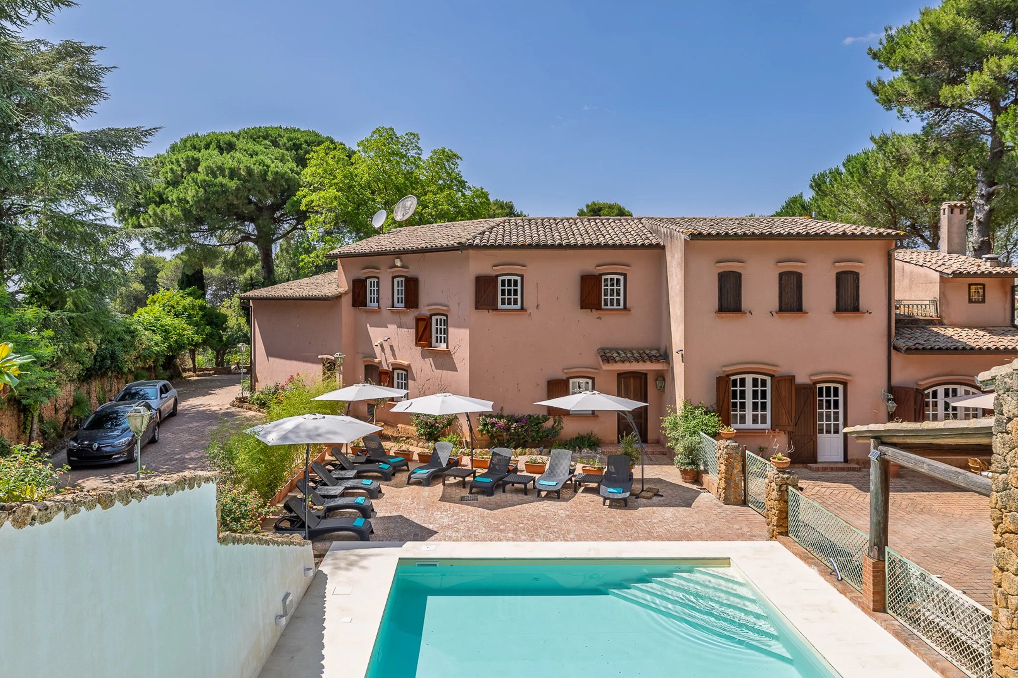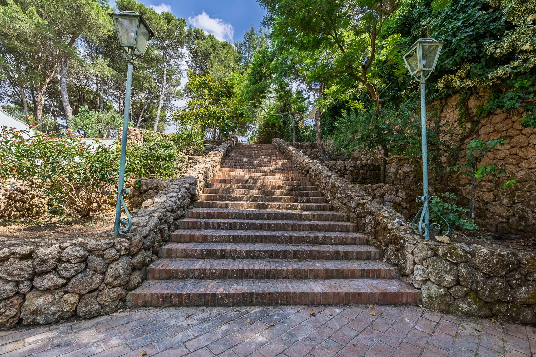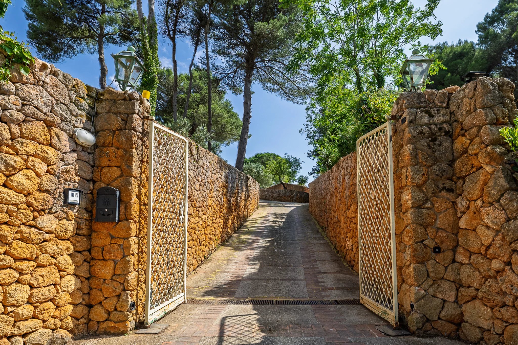 Dahinter erstreckt sich das große Parkgrundstück – ein botanischer Schatz. Hohe Pinien ragen über Olivenhaine, Mandelbäume und mediterrane Zierpflanzen, die über ein Netz aus gewundenen Terrakottawegen und Steinmauern erkundet werden können. Es ist eine private Welt voller Duft und Schatten mit herrlichen Ausblicken auf die umliegenden Hügel und spektakulären Sonnenuntergängen.