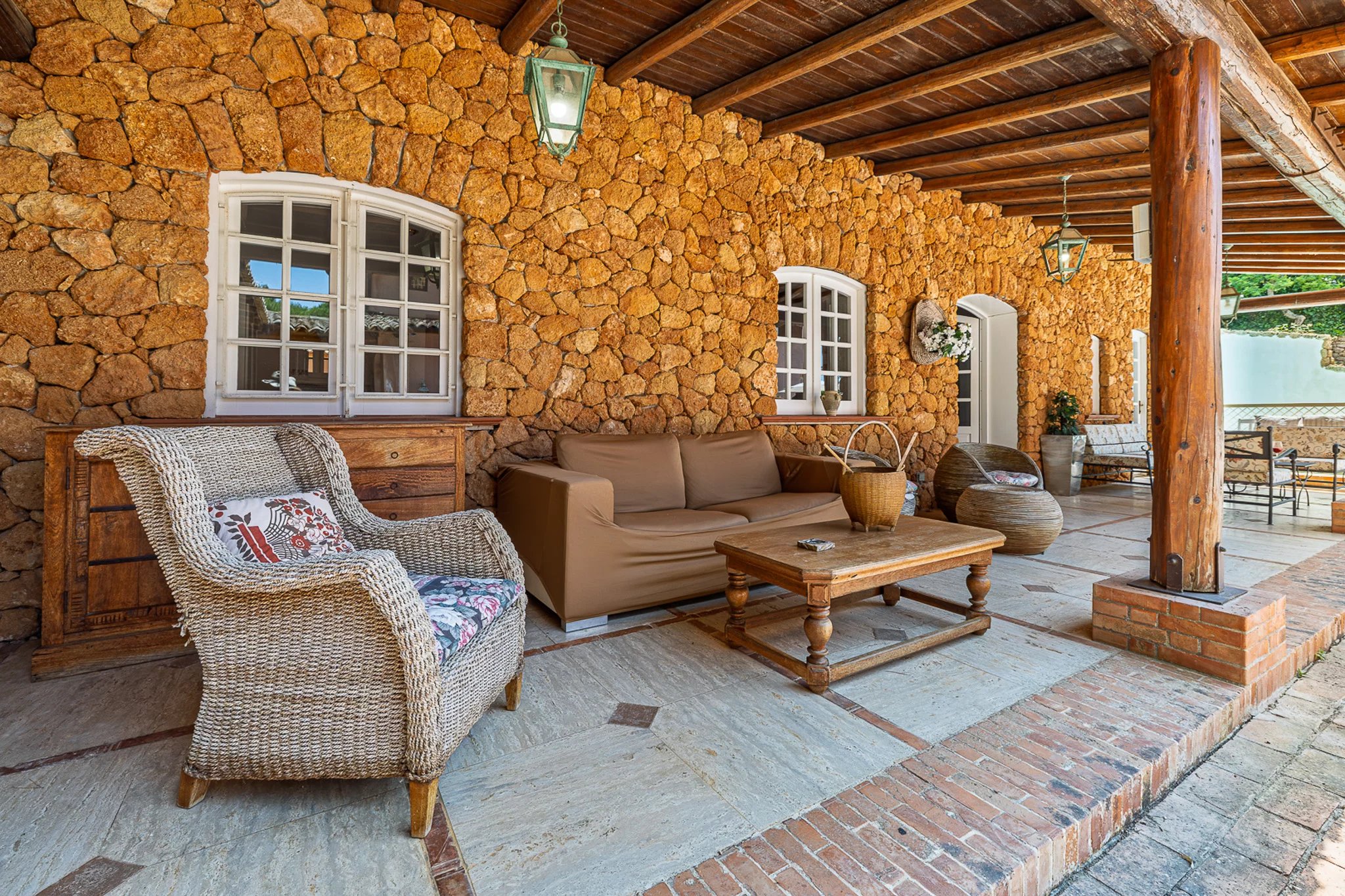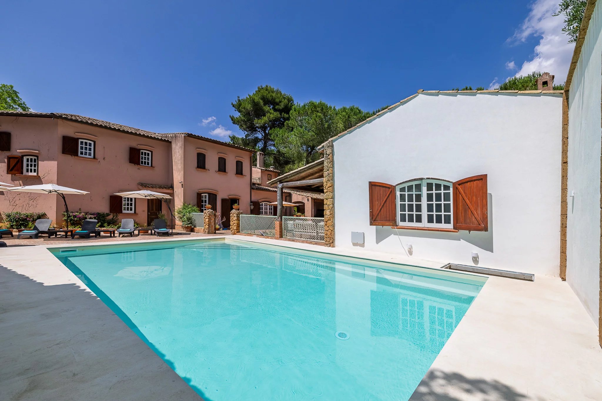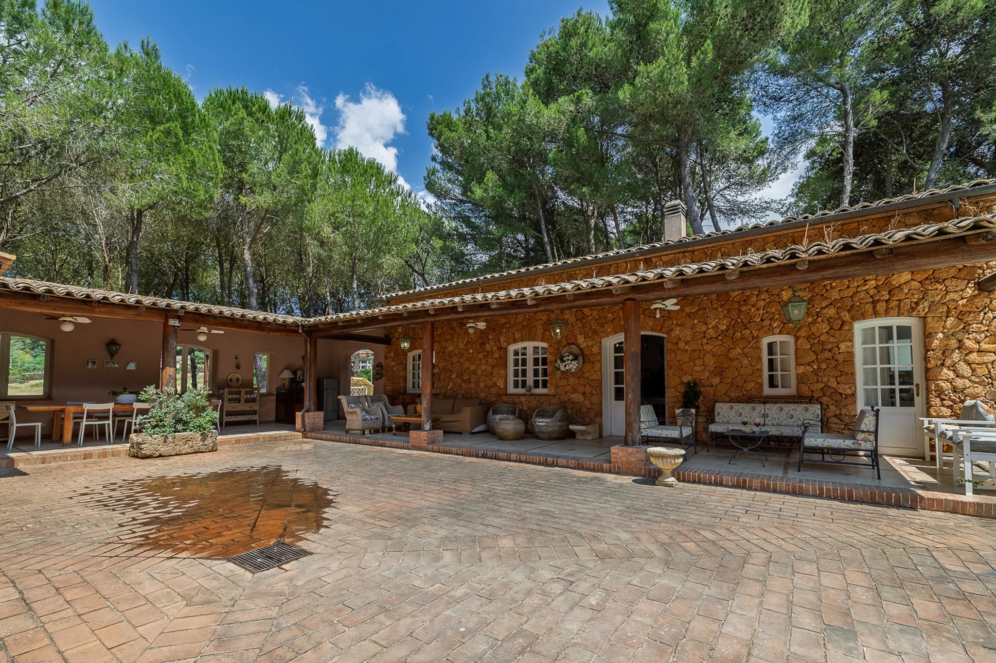 Auf der anderen Seite des Innenhofs bietet das 100 m² große Gästehaus zwei weitere Schlafzimmer sowie eine eigene Küche. Besonders beeindruckend ist die Außenküche unter dem Schatten eines monumentalen Portikus, ebenfalls aus Mauerwerk mit Holzofen gebaut – ein wunderbarer Ort, um an einem sonnigen Sommertag gemeinsam Zeit mit der Familie zu verbringen.