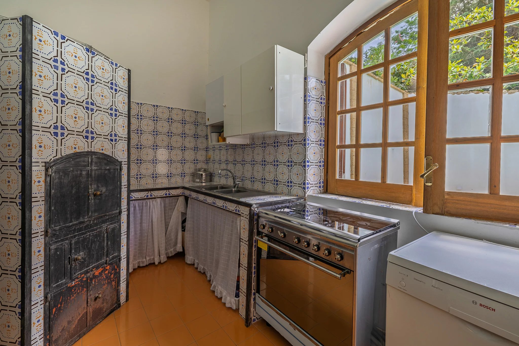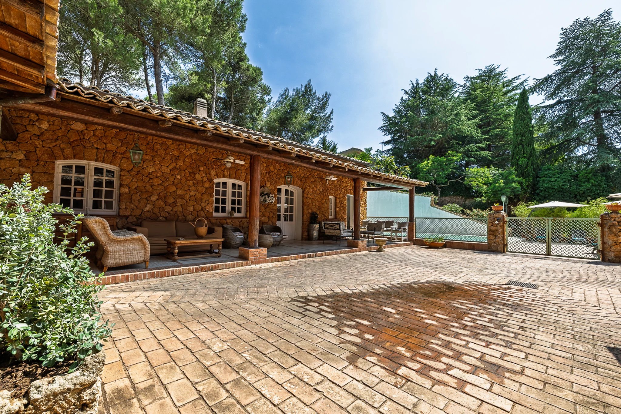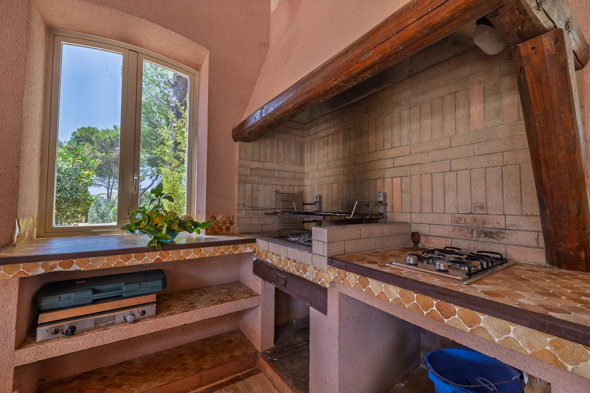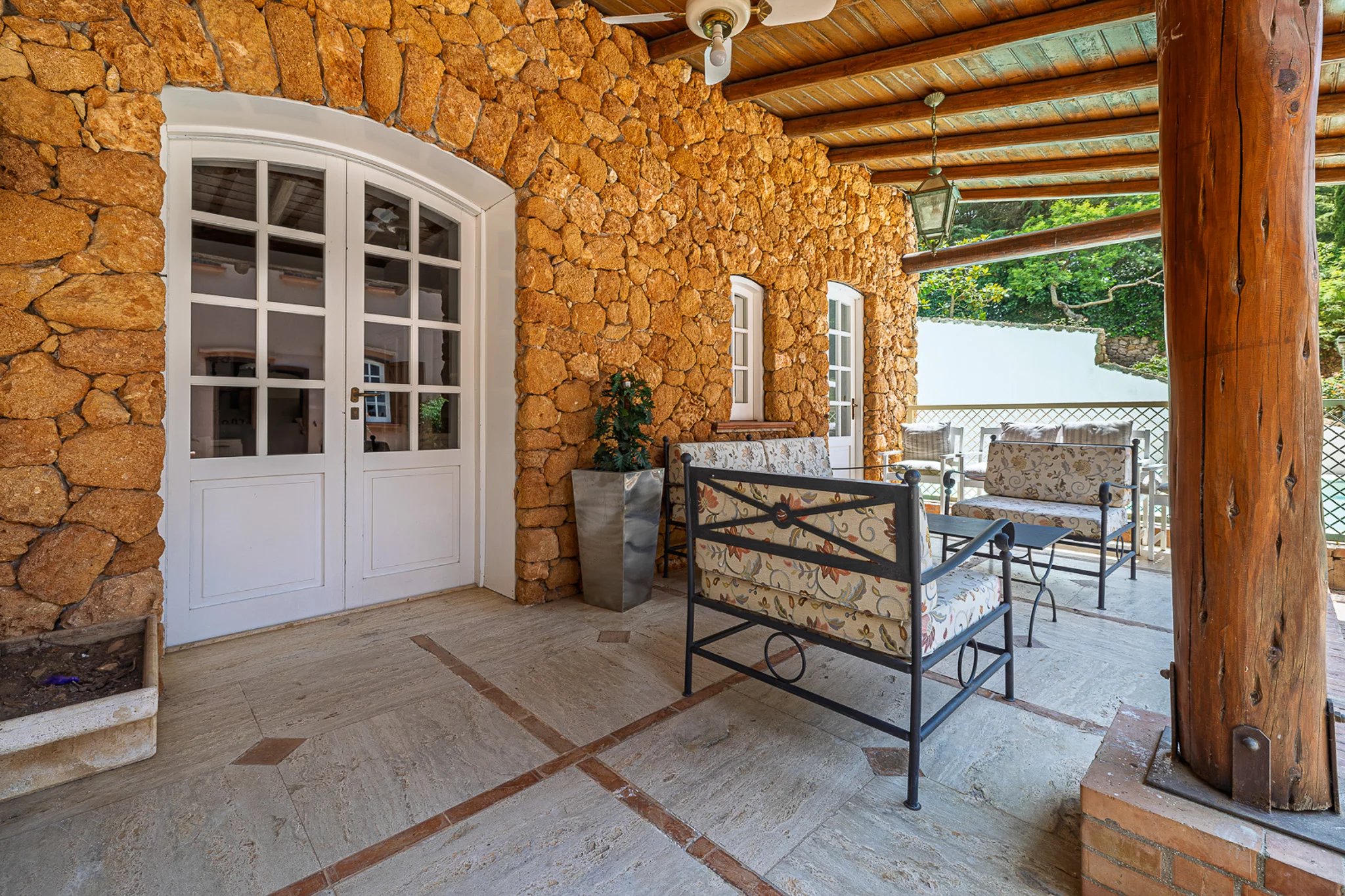 Auf der anderen Seite des Innenhofs bietet das 100 m² große Gästehaus zwei weitere Schlafzimmer sowie eine eigene Küche. Besonders beeindruckend ist die Außenküche unter dem Schatten eines monumentalen Portikus, ebenfalls aus Mauerwerk mit Holzofen gebaut – ein wunderbarer Ort, um an einem sonnigen Sommertag gemeinsam Zeit mit der Familie zu verbringen.