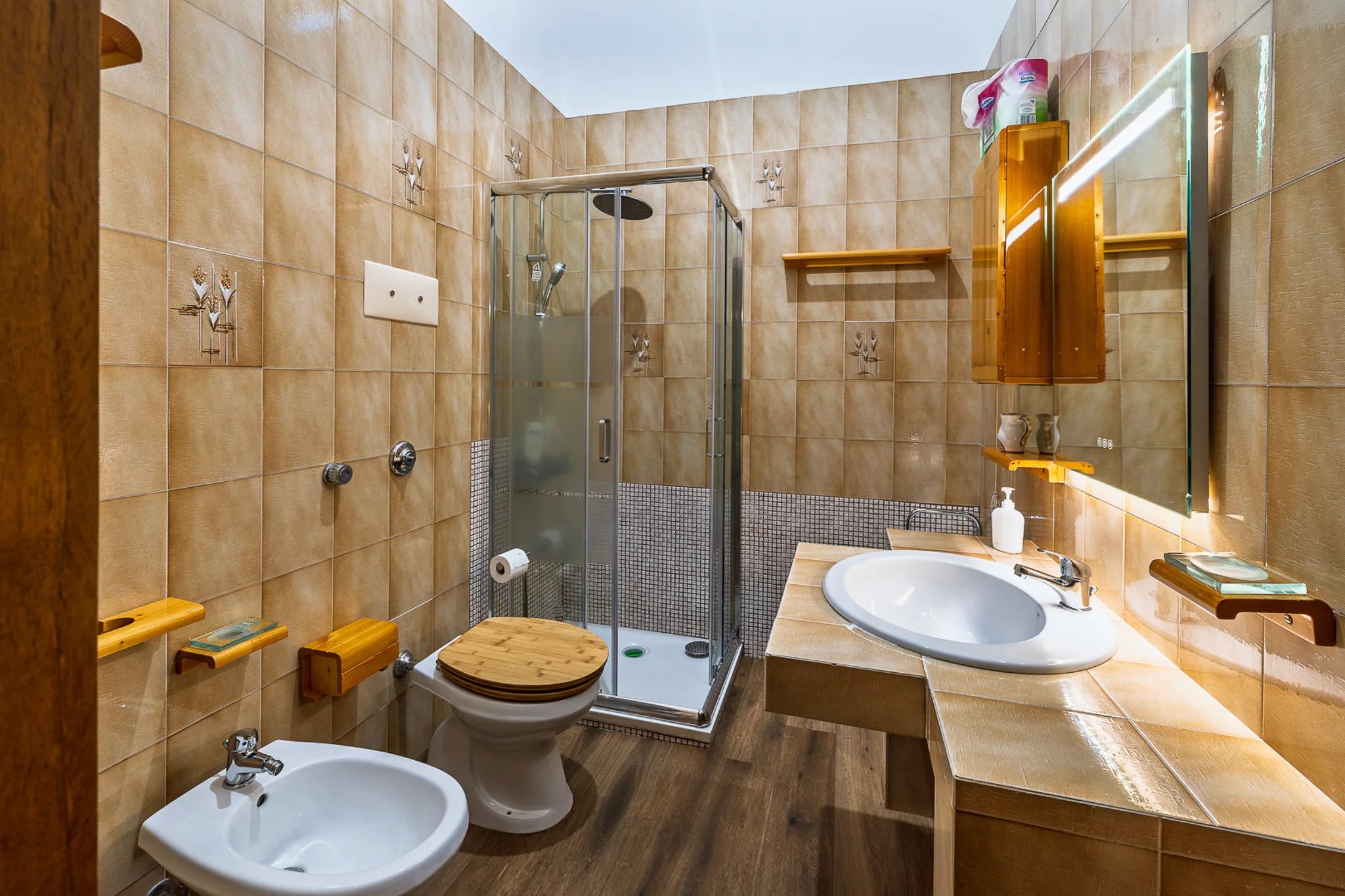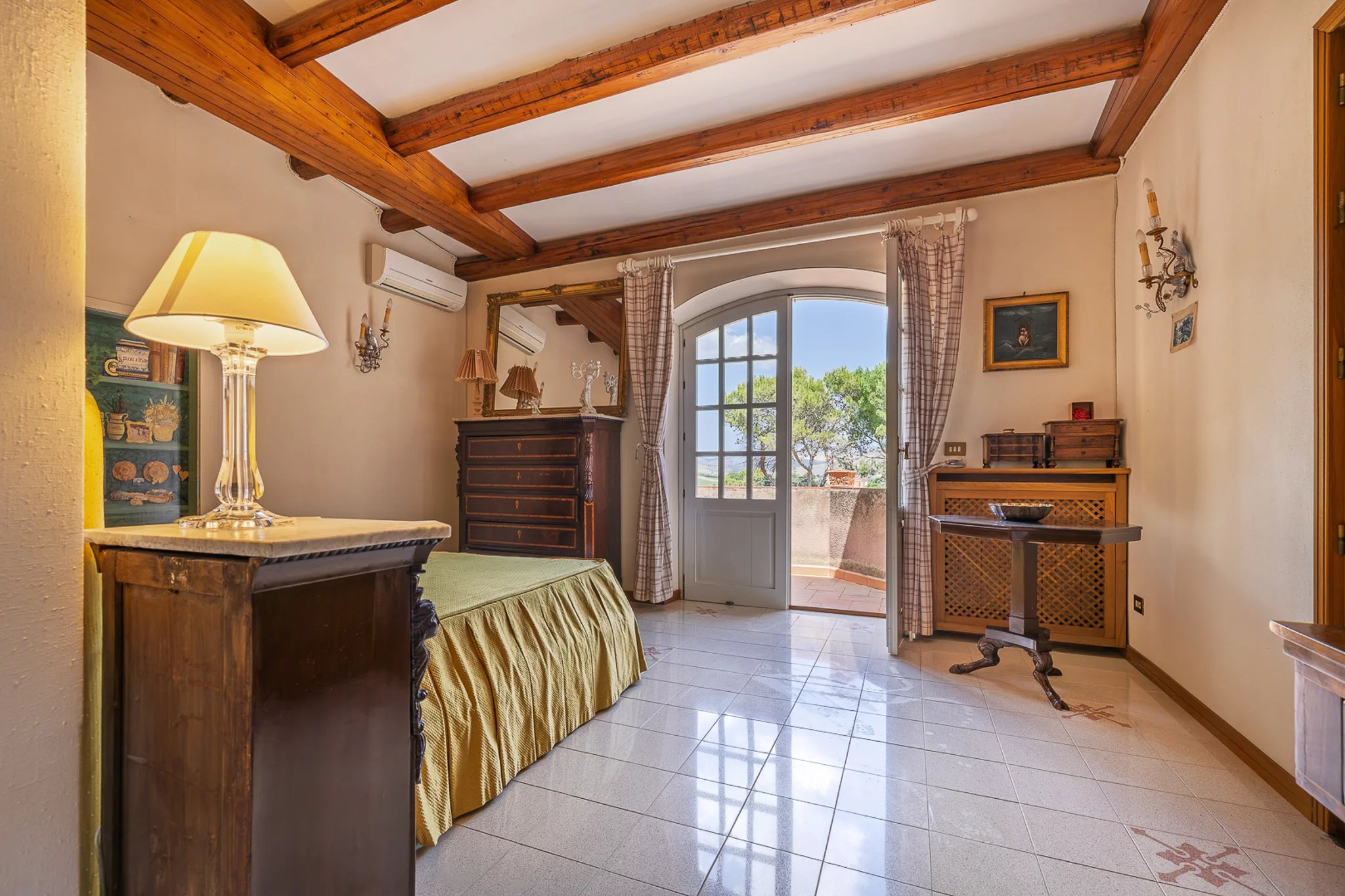 Im Erdgeschoss befinden sich zwei Schlafzimmer mit eigenem Bad, die Komfort und Privatsphäre bieten, während im Obergeschoss drei weitere Schlafzimmer mit sichtbaren Holzbalkendecken, eigenen Badezimmern und – in zwei Fällen – privaten Terrassen mit Panoramablick über die Landschaft der Provinz Trapani ausgestattet sind.