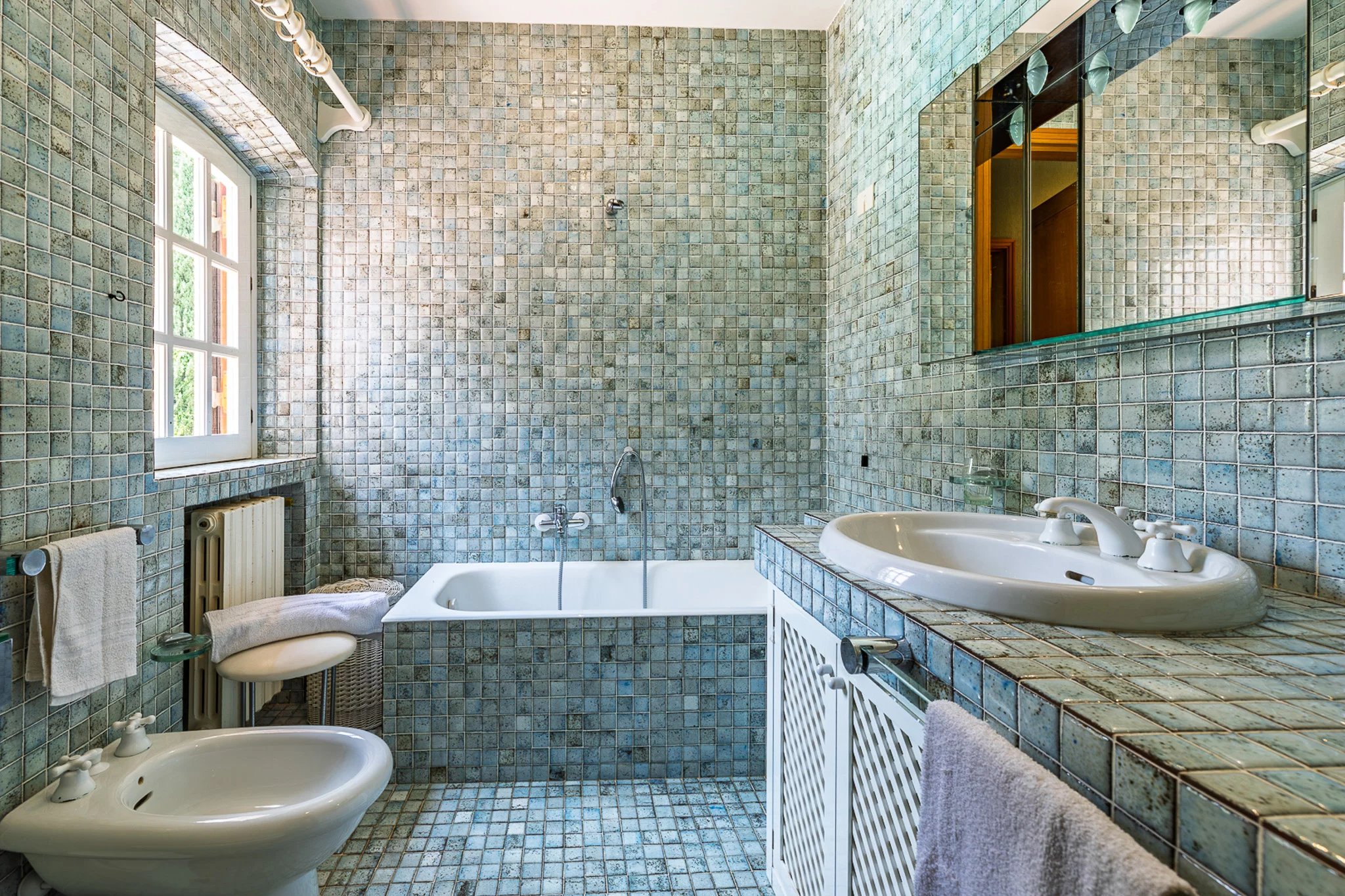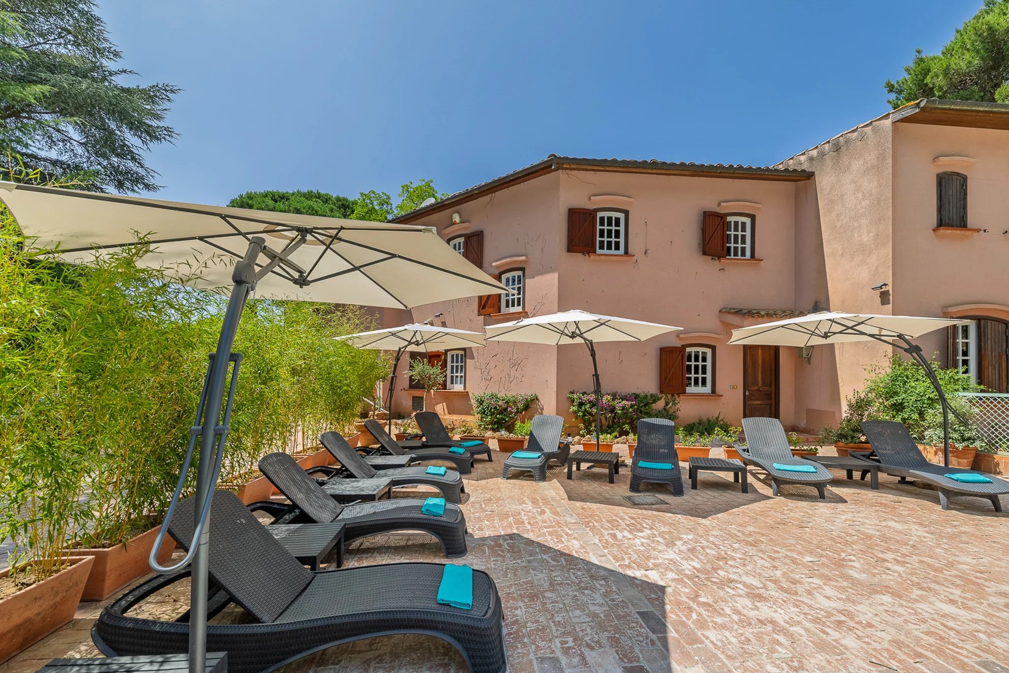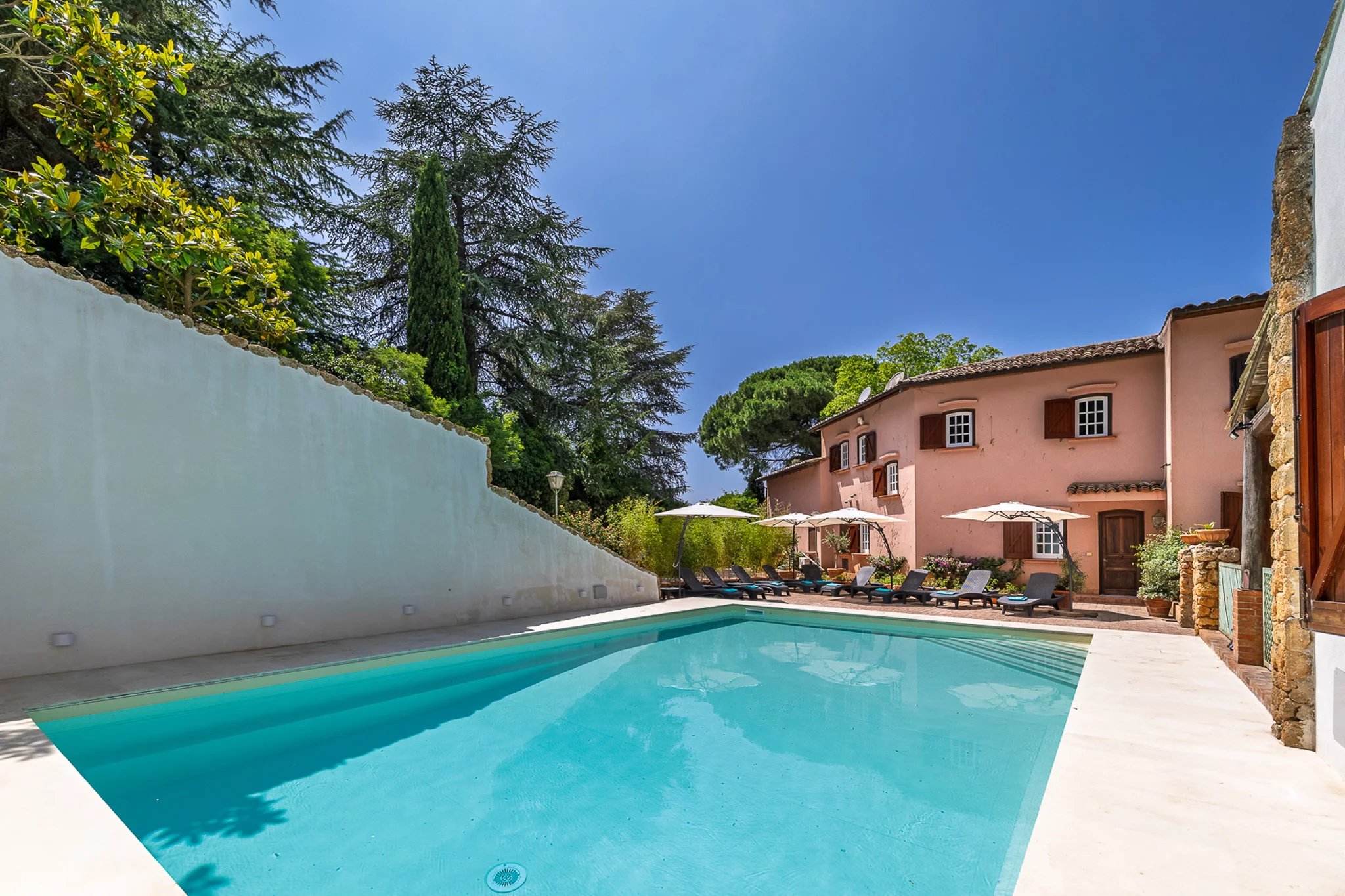 Auch die Außenbereiche sind außergewöhnlich. Von der Terrasse aus fällt das Gelände sanft zu einem 10 × 6 m großen Swimmingpool mit Solarium, Hydromassage-Jacuzzi und Daybeds ab.
