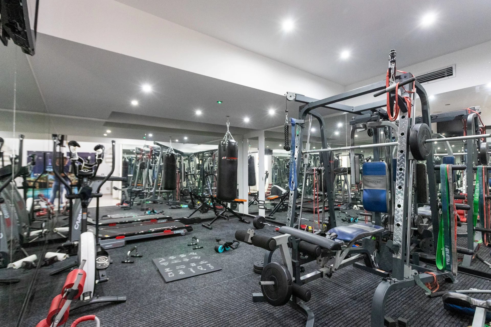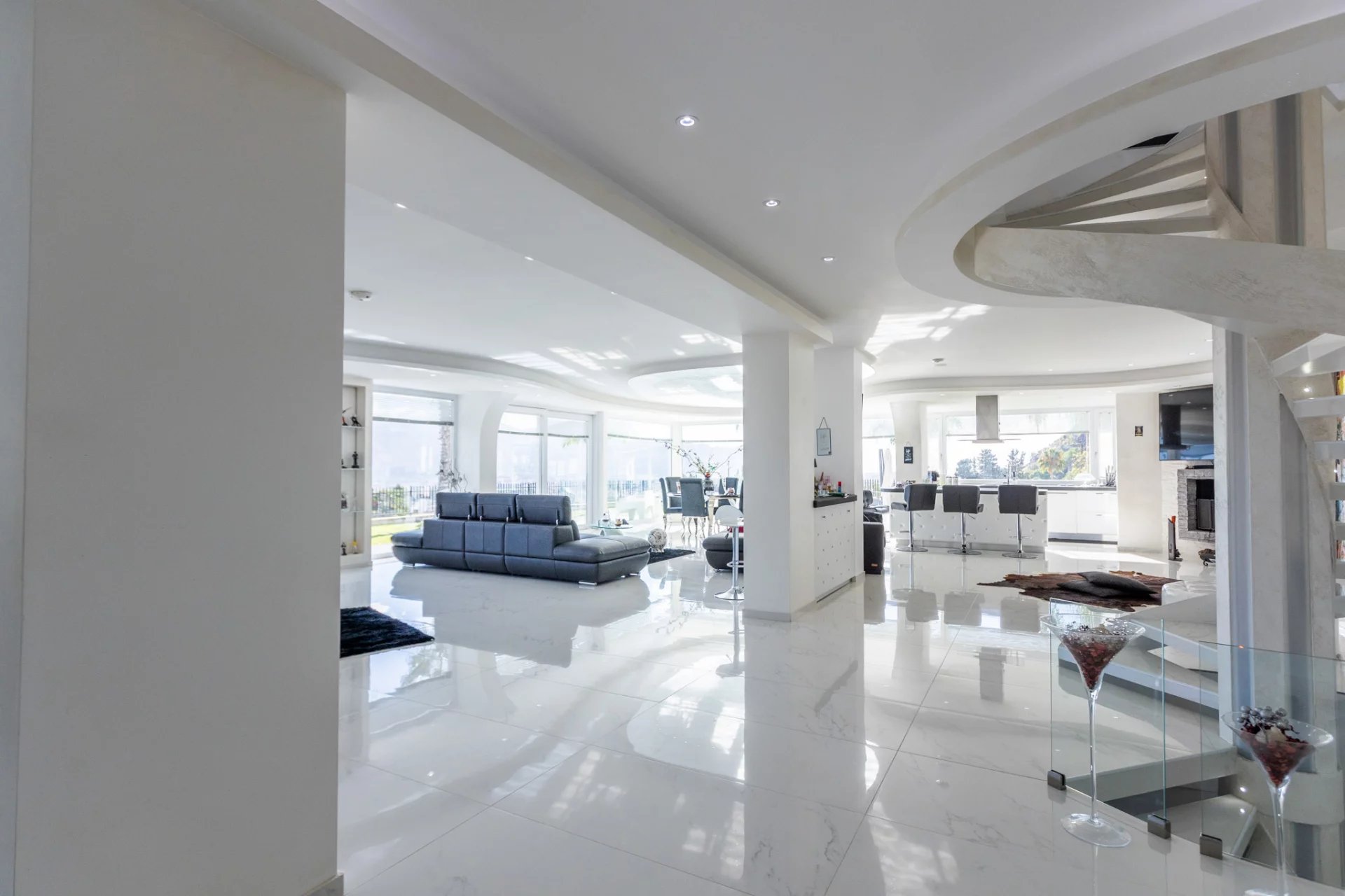 Wenn Sie lieber drinnen bleiben möchten, haben Sie die Wahl zwischen dem voll verspiegelten und mit einem gepolsterten Boden ausgestatteten Fitnessraum oder dem Wellnesscenter mit Whirlpool und Sauna. Oder verbringen Sie Zeit mit Ihren Liebsten auf die entspannteste Art und Weise im fantastischen offenen Wohnzimmer mit Einbauküche, offenem Kamin und natürlichem Licht, das von allen Seiten einfällt.