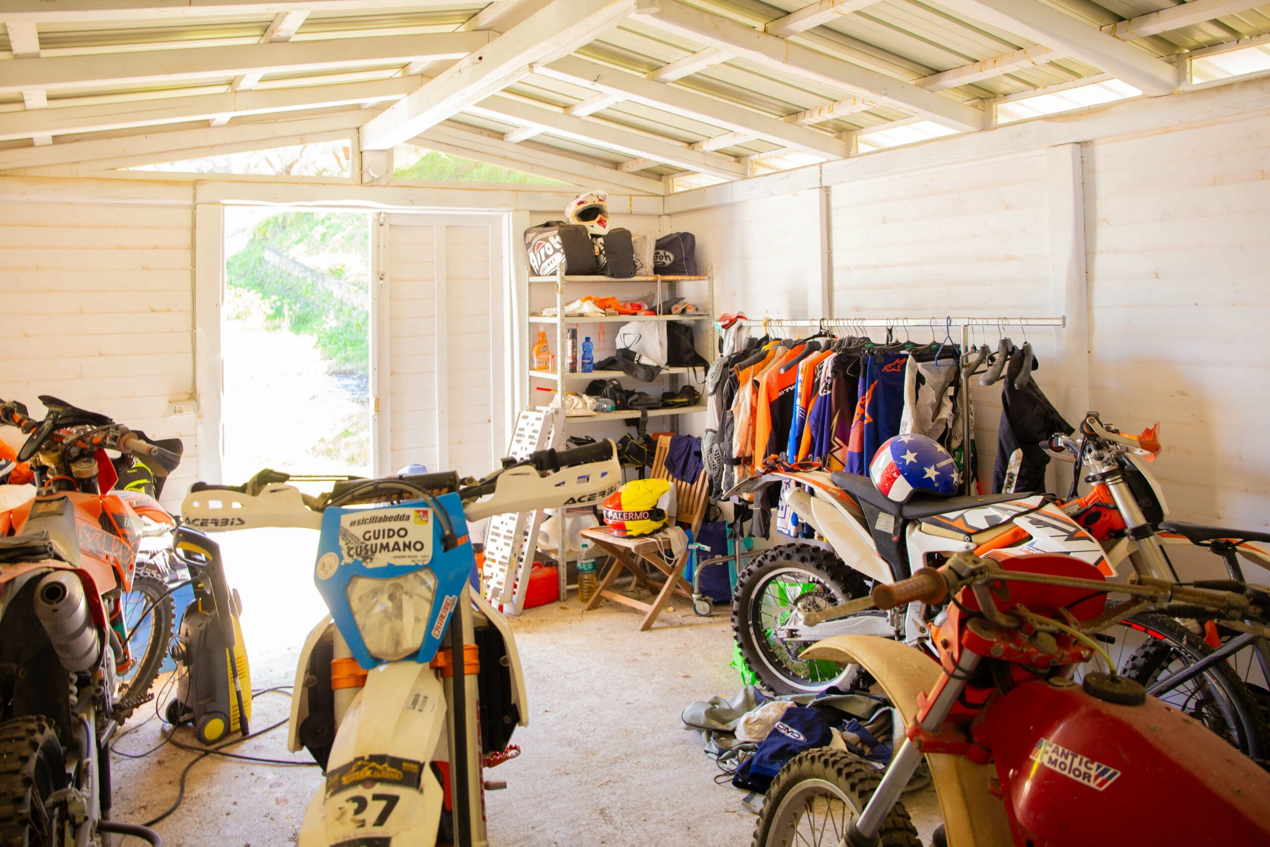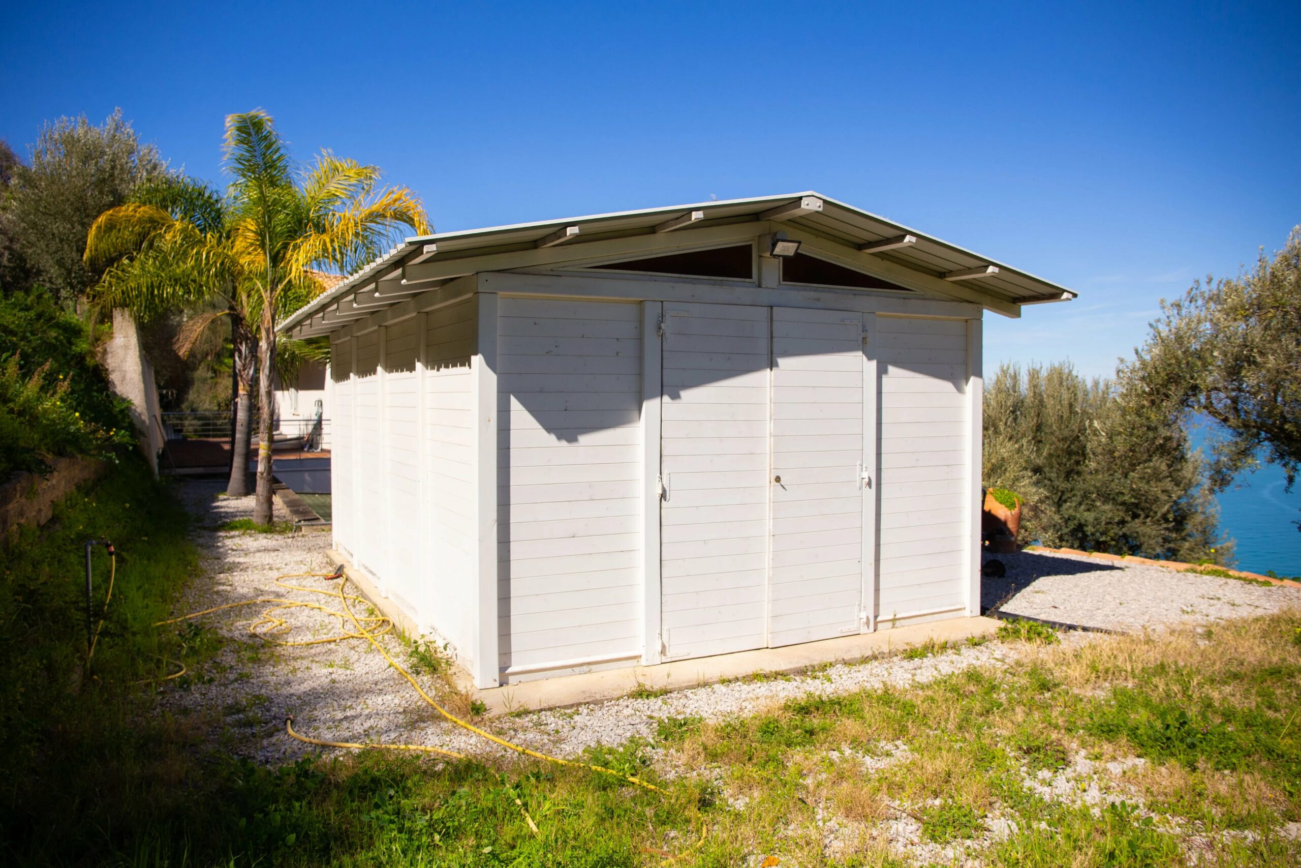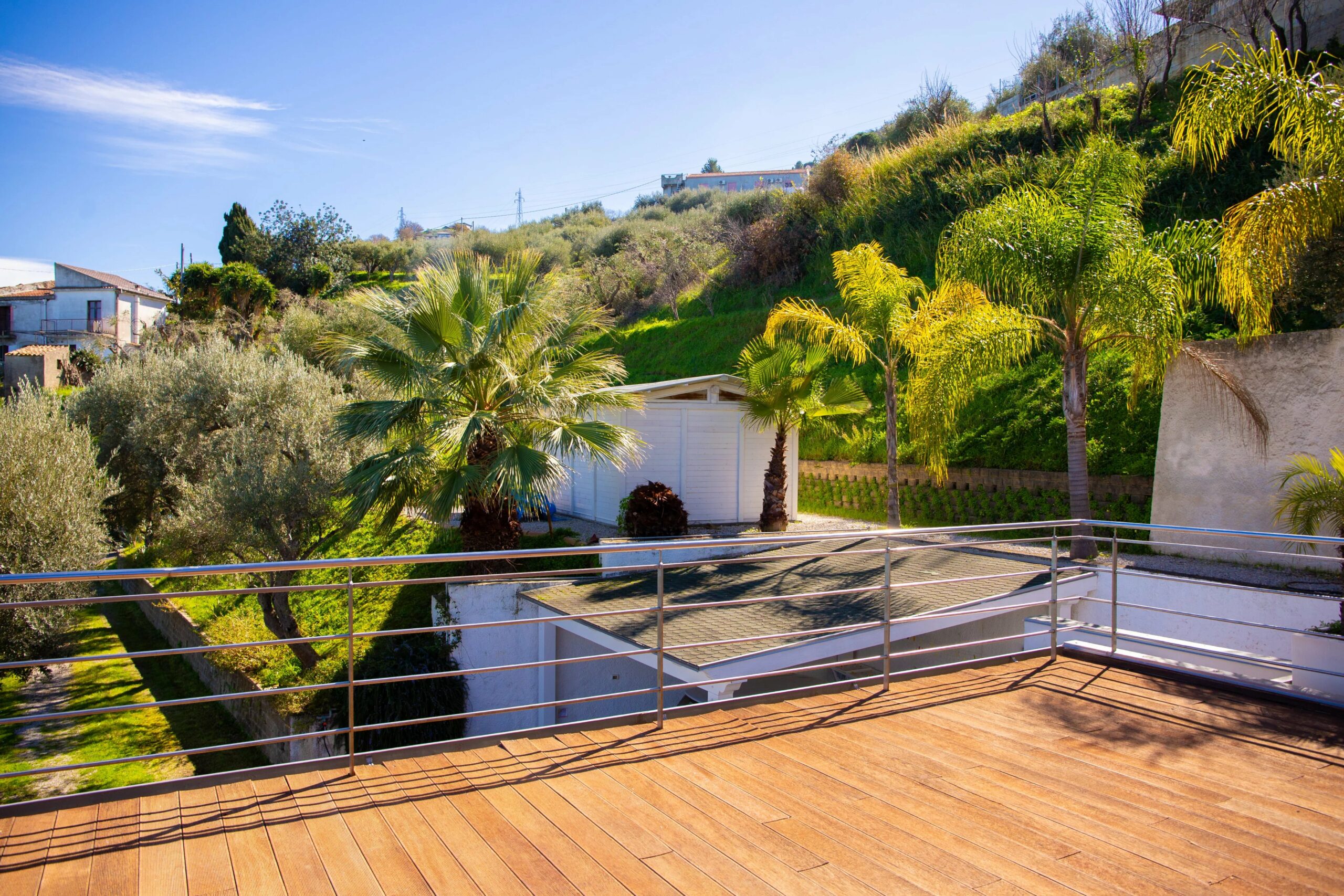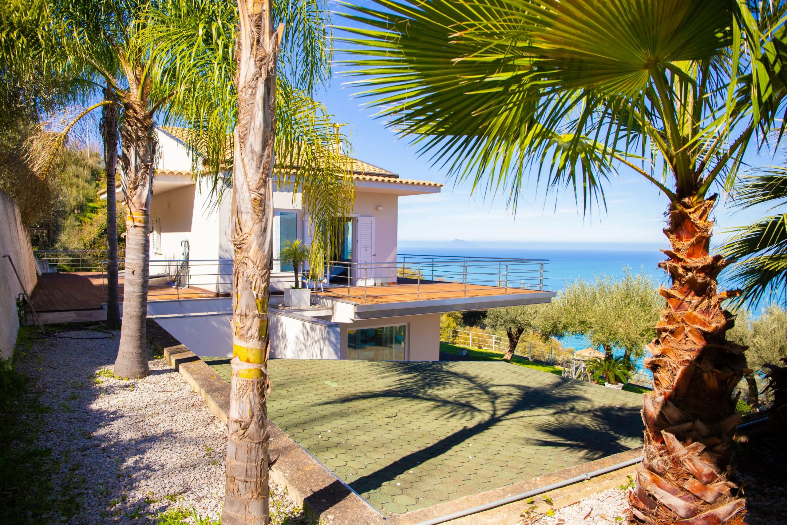 Draußen ist das Grundstück ein mediterranes Paradies. Auf der nordwestlichen Seite des Grundstücks rahmen eine Terrasse mit unregelmäßigem Pflaster und ein Stück gepflegter Rasen den Infinity-Pool ein, dessen Rand sich scheinbar im Meer dahinter auflöst. Dies ist ein wahrhaft filmreifer Effekt. Entlang dieser Terrasse wurde reichlich Platz für einen Grillbereich oder einen Holzofen gelassen. Auf der anderen Seite der Villa befinden sich ein überdachter Carport und ein Motorradstellplatz neben einem praktischen Geräteschuppen. Dieser wurde legal und mit allen erforderlichen Genehmigungen errichtet – was in Sizilien nicht selbstverständlich ist.
