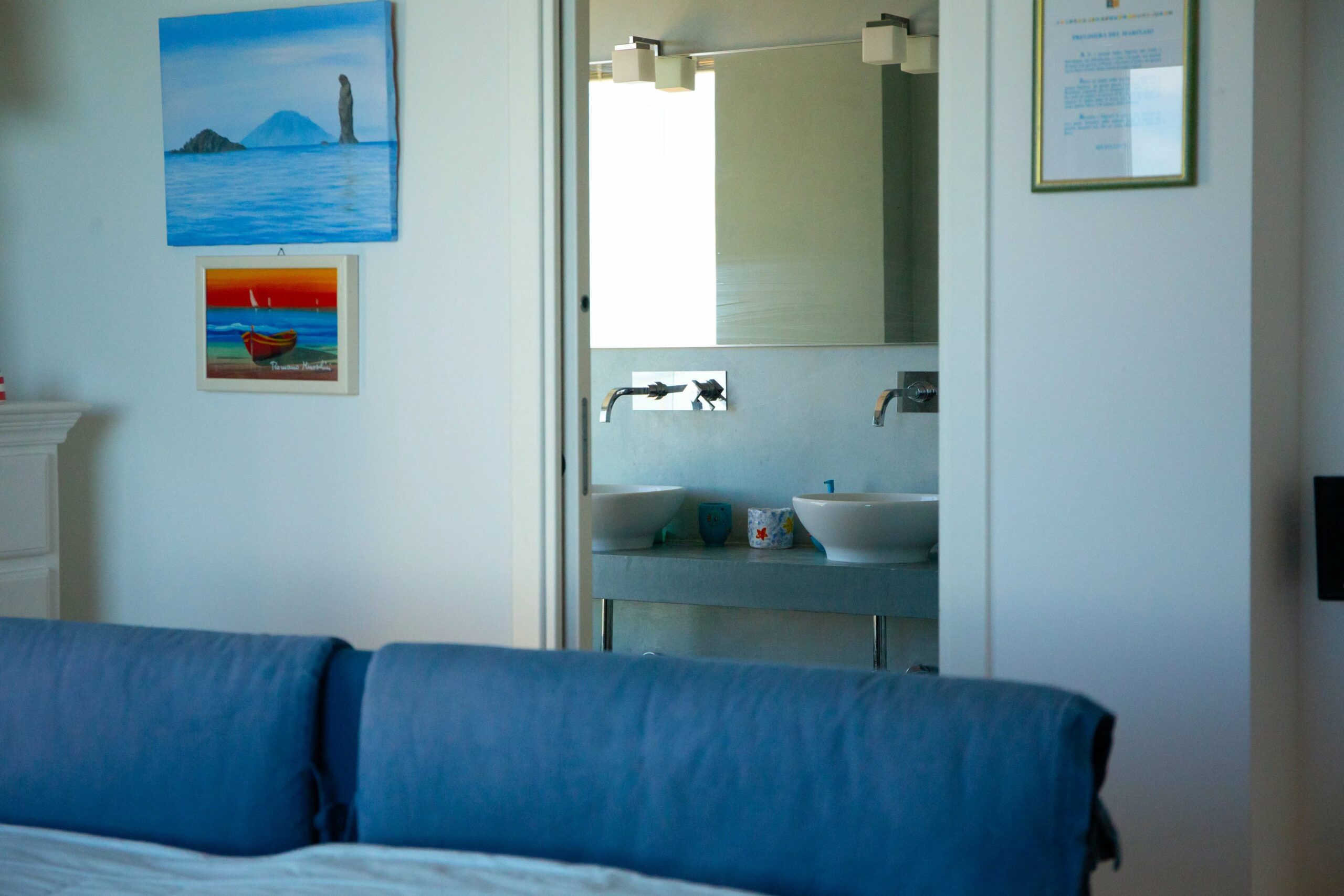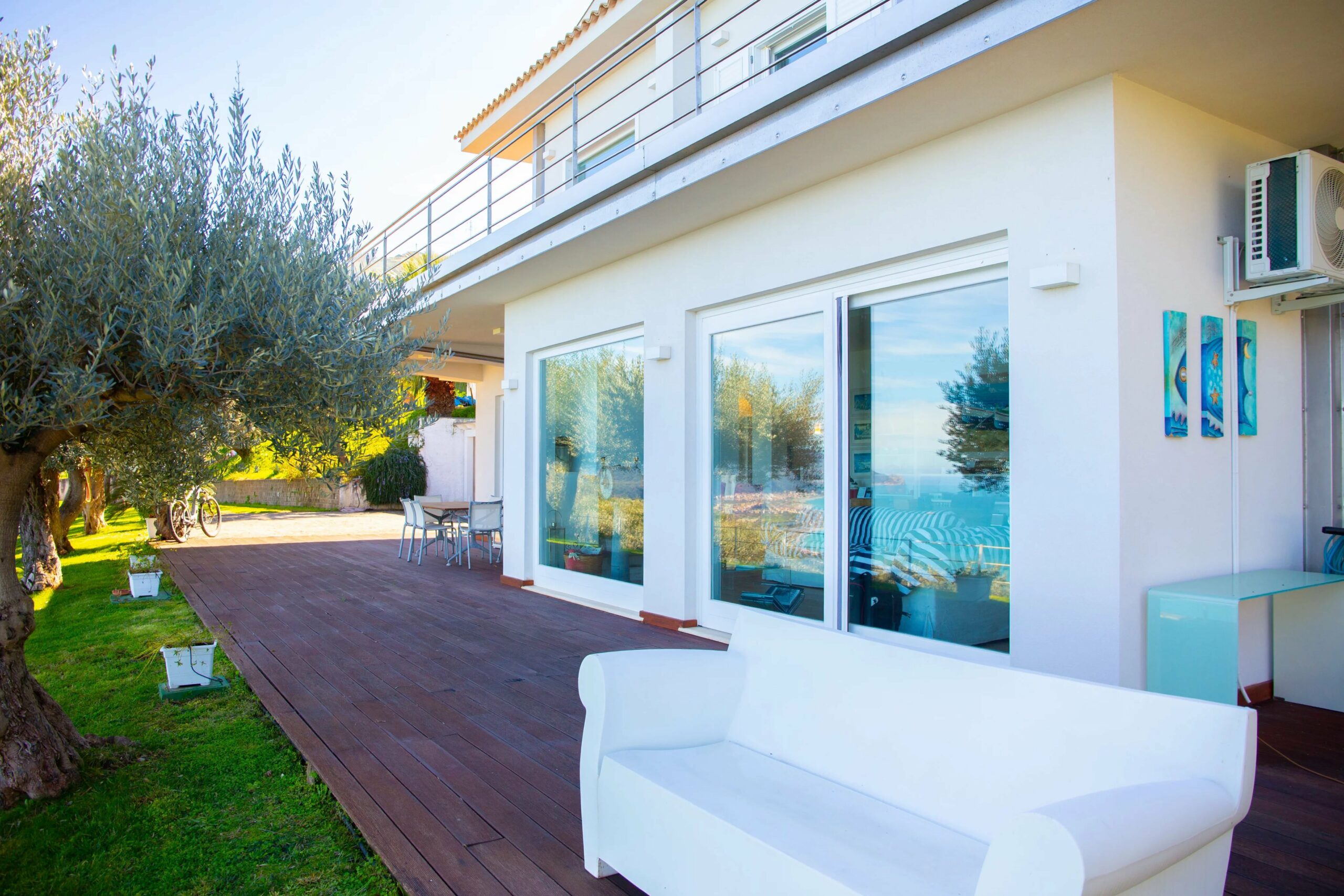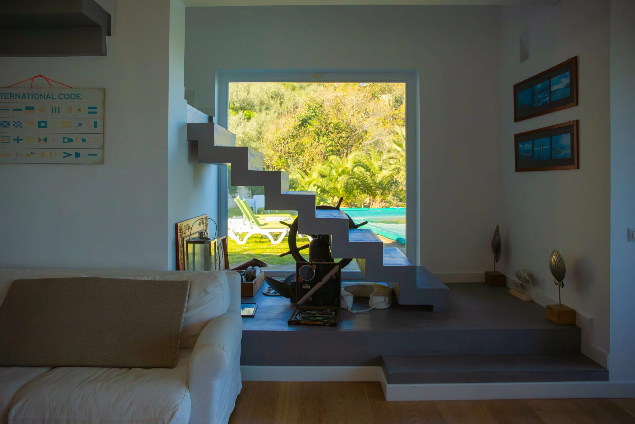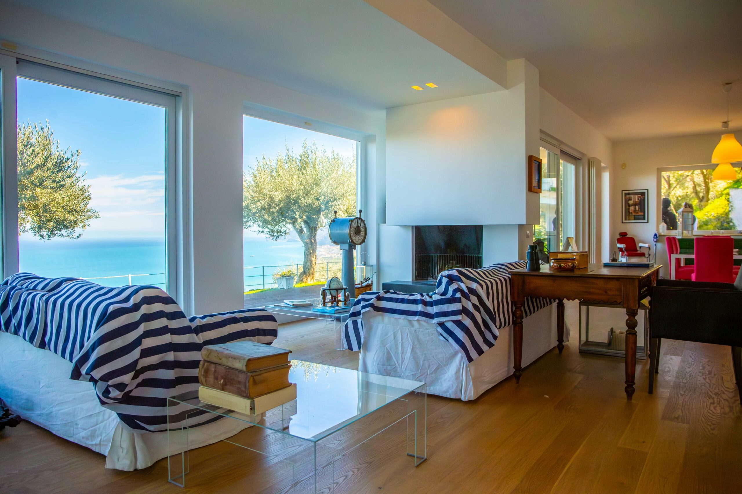 Das Erdgeschoss wird von einem weitläufigen, offenen Wohnbereich dominiert, dessen monumentale Fenster mit Meerblick das charakteristische Merkmal des Hauses sind. Raumhohe Fenster holen das Panorama ins Innere und schaffen ein fast maritimes Gefühl, bei dem man manchmal glauben könnte, auf der Brücke eines Schiffes zu stehen. Dies ist das Beste der modernen sizilianischen Architektur – unaufdringlich, aber dennoch auffällig im Dienste ihrer Umgebung.