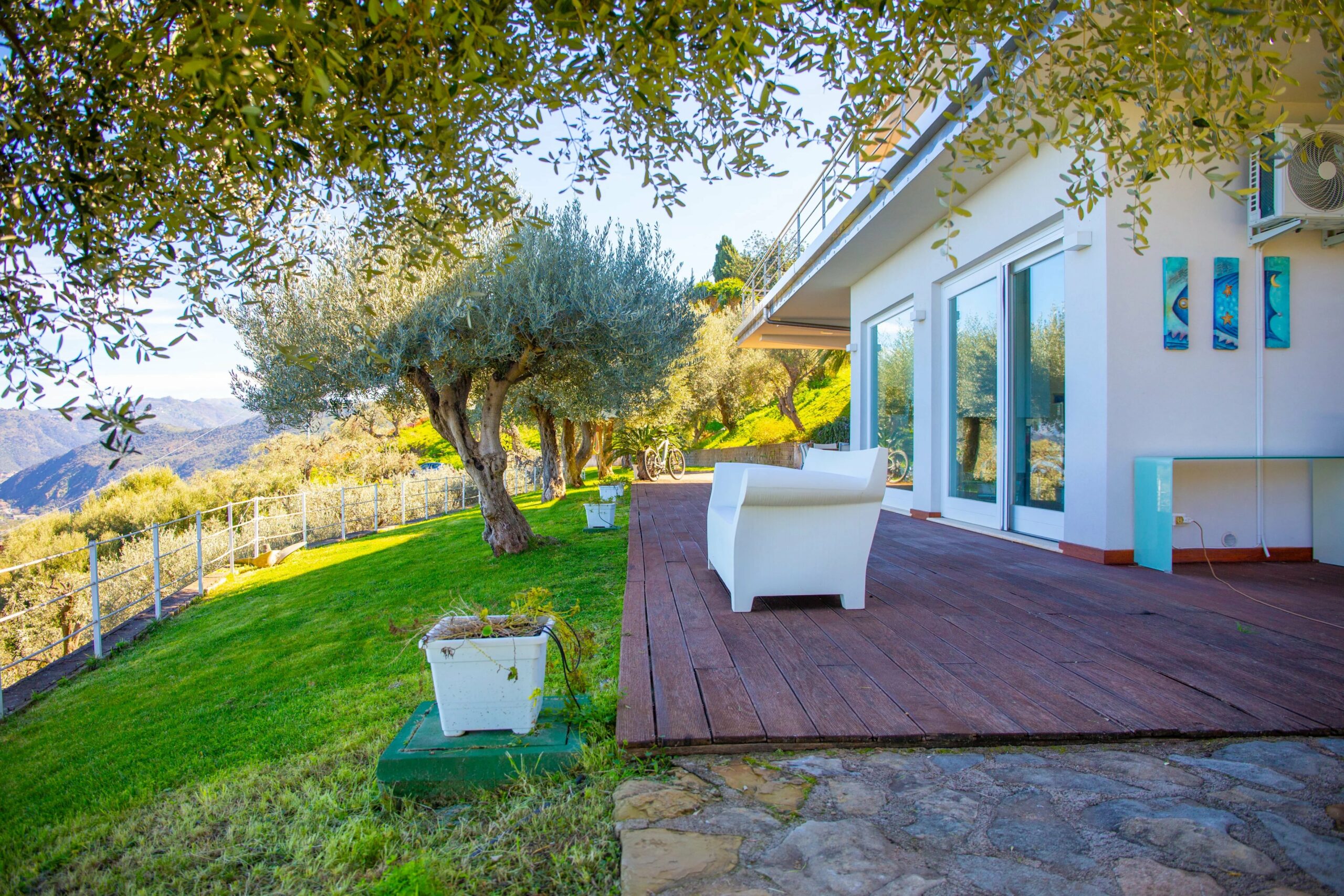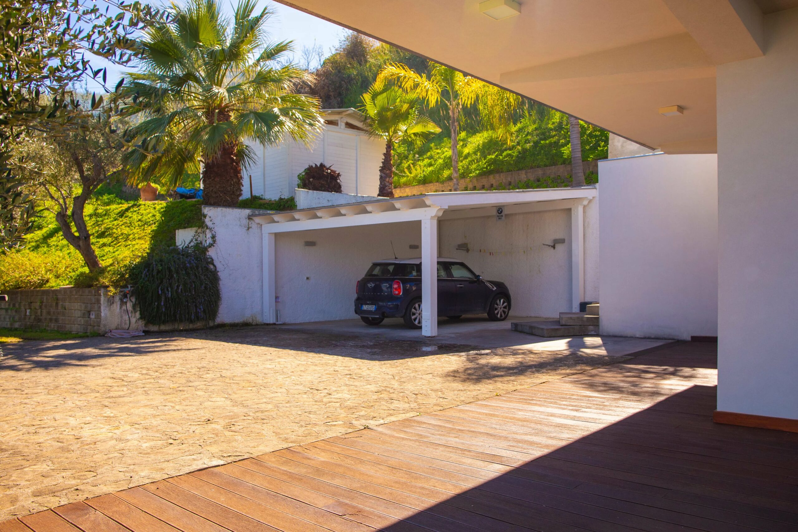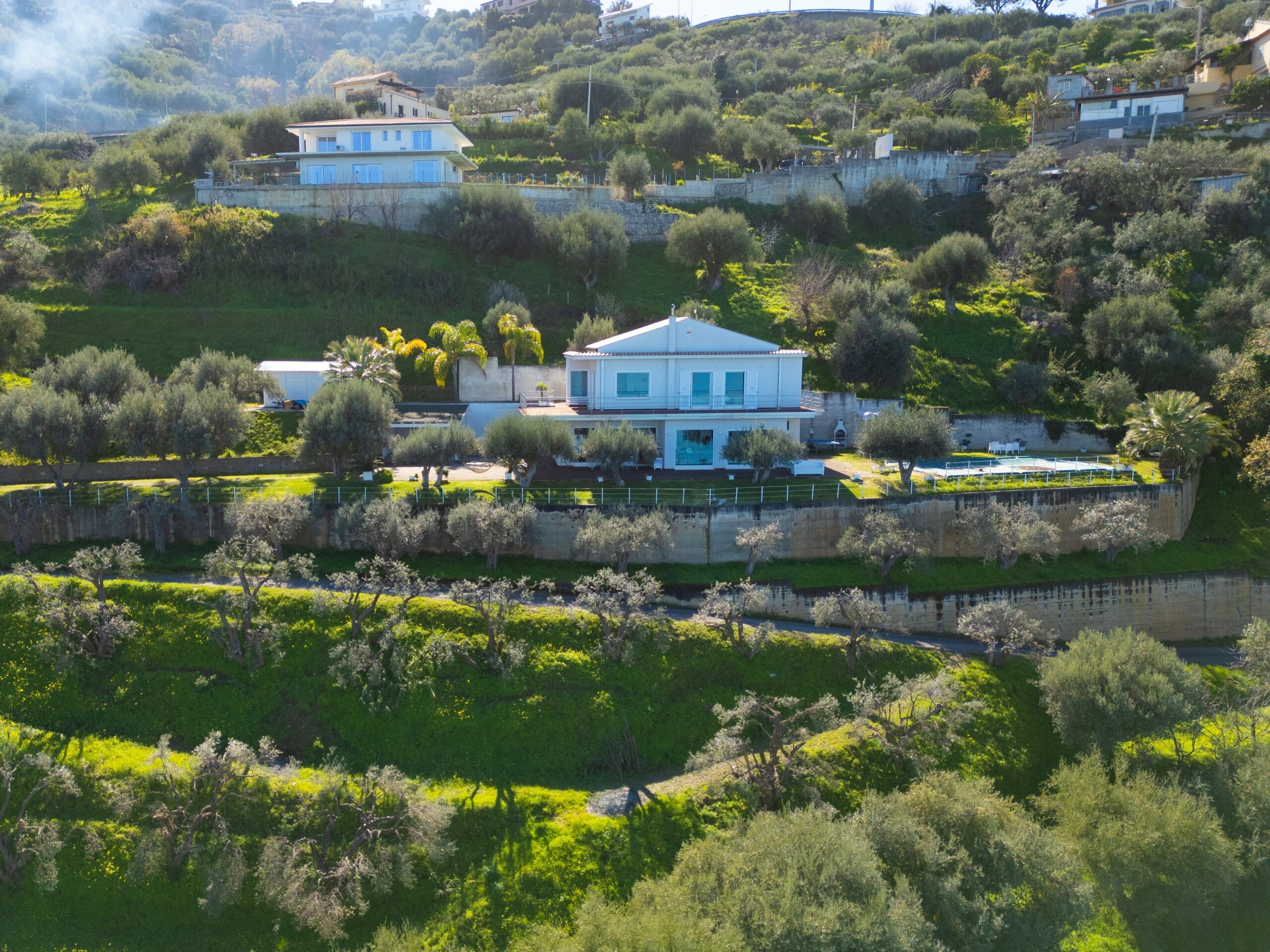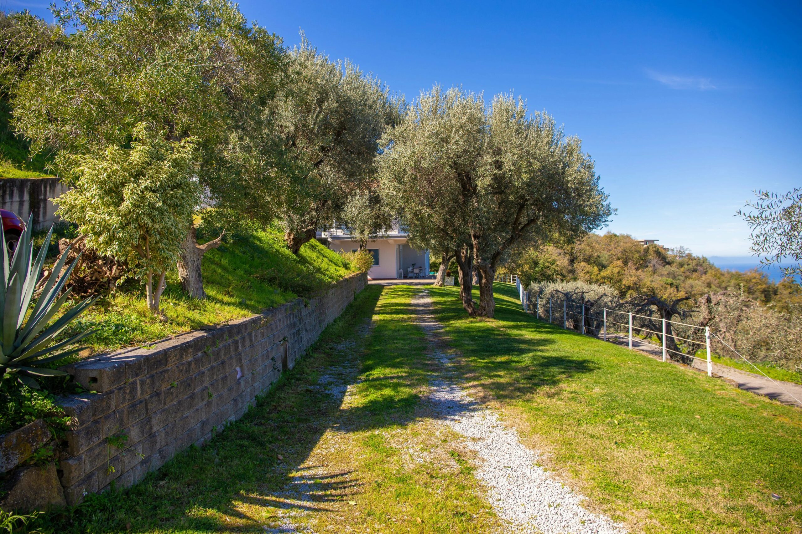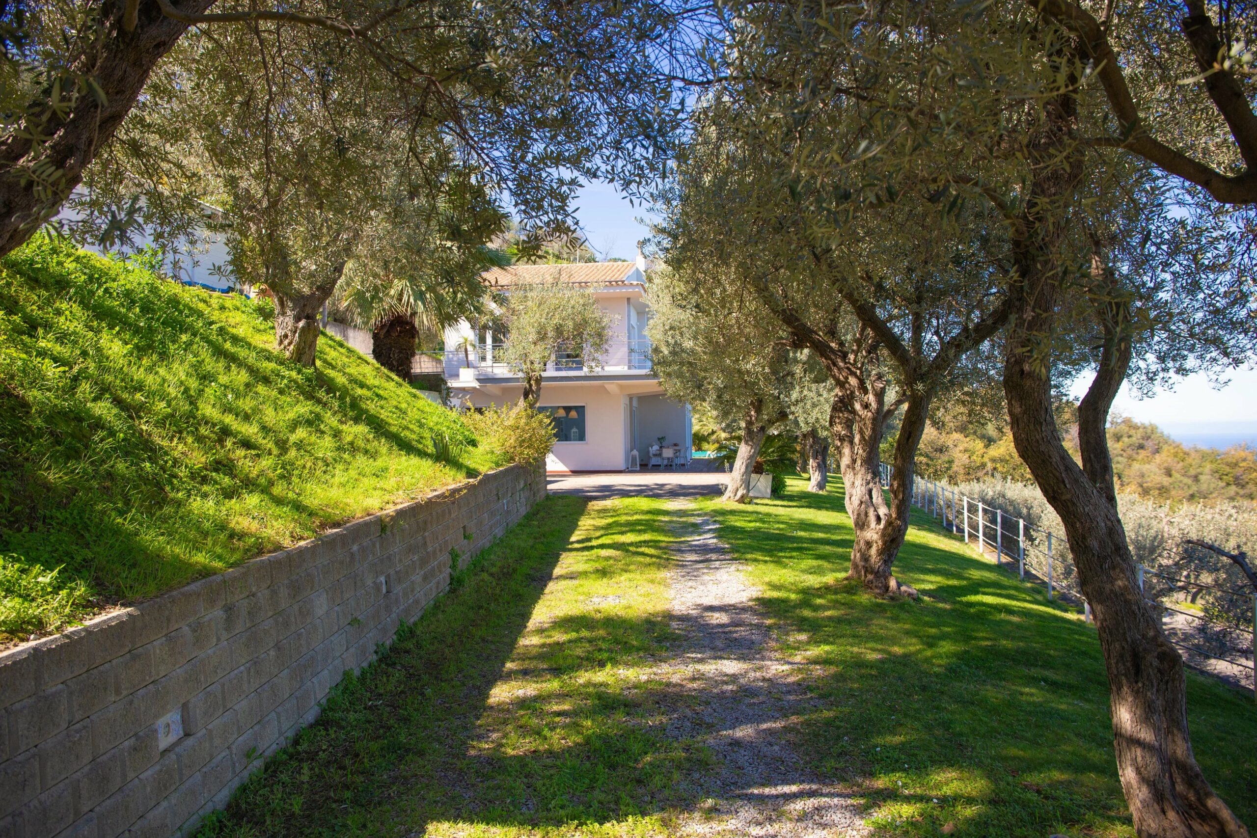 Die von Bäumen gesäumte Zufahrtsstraße ist in ausgezeichnetem Zustand, und über vierzig Olivenbäume und Zierpalmen verleihen dem Anwesen den üppigen, gewachsenen Charakter einer Immobilie, die schon viel länger hier steht, als es tatsächlich der Fall ist.