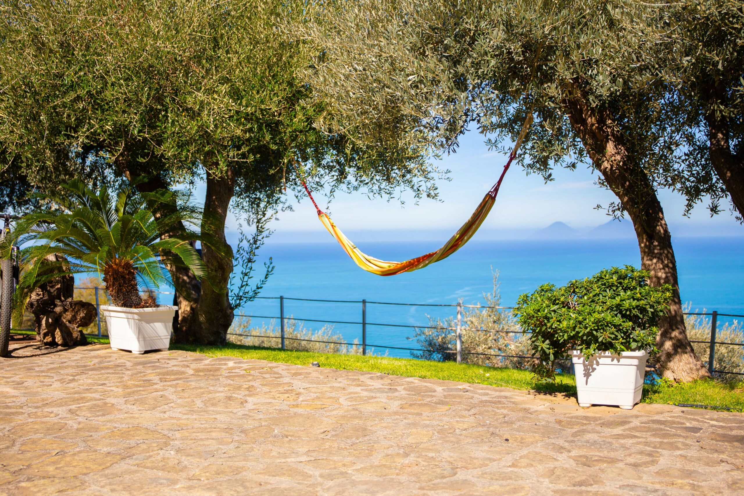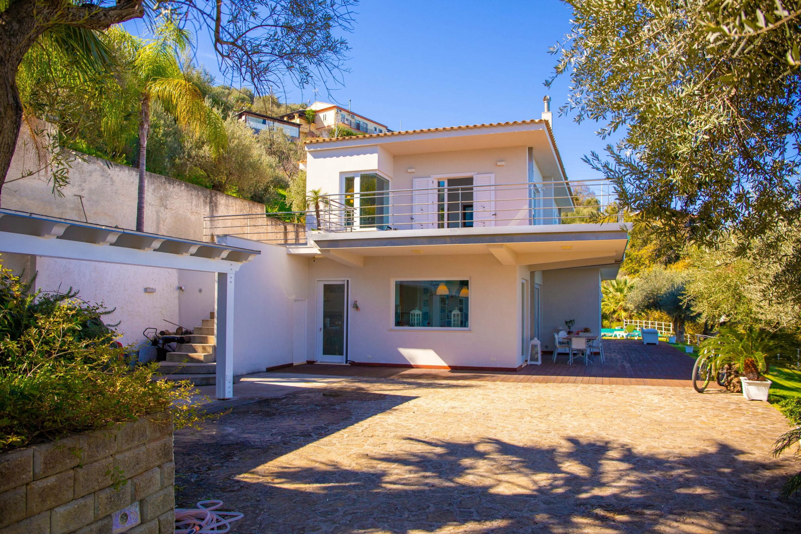 Im Außenbereich werden Sie die 4.500 m² großen, üppigen Gärten lieben, die zur besseren Nutzbarkeit sorgfältig terrassiert und mit über vierzig Olivenbäumen und Zierpalmen bepflanzt wurden. Eine von Bäumen gesäumte Auffahrt führt Sie von der Villa zur öffentlichen Straße, von der aus Sie weniger als vier Kilometer vom Zentrum von Capo d'Orlando und seinem florierenden modernen Yachthafen, den Restaurants und dem Nachtleben entfernt sind. Hinter Ihnen erhebt sich die unbeschreibliche landschaftliche Schönheit von Siziliens größtem Naturpark, den Nebrodi-Bergen. Mit sanften Hügeln im Rücken, frischer Luft vor Ihnen, Wasser 200 m unter Ihnen und Feuer am Horizont im vulkanischen Äolischen Archipel ist dies ein Zuhause für Liebhaber aller Elemente und der freien Natur.