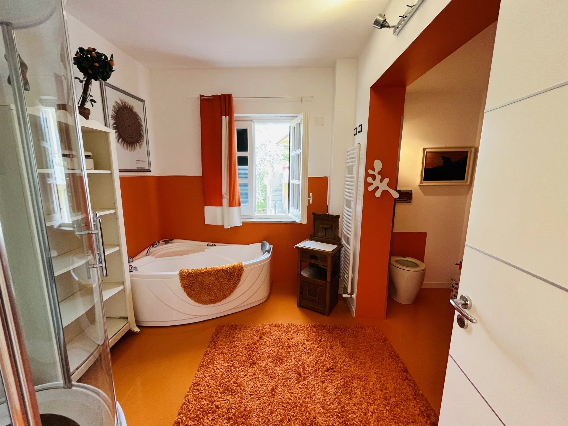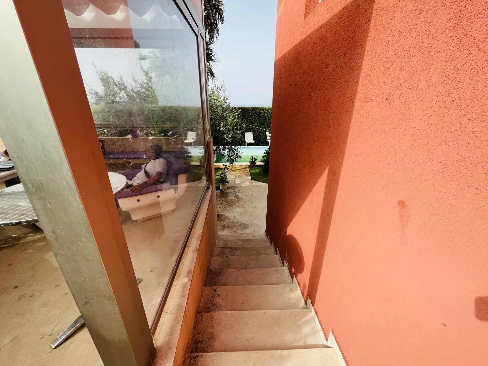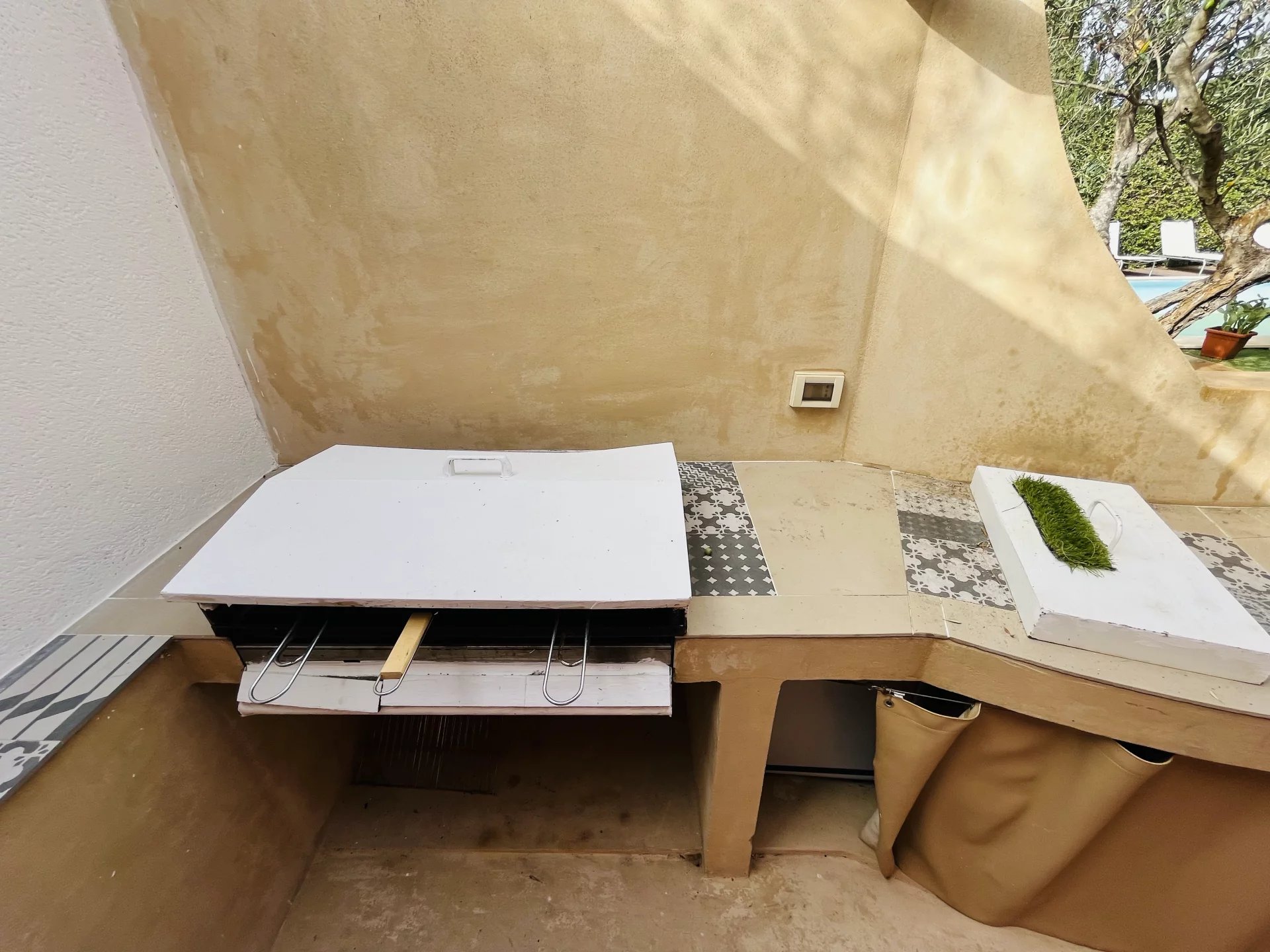 To the rear of the squarish, orange-coloured house a staircase leads you down to the swimming pool, with its little outdoor bathroom and outdoor shower. The wooden deck offers all the space you need for tables and sun loungers. In addition to the pool area and terraces, which are not overlooked by any neighbouring property. Next to this is an outdoor sink and grill, perfect for entertaining in the summer.
