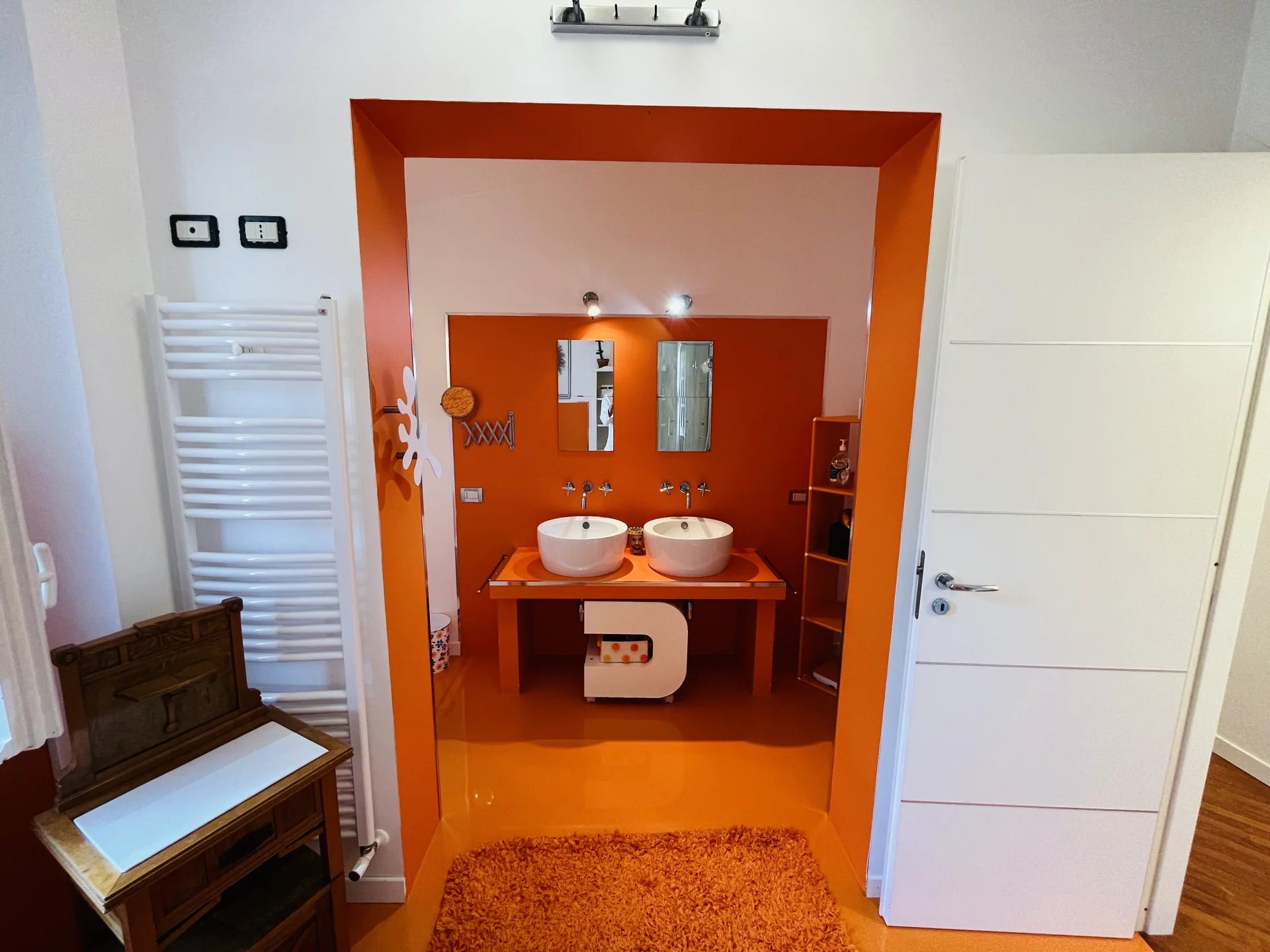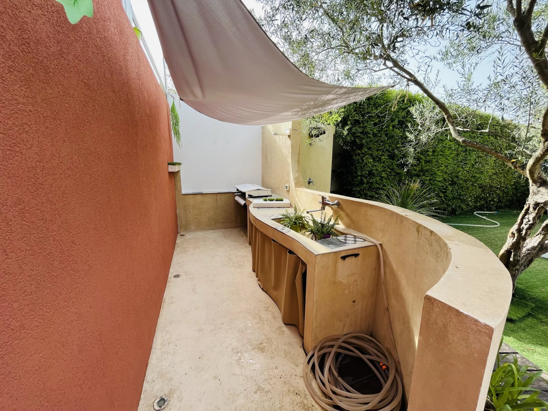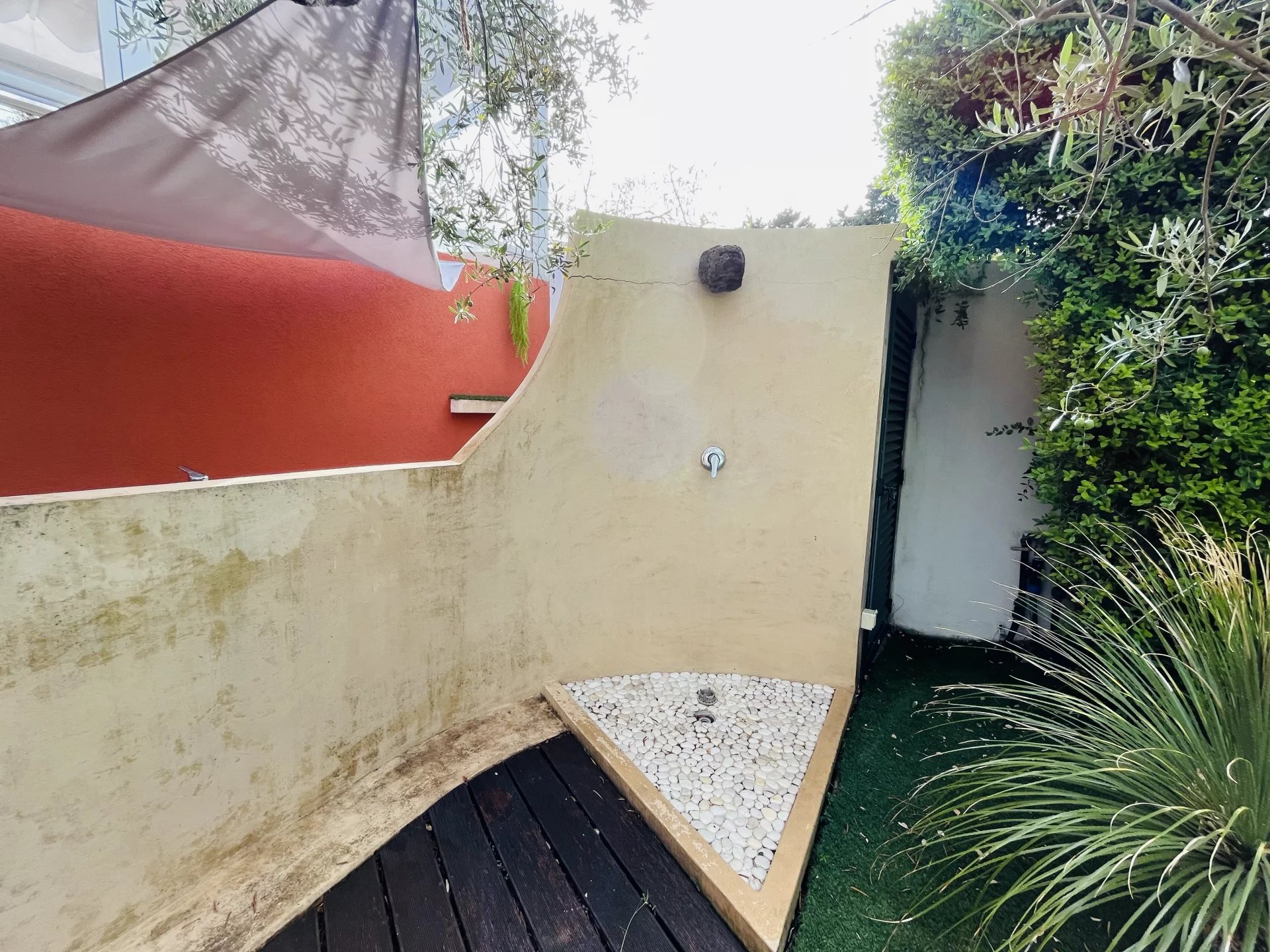To the rear of the squarish, orange-coloured house a staircase leads you down to the swimming pool, with its little outdoor bathroom and outdoor shower. The wooden deck offers all the space you need for tables and sun loungers. In addition to the pool area and terraces, which are not overlooked by any neighbouring property. Next to this is an outdoor sink and grill, perfect for entertaining in the summer.