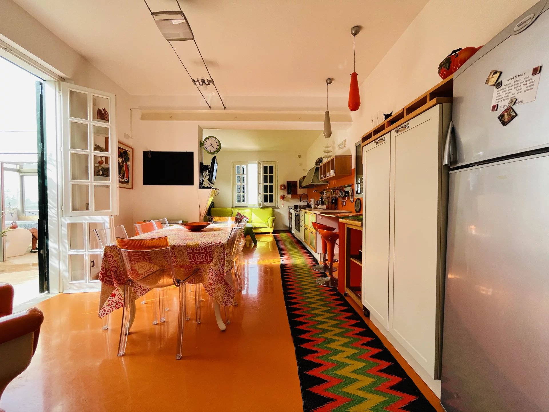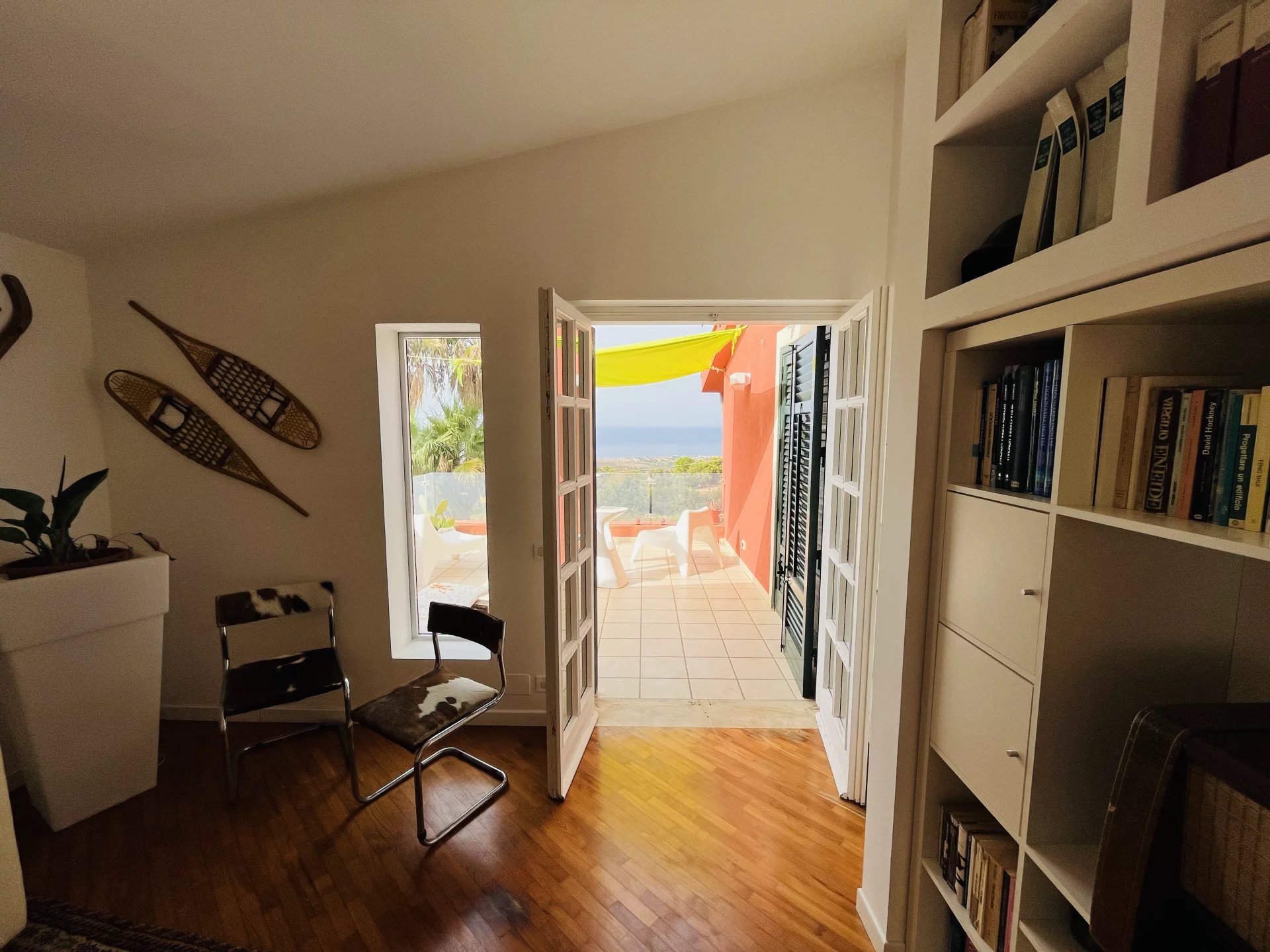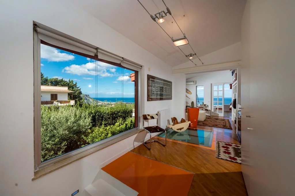 Upstairs, a long hallway runs down the western side of the building, sections of fully glazed wall allowing for both light and heat to floor the space, and the unique touch of a section of glass floor which allows you to look directly down into the entrance hall. A cool study area with fitted bookshelves opens through double French windows onto the small terrace, which offers a fabulous view over the mountainside of Erice to the west and the long slow gulf of the coastline to the north.