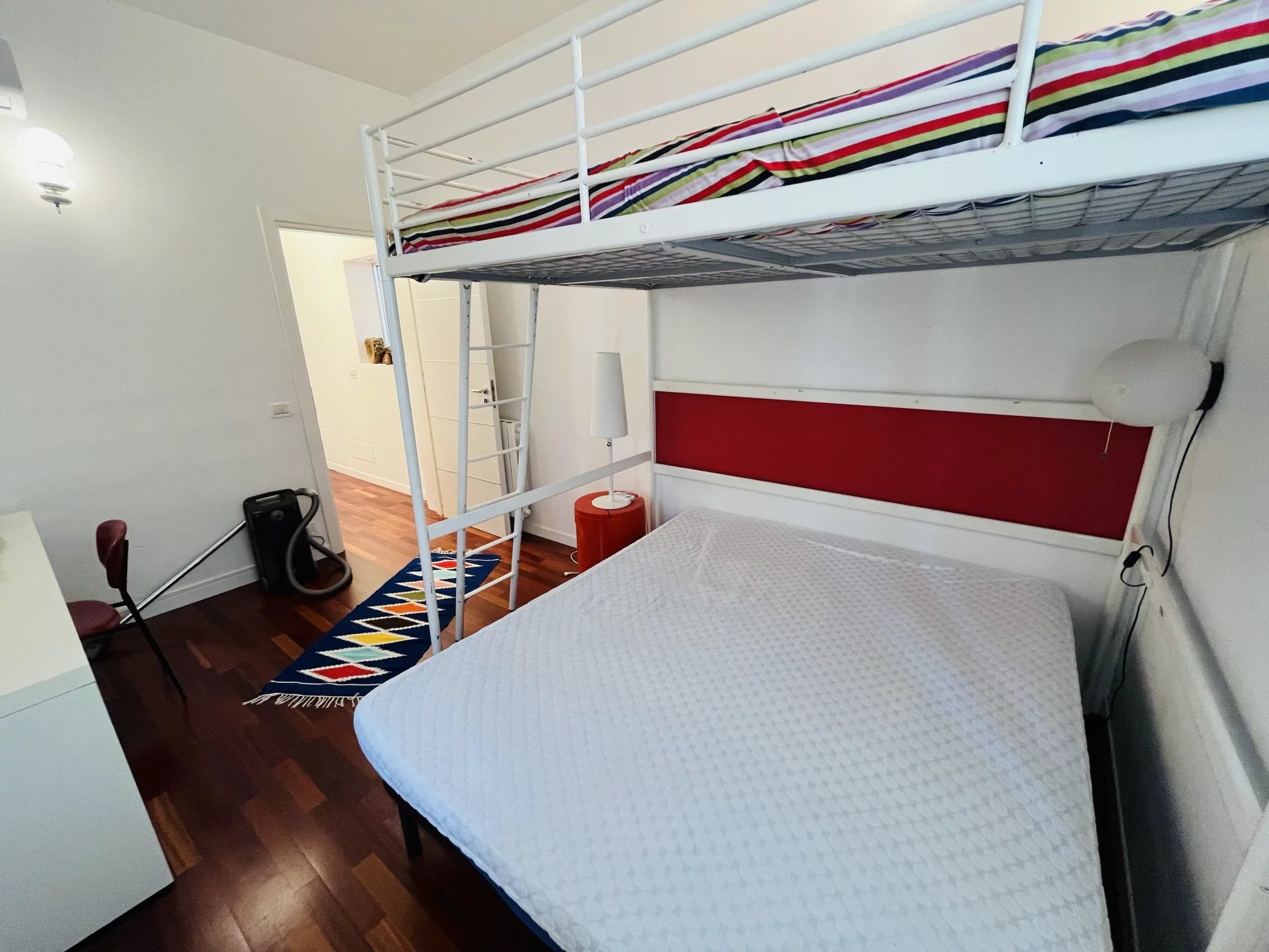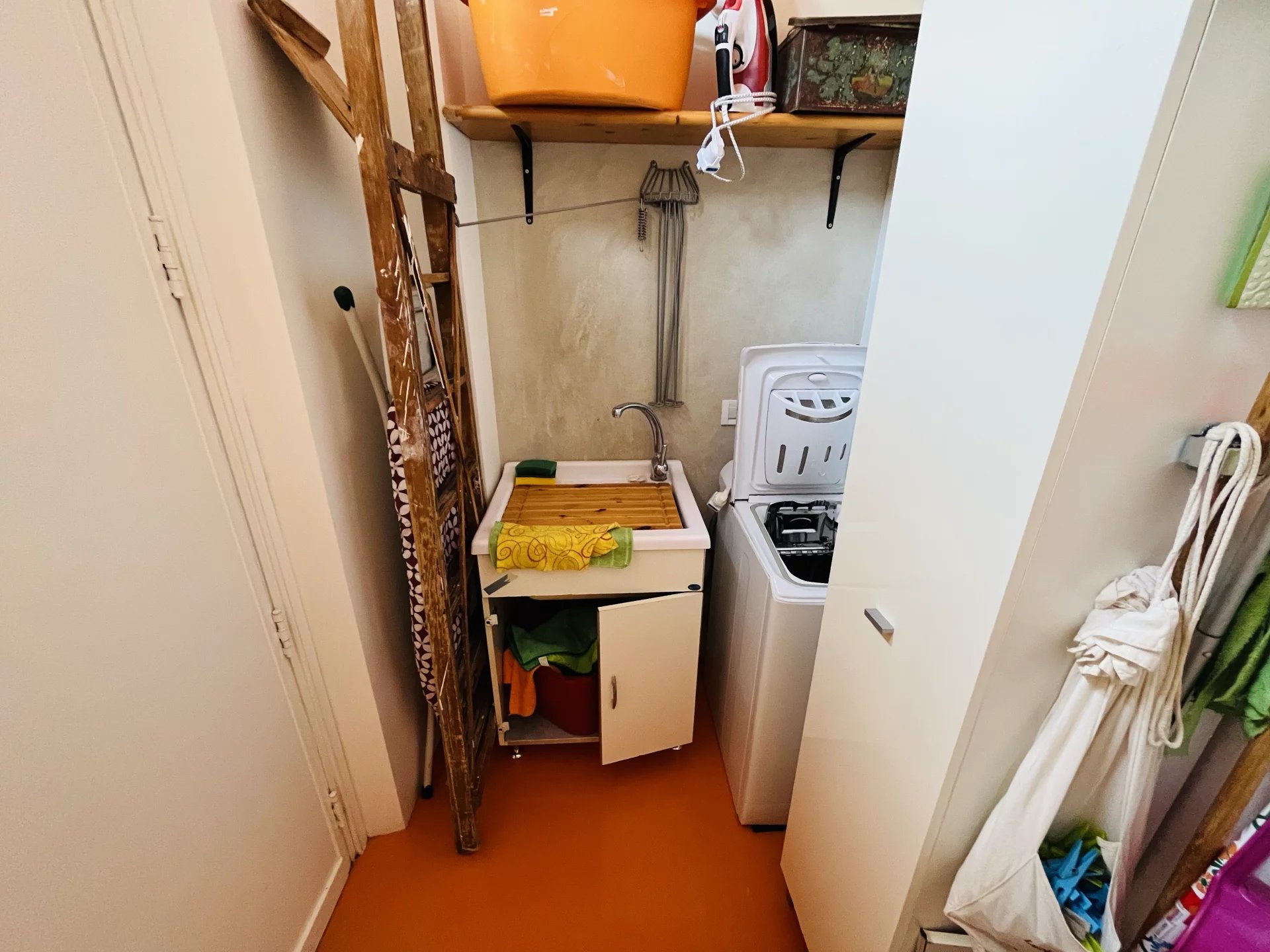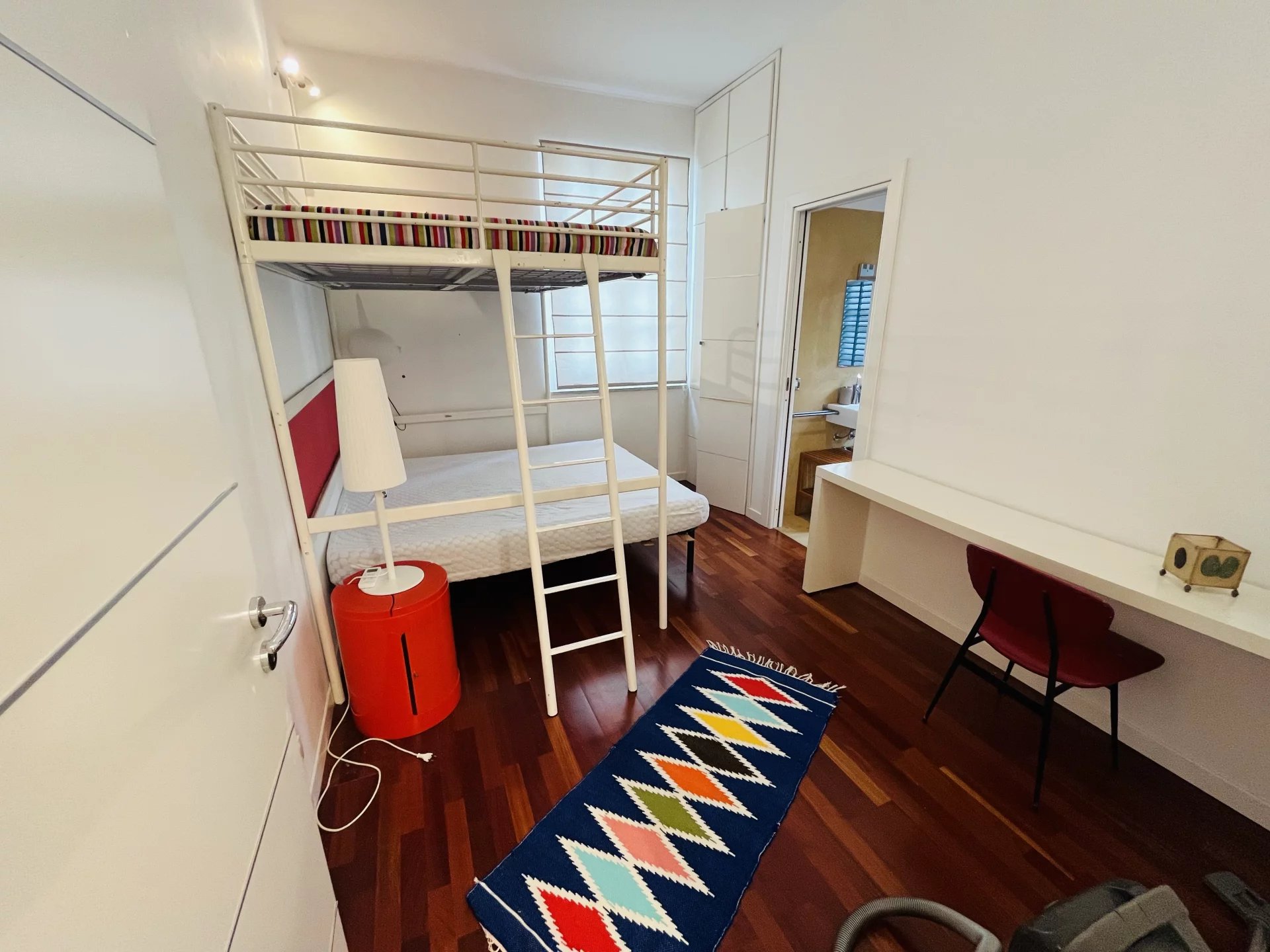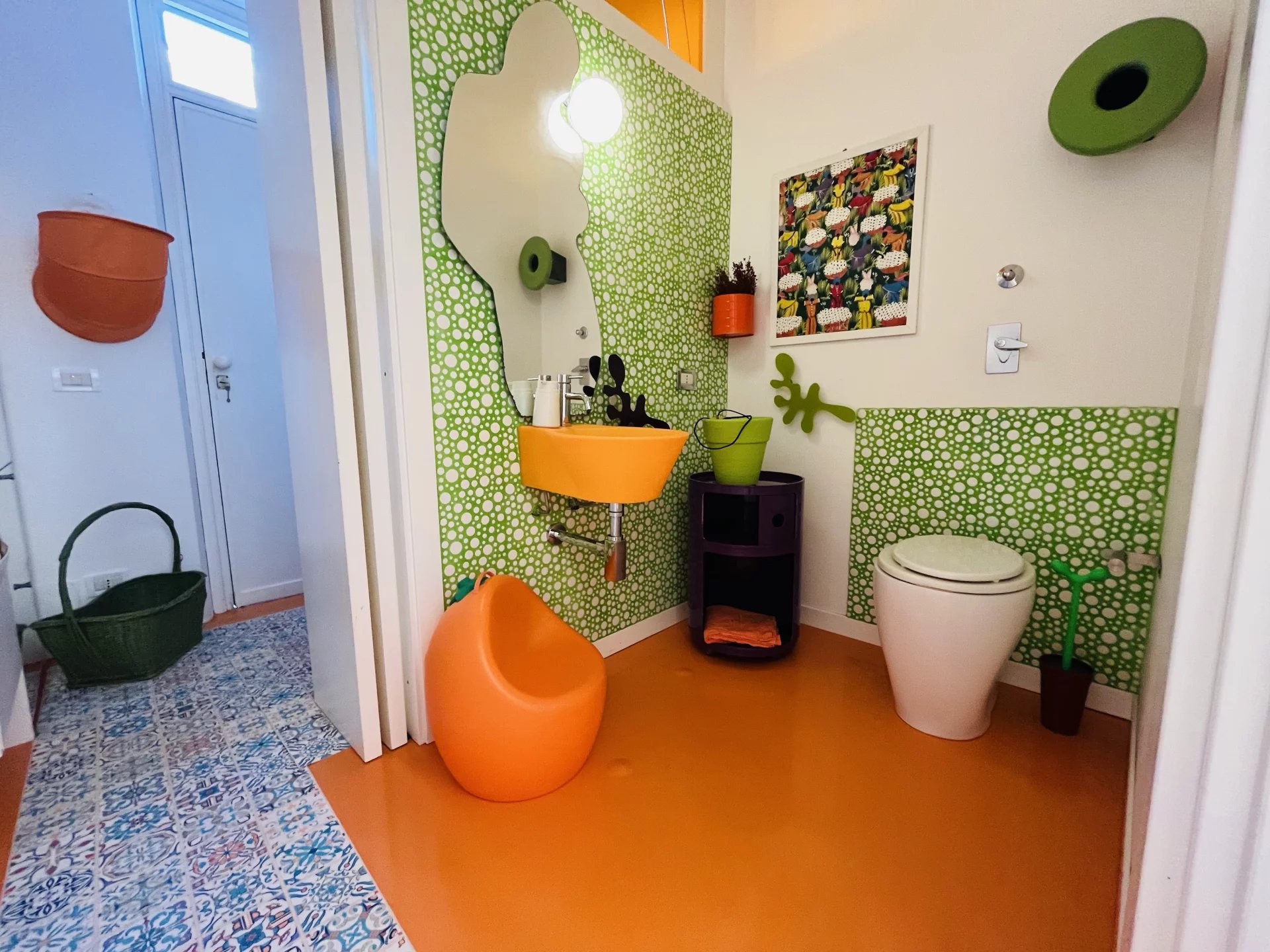 Beyond this you come to a guest room, with a large double bunk bed and an en-suite bathroom in mustard yellow, and a utility room with a WC.