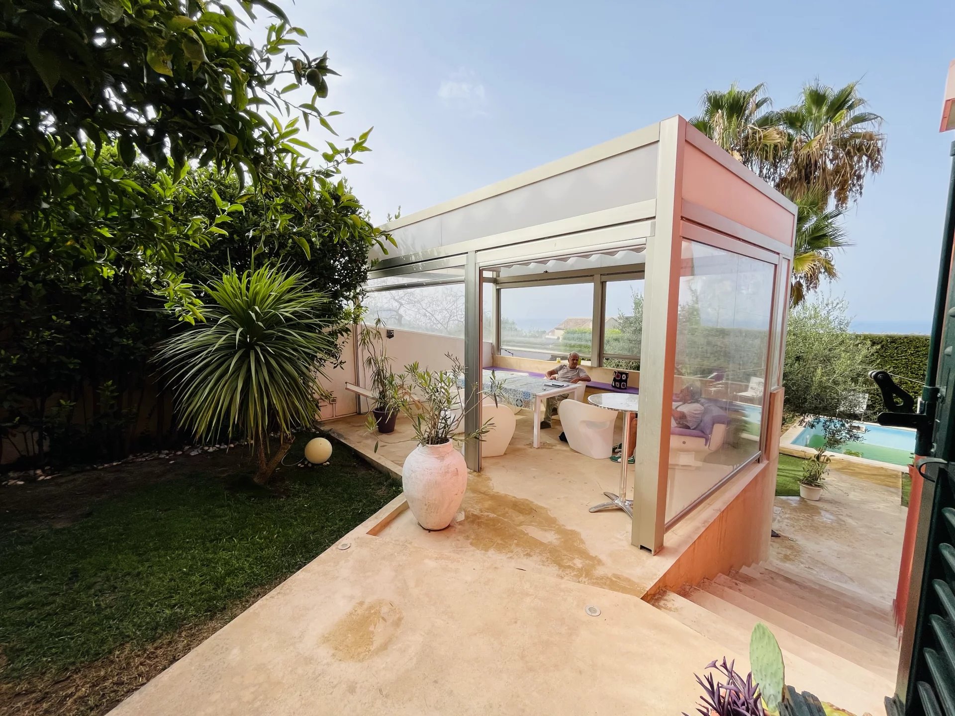 The perfectly maintained garden of this sea-view Sicilian villa offers another 480m2 of space, capped by the 12m pool, with its inviting deck area. Higher up, this outdoor space has been artfully planted with a verdant lawn and ornamental olive trees. Lastly, you'll find a picturesque covered terrace, where the glazed superstructure lets you spend your afternoons or evenings even in Sicily's short winter months.