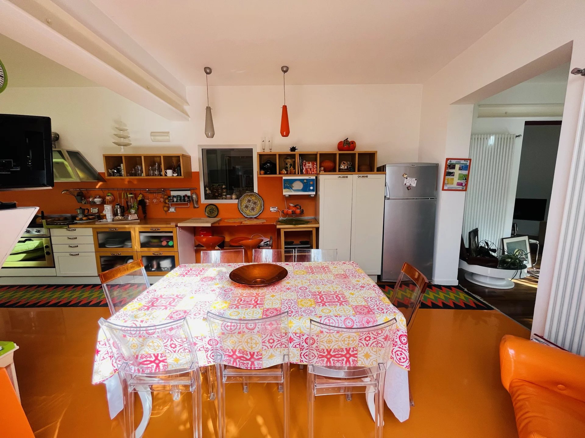 Links vom Eingang befindet sich die sehr große Küche. Sehr charakteristisch ist die orange Farbe der Harze und der große Raum, in dem der Esstisch steht.