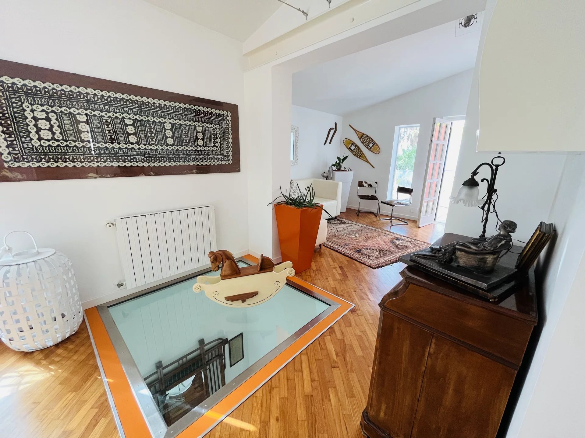 Die Villa wurde von einem bekannten lokalen Architekten entworfen und obwohl sie vor fast 20 Jahren gebaut wurde, hat sie ihren Charme bewahrt und ist immer noch modern und vor allem perfekt gepflegt. Mehrere Designelemente zeichnen diese Immobilie aus: Die orangefarbenen Harze, die halbgewendelte Treppe, das bodentiefe Fenster im ersten Stock, durch das man nach unten sehen kann, das große Badezimmer mit Dusche und Jacuzzi, die Außenterrasse und der Swimmingpool verleihen der Immobilie einen ganz eigenen Charakter.