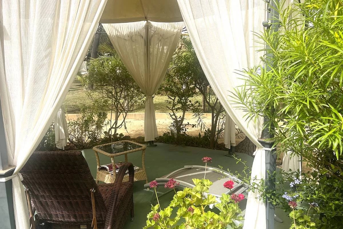 To the rear of the building, along a tree-lined avenue, you can sunbathe and relax in the outdoor pool and pamper yourself in the jacuzzi corner. Ample gazebos offer poolside shade with a huge array of high-quality outdoor furniture, and the Arabian Villa has the best position of all, right at poolside. In a permanent gazebo you will find a little fitness centre equipped with a full gym for guests' use.