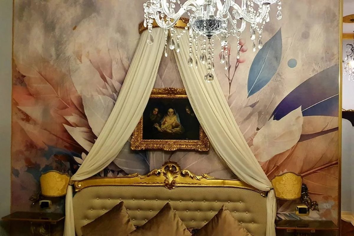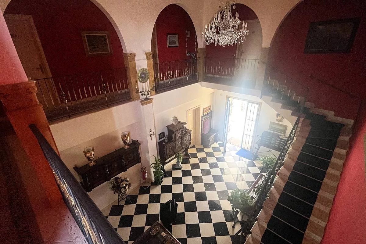 The main hallway is a double-height atrium with a stunning chequerboard floor in black and white marble. The walls are in deep red, and the grandiose interior is perfectly accented with carved hardwood furnishings, ornate chandeliers and handmade Arabian rugs.