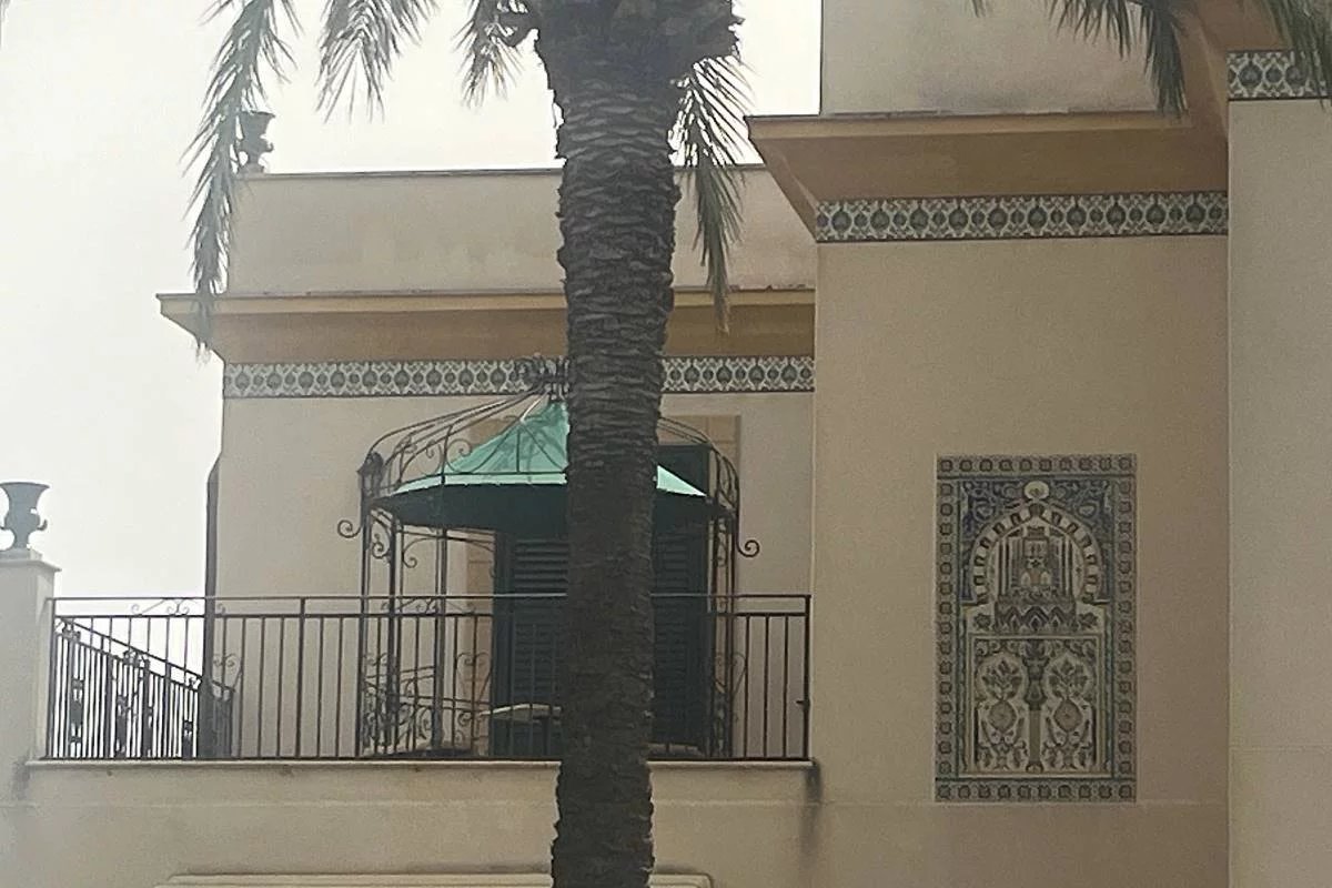 The building is a beautiful design, in white with yellow accents. A broad porch with a Romanesque arch frames the front door, at the end of a fabulous straight driveway with palms and flowering shrubs on either side.
