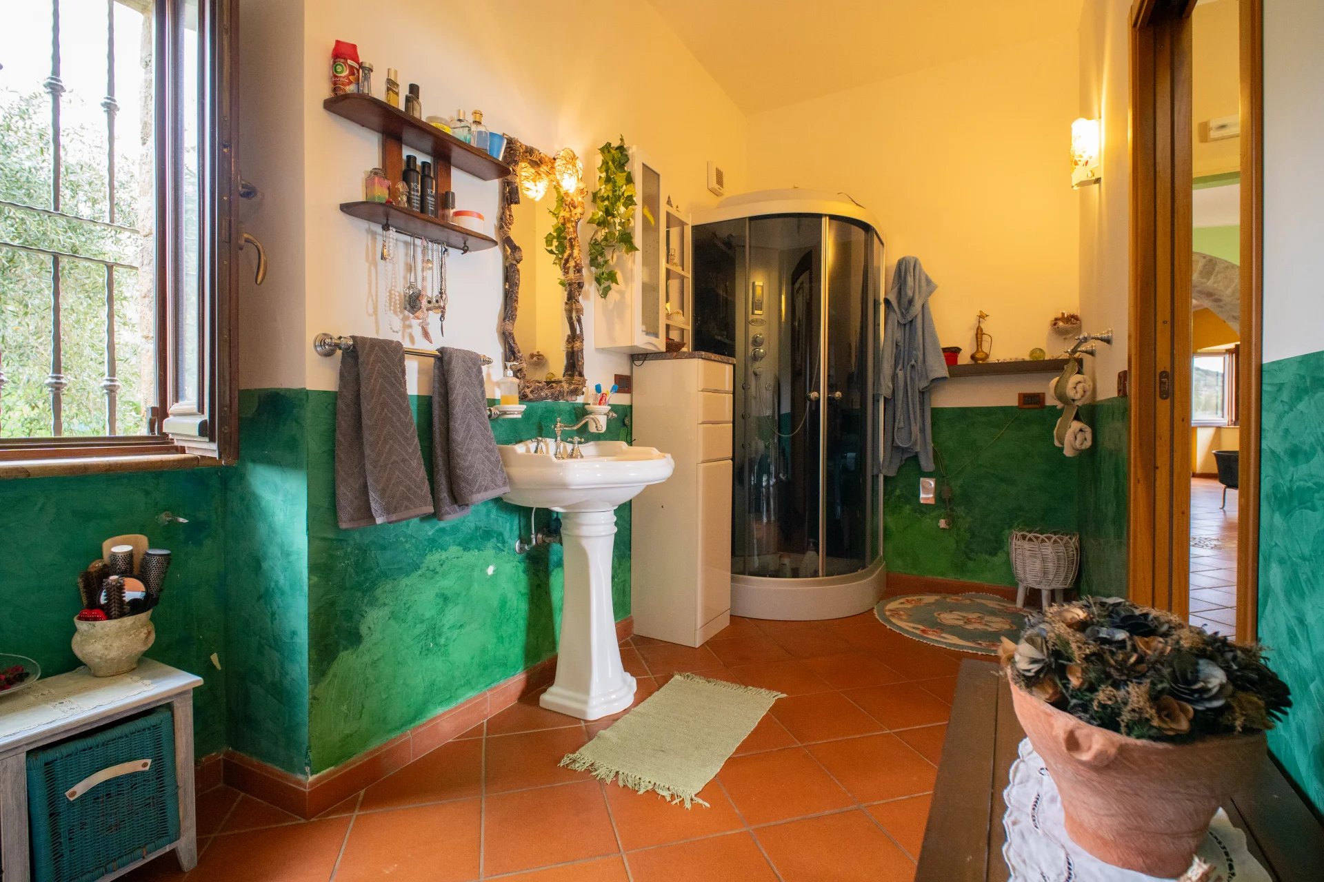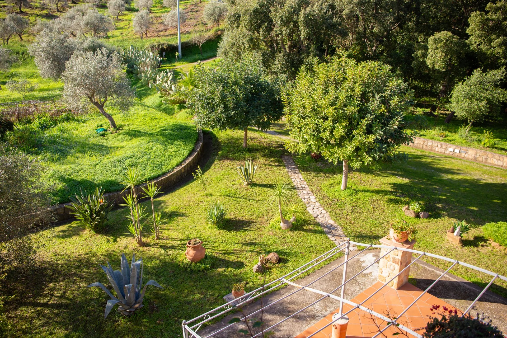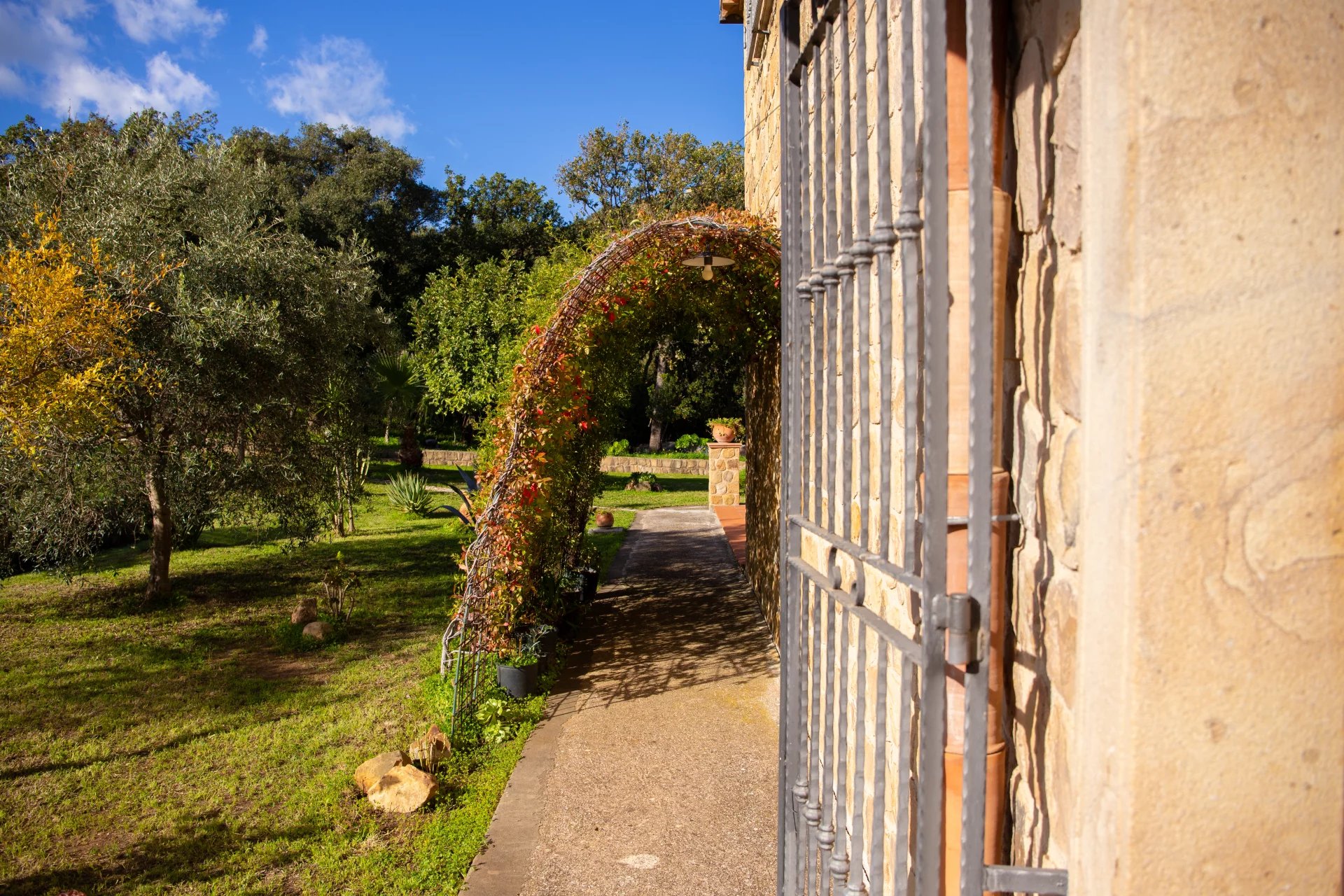 Das 20.000 Quadratmeter große Grundstück verfügt über etwa 170 ausgewachsene Olivenbäume, die jährlich 400 bis 600 Liter hochwertiges Bio-Öl produzieren, sowie über zahlreiche Obstbäume, darunter Zitrusfrüchte, Birnen, Pflaumen, Haselnüsse und Mandeln. Eine private Bergquelle liefert unbegrenzt frisches Wasser für den Hausgebrauch und die Landwirtschaft und gewährleistet so völlige Unabhängigkeit. Zum Anwesen gehören eine 50 m² große Garage, gepflegte Gärten mit mediterraner Bepflanzung und zwei zusätzliche Gebäude, die als Gästeunterkünfte oder Ateliers genutzt werden können.